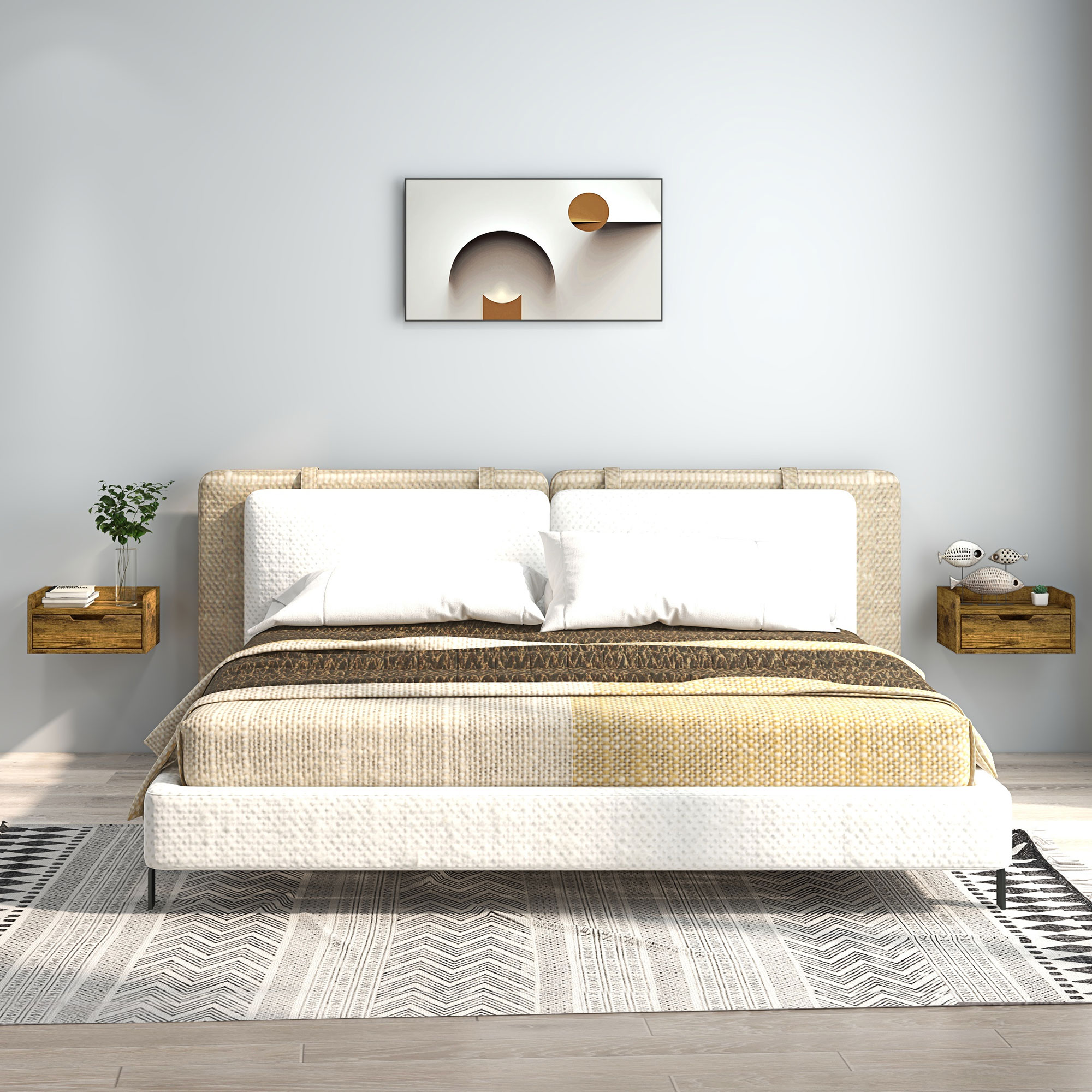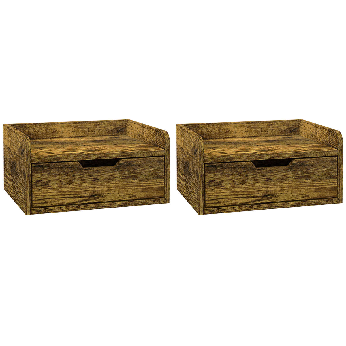 Go for classic furniture styling for bedtimes. Go for these two bedside tables. The firm particle board structures come in a modern look. Both bedside tables are floating - individually fixed to a position of your choice. With a pull-out drawer and top shelf, there is plenty of storage room for bedtime essentials, a clock and lamp. Package comes as a set of two.