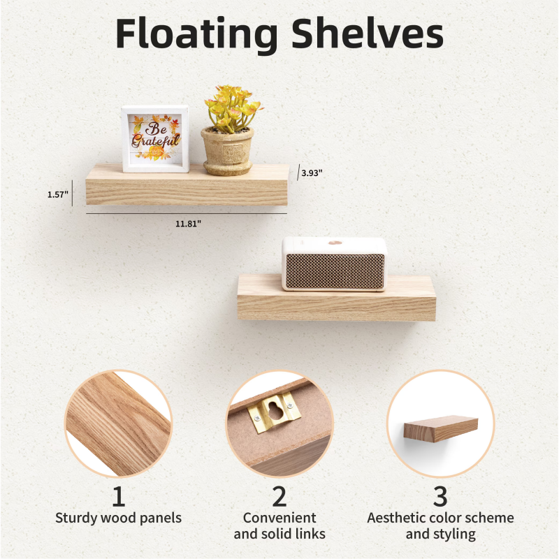 Maximize Your Space: Take advantage of storage without occupying additional floor space. These shelves help reduce clutter and emphasize wall decor, making them perfect for smaller areas. Our Floating Wall Shelves offer innovative storage options for homes of any style, studio apartments, mantels, or vacant walls. Use them to enhance bedroom decor, living room aesthetics, bathroom sets, or wall decor in the bathroom.