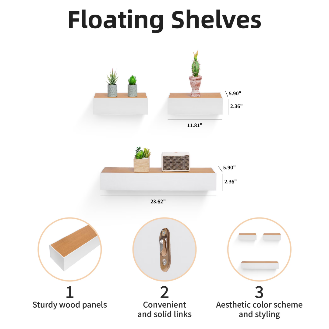 Maximize Your Space: Take advantage of storage without occupying additional floor space. These shelves help reduce clutter and emphasize wall decor, making them perfect for smaller areas. Our Floating Wall Shelves offer innovative storage options for homes of any style, studio apartments, mantels, or vacant walls. Use them to enhance bedroom decor, living room aesthetics, bathroom sets, or wall decor in the bathroom.