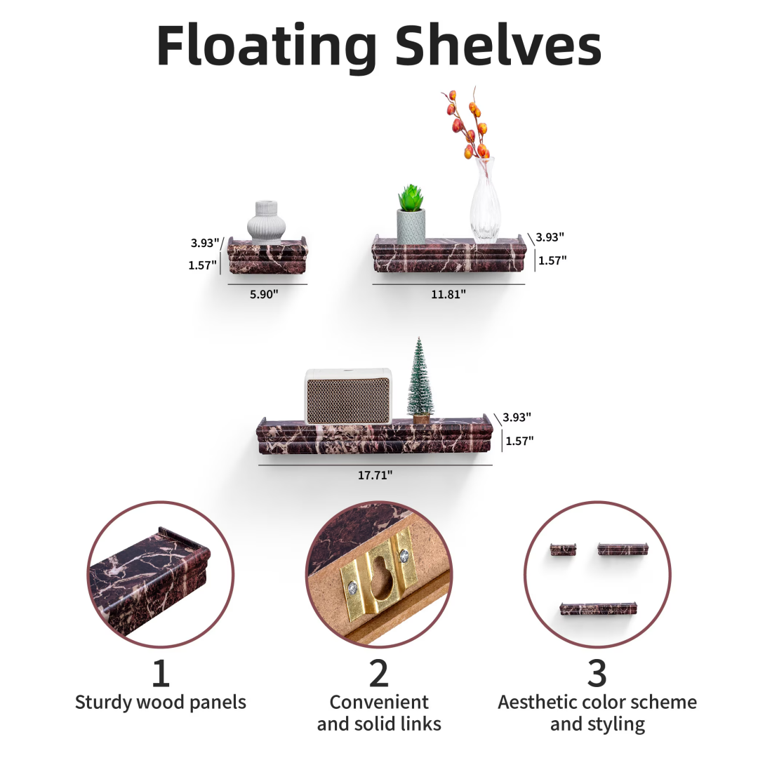 Maximize Your Space: Take advantage of storage without occupying additional floor space. These shelves help reduce clutter and emphasize wall decor, making them perfect for smaller areas. Our Floating Wall Shelves offer innovative storage options for homes of any style, studio apartments, mantels, or vacant walls. Use them to enhance bedroom decor, living room aesthetics, bathroom sets, or wall decor in the bathroom.