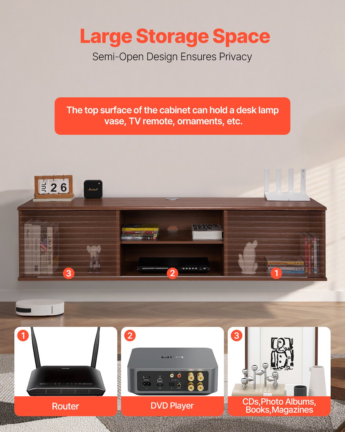 Ample Storage Space: Keep your living room neat and organized! The wall-mounted design frees up floor space and makes it easy for your robot vacuum to clean. It fits various TV sizes and has a storage cabinet for books and other essentials, plus hidden cable holes to keep things tidy. No more clutter, just a streamlined look!