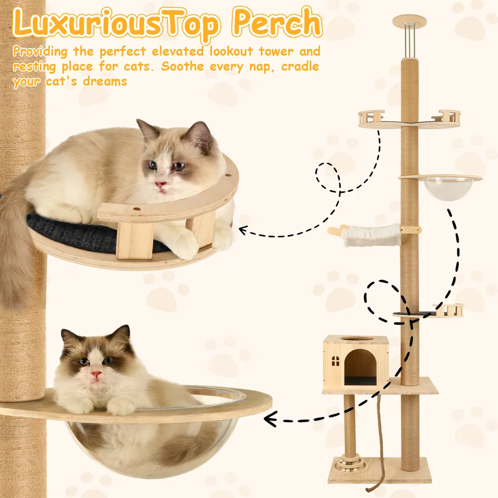 Floor to Ceiling Cat Tree, 6 Level Adjustable Height Climbing Tower with Thickened Scratching Posts, Cats Activity Center with Transparent Capsule and Cozy Hammock