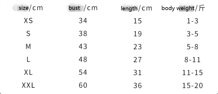 Size: XS (recommended weight 1-3 kg), S (recommended weight 3-5 kg), M (recommended weight 5-8 kg), L (recommended weight 8-11 kg), XL (recommended weight 11-15 kg ), XXL (recommended weight 15-20 kg)