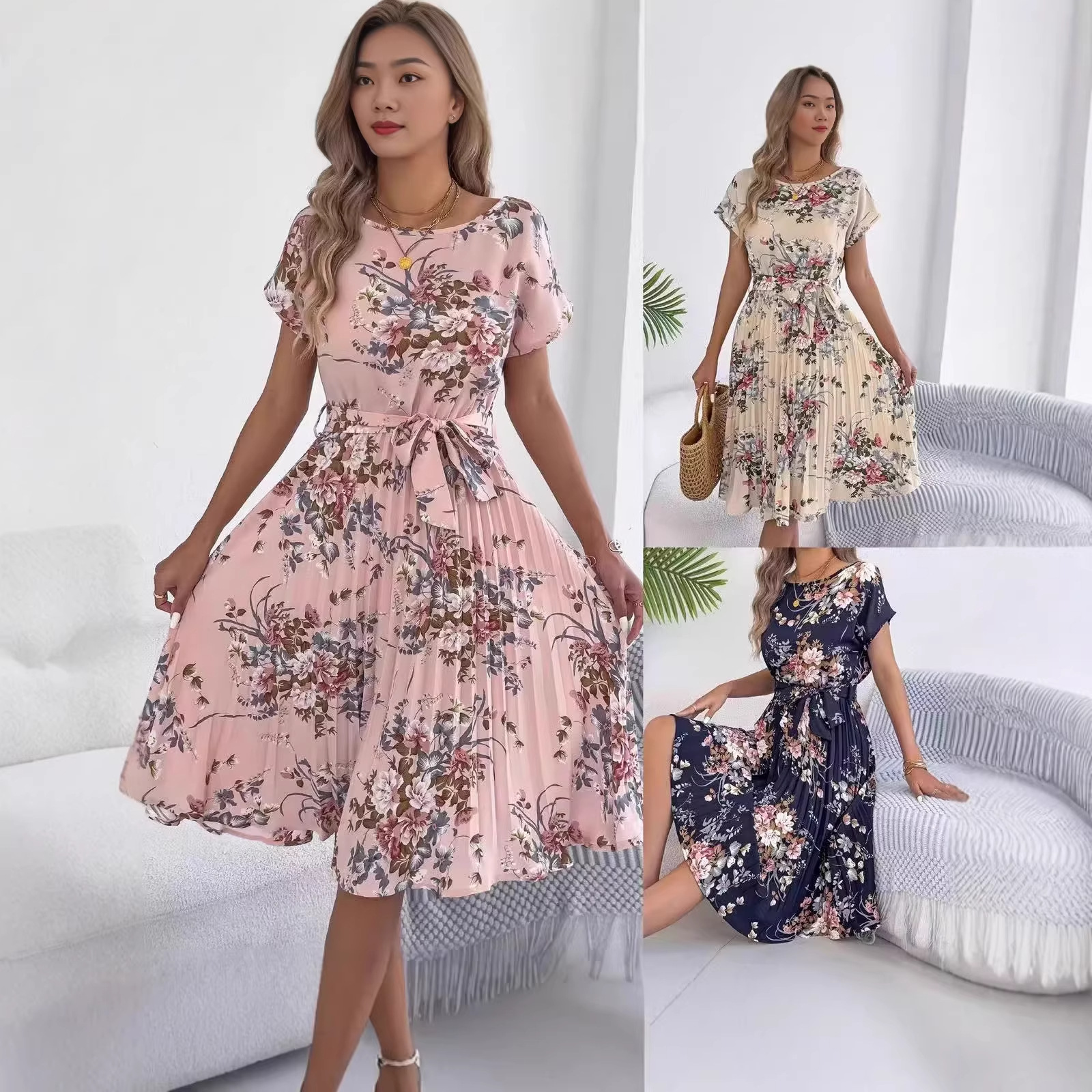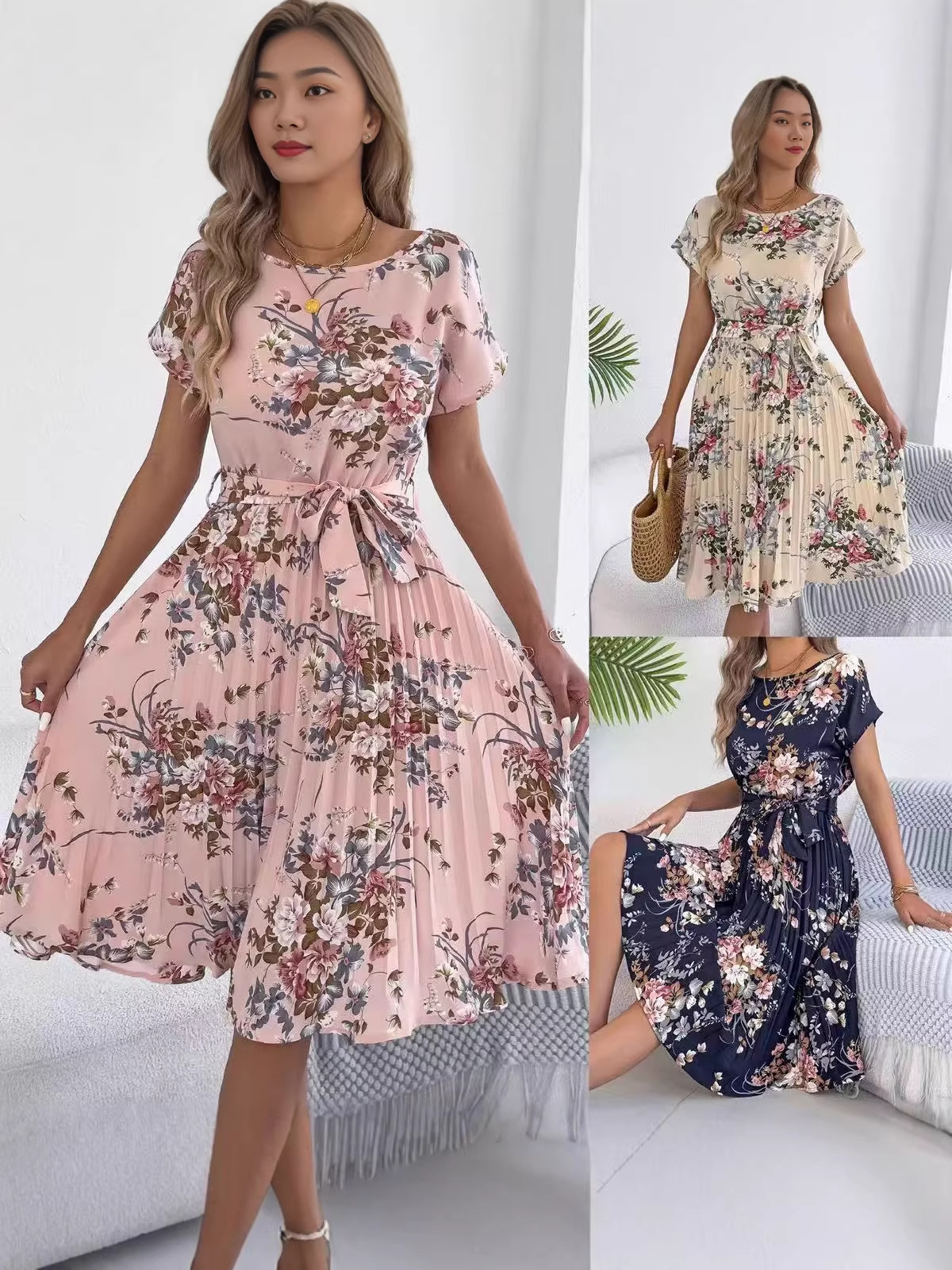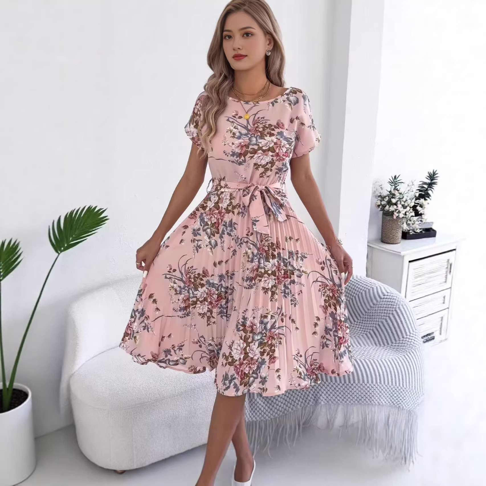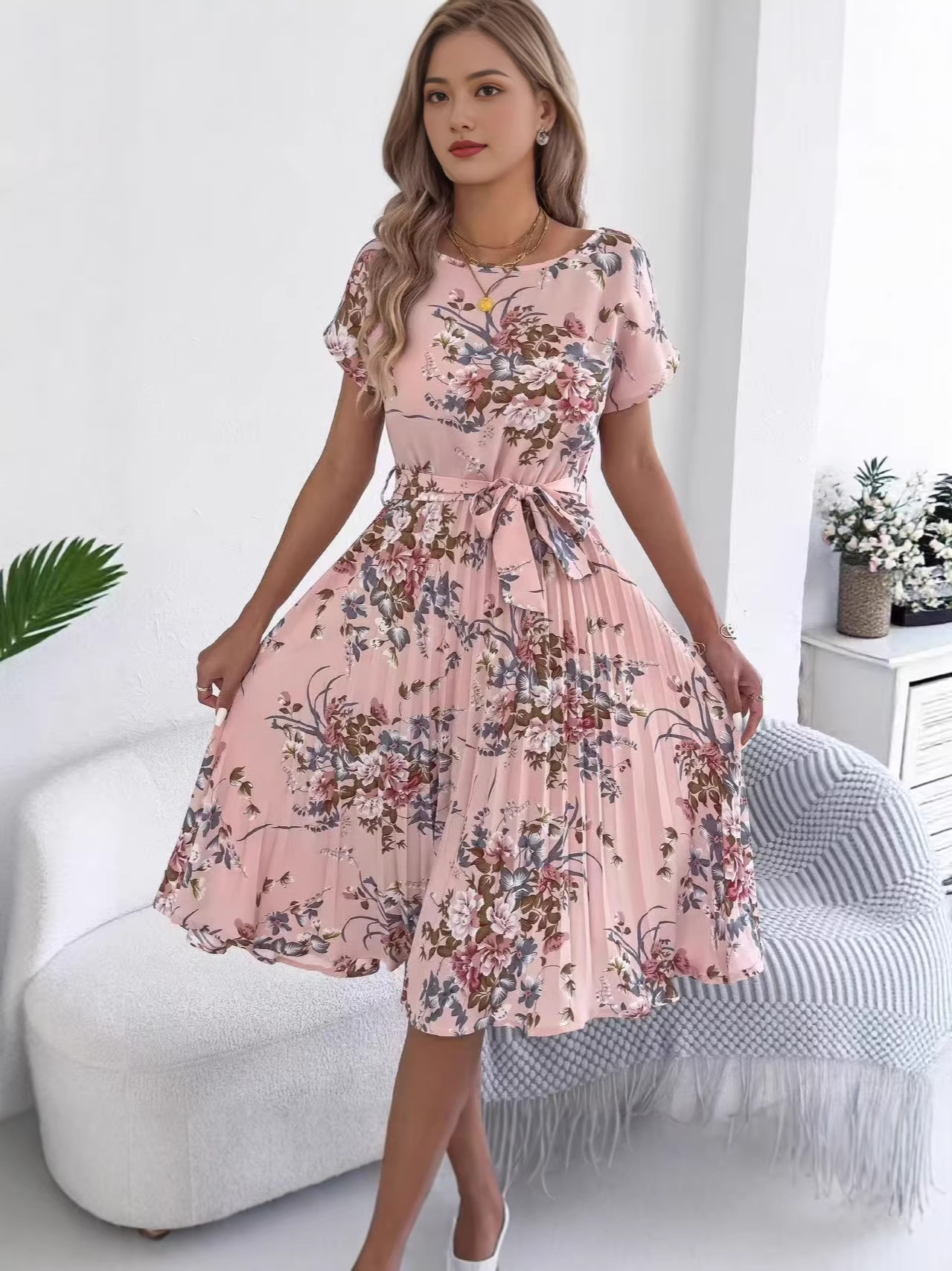 Trendy Elements: Floral Print, Pleats, Ribbon Ties