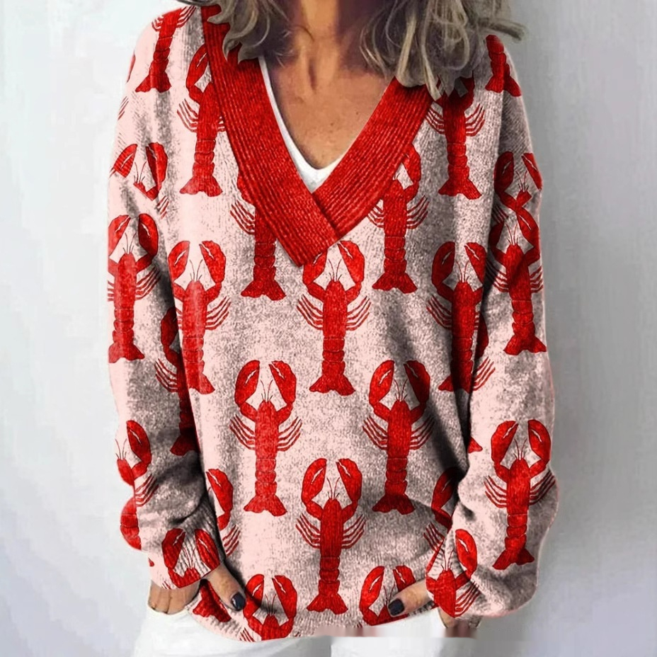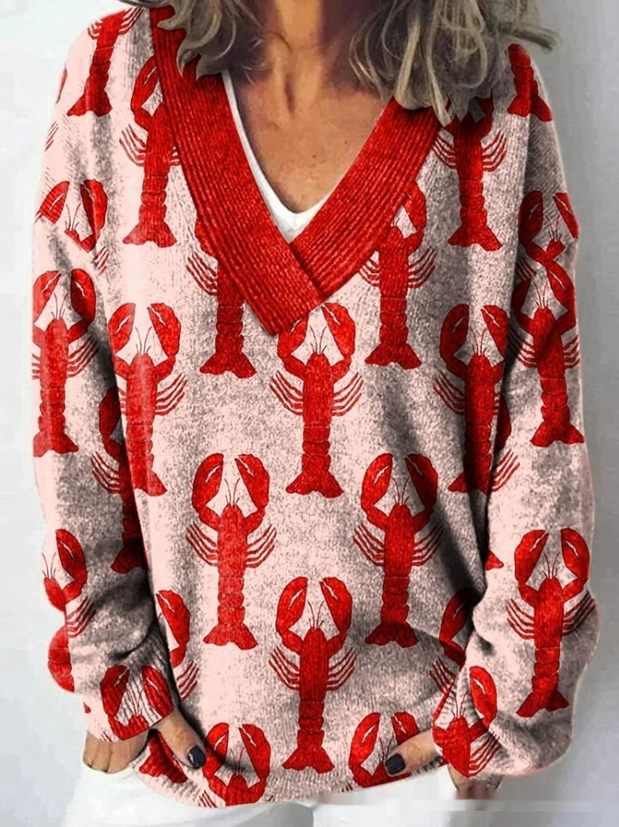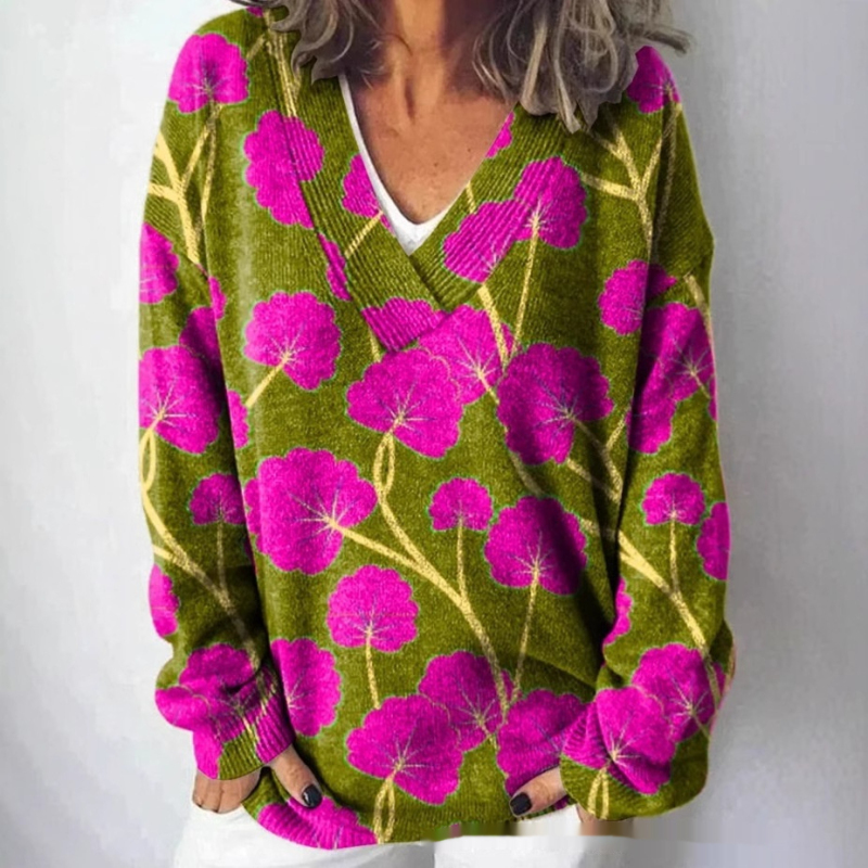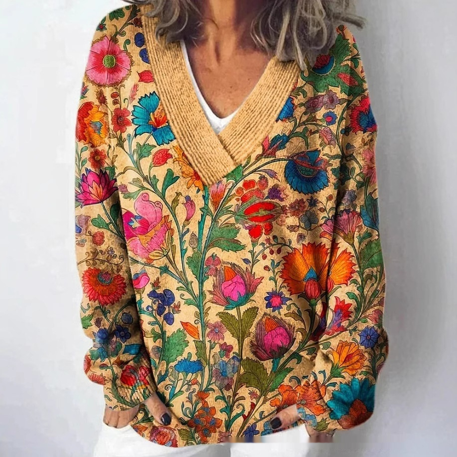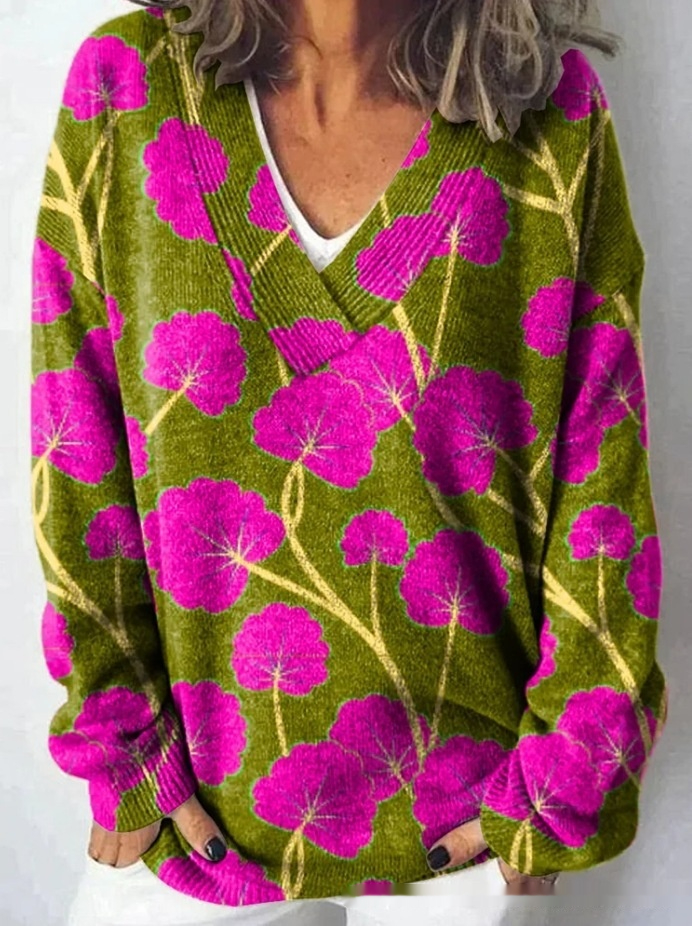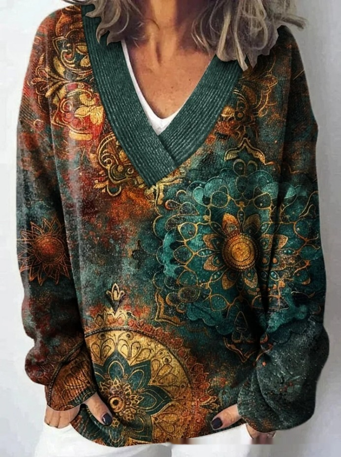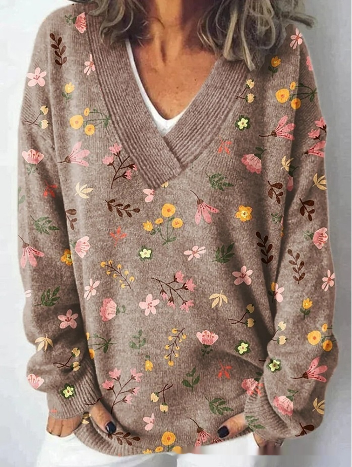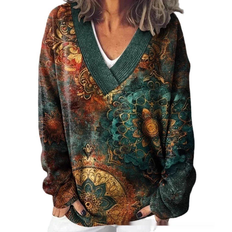 Floral Pattern Printed V-neck Long Sleeve Casual Sweatshirt