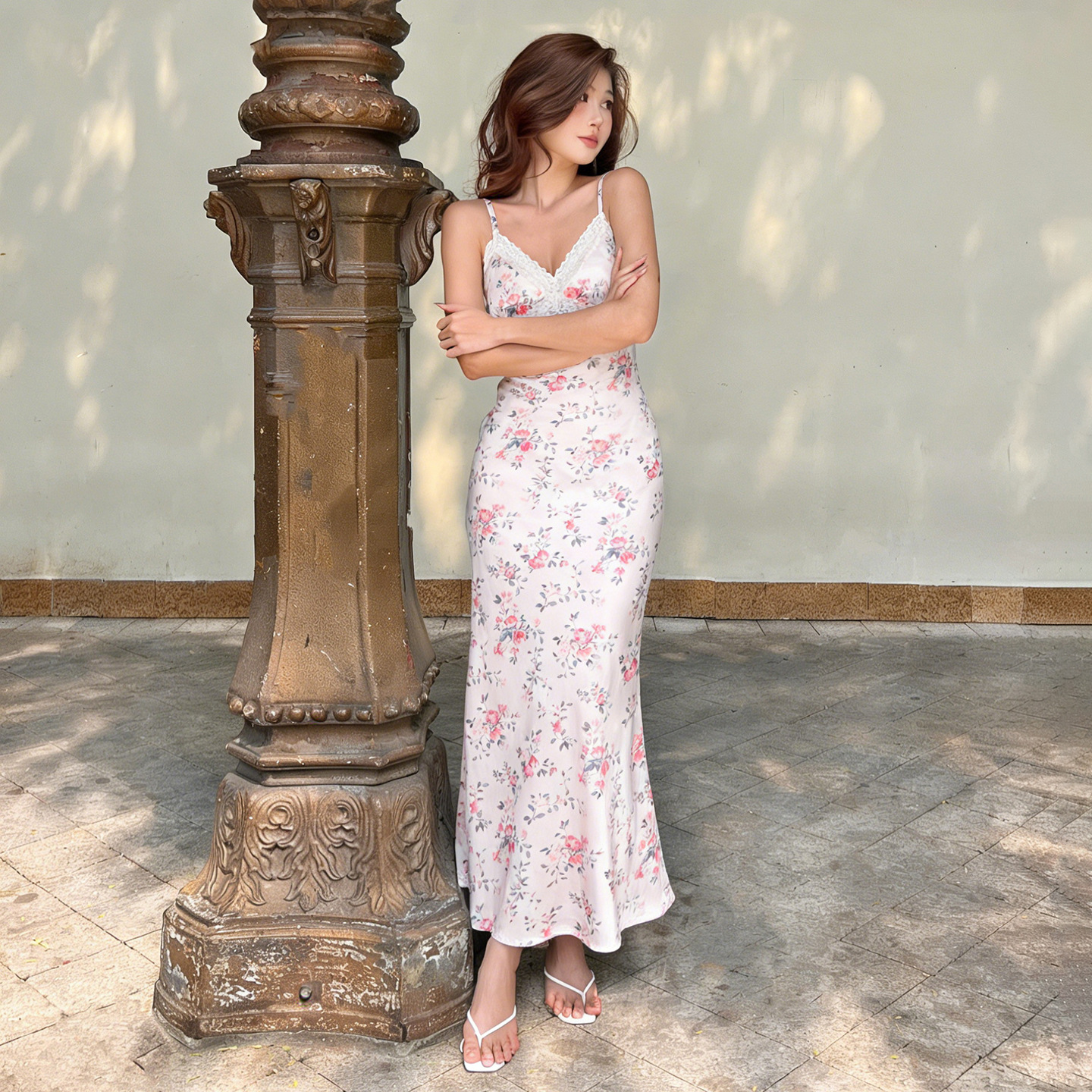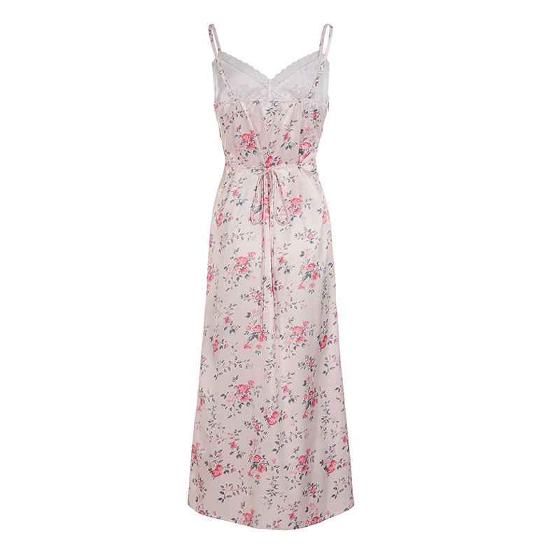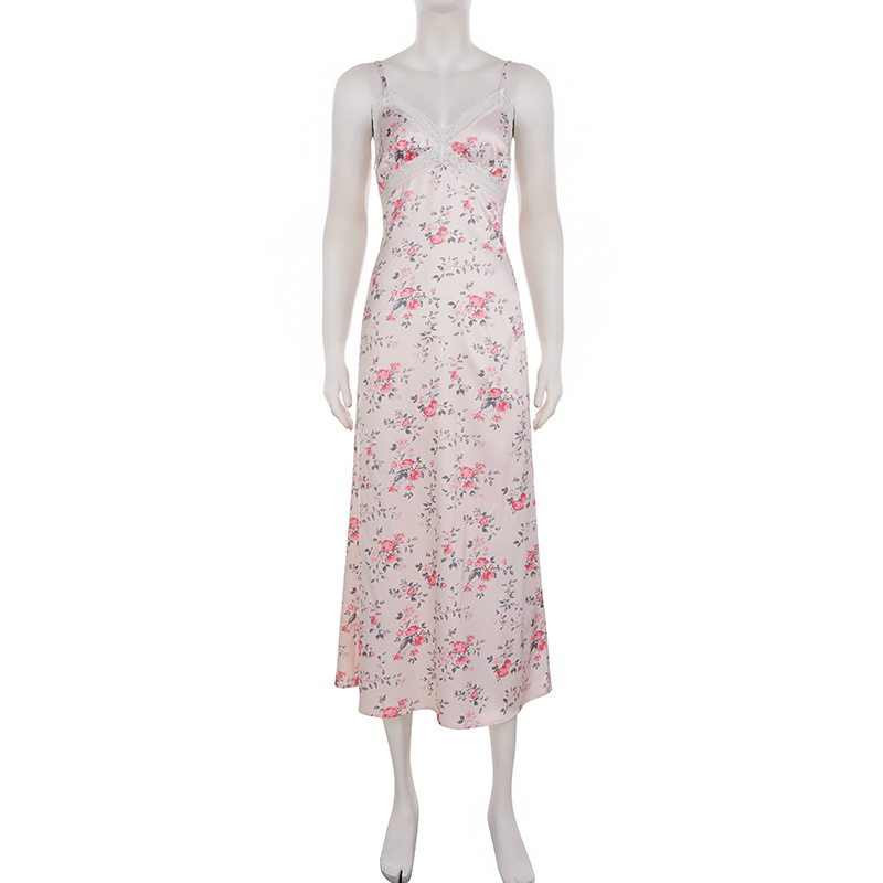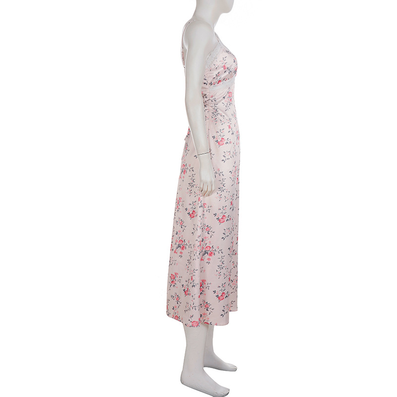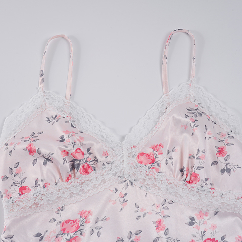 Floral-print Lace-spliced Deep V-neck Slip Dress