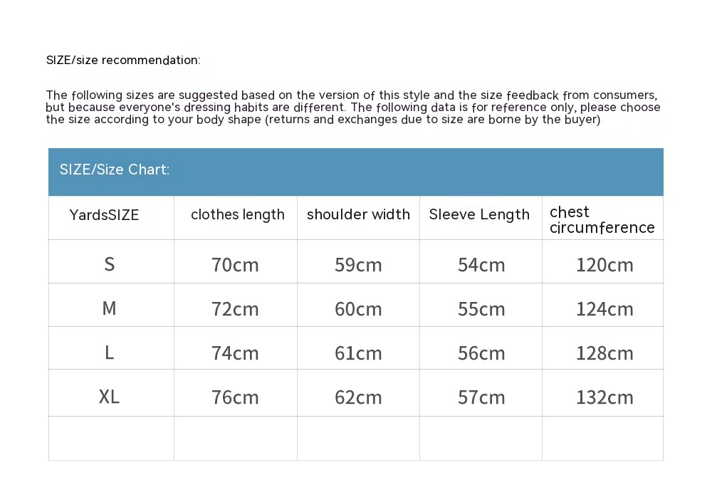 1. Asian sizes are 1 to 2 sizes smaller than European and American people. Choose the larger size if your size between two sizes. Please allow 2-3cm differences due to manual measurement. 2. Please check the size chart carefully before you buy the item, if you don't know how to choose size, please contact our customer service. 3.As you know, the different computers display colors differently, the color of the actual item may vary slightly from the following images.