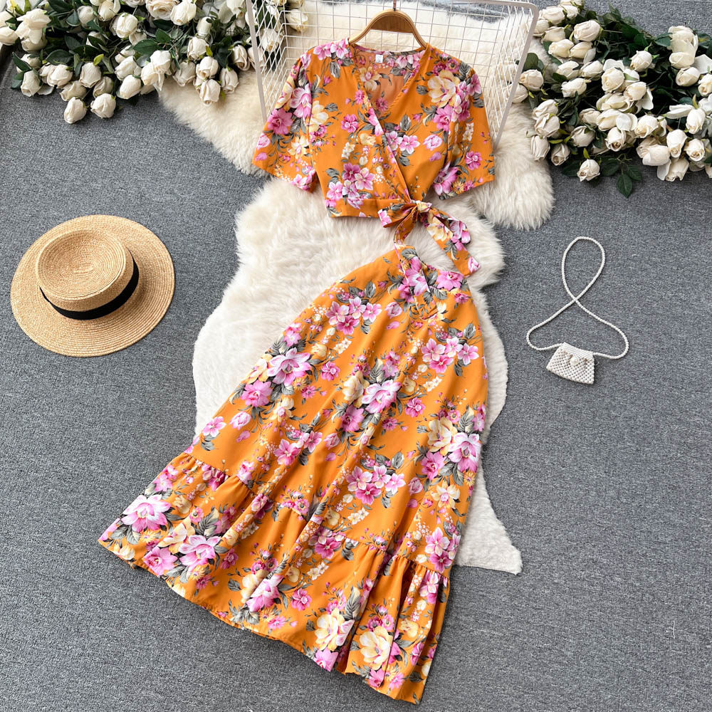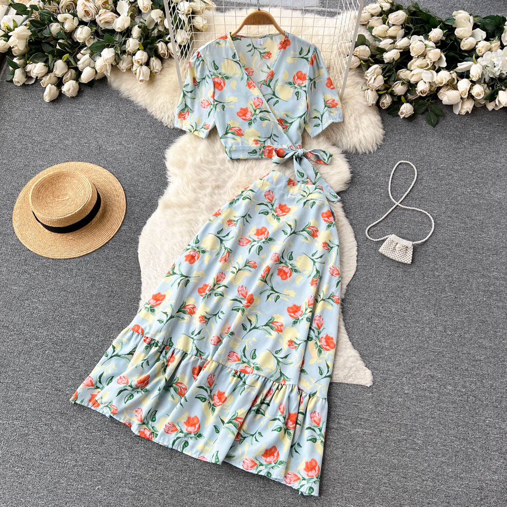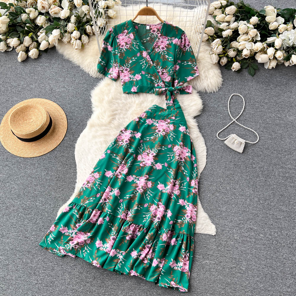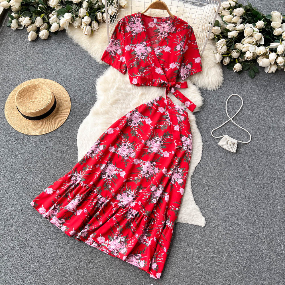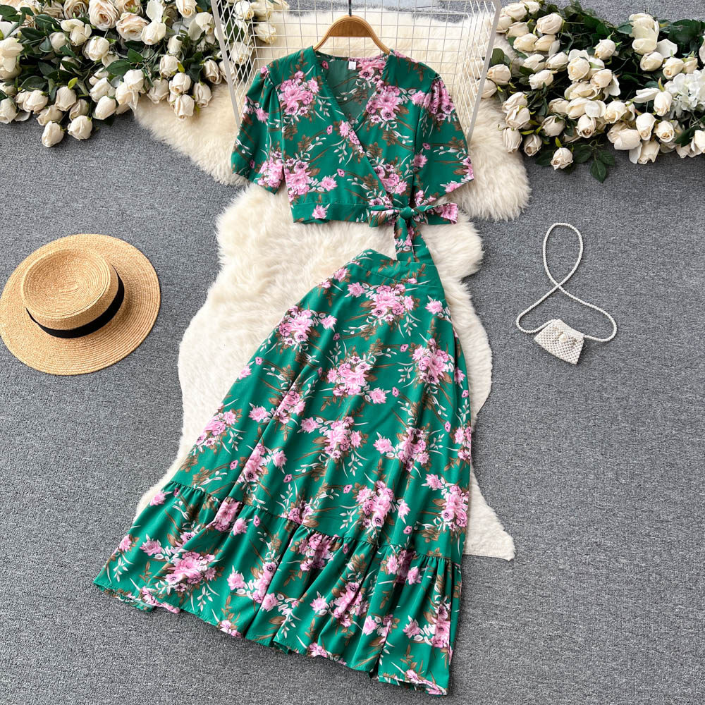 Floral Womens Cross V Neck Strap Crop Top And High Waisted Flared Skirt Two Piece Set