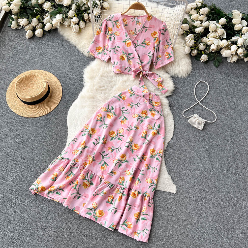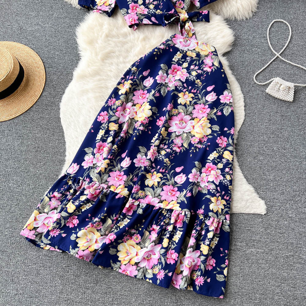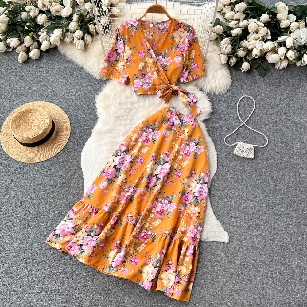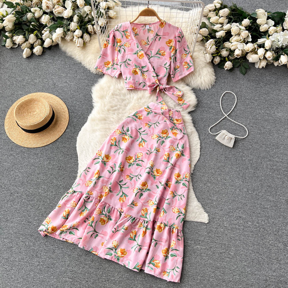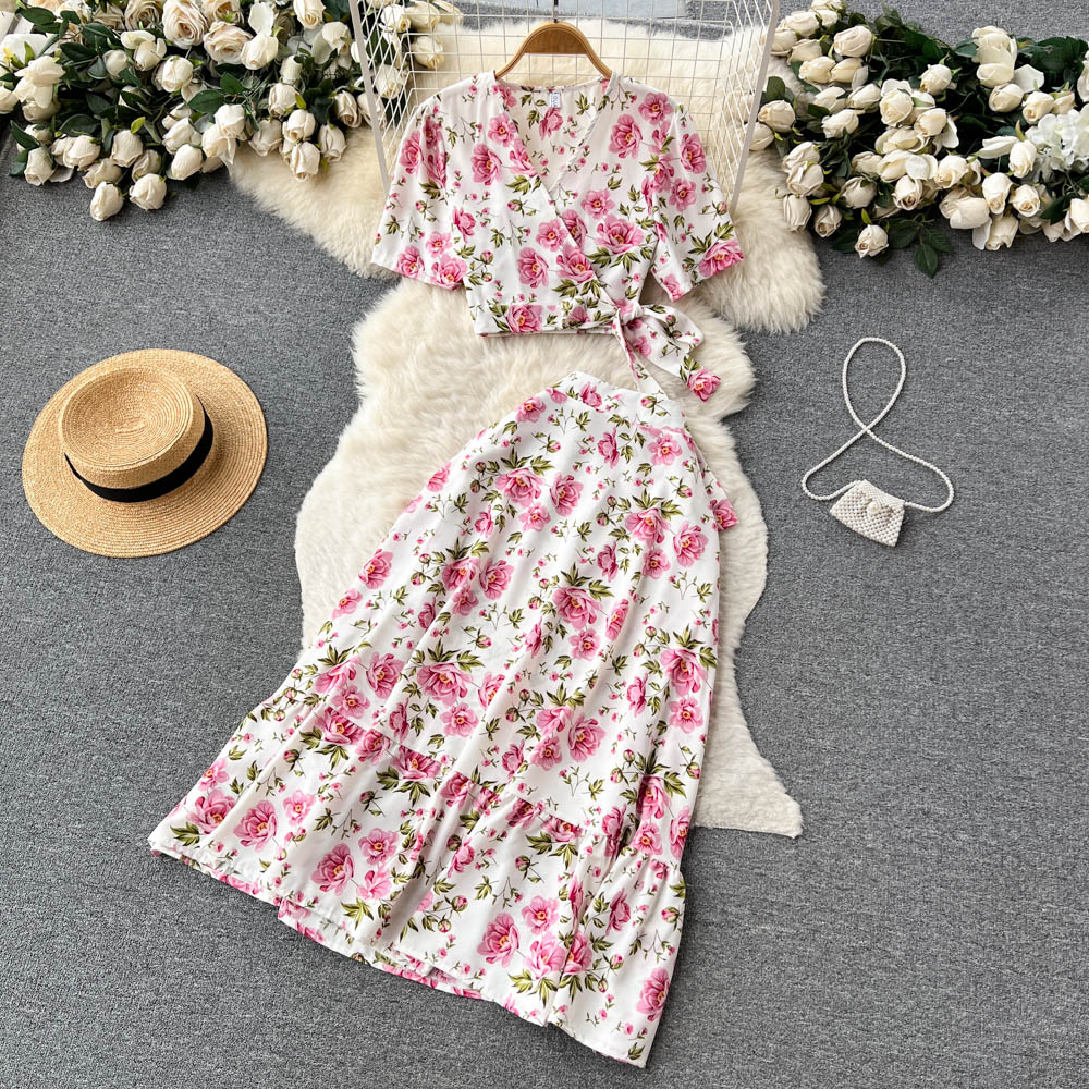 Floral Womens Cross V Neck Strap Crop Top And High Waisted Flared Skirt Two Piece Set