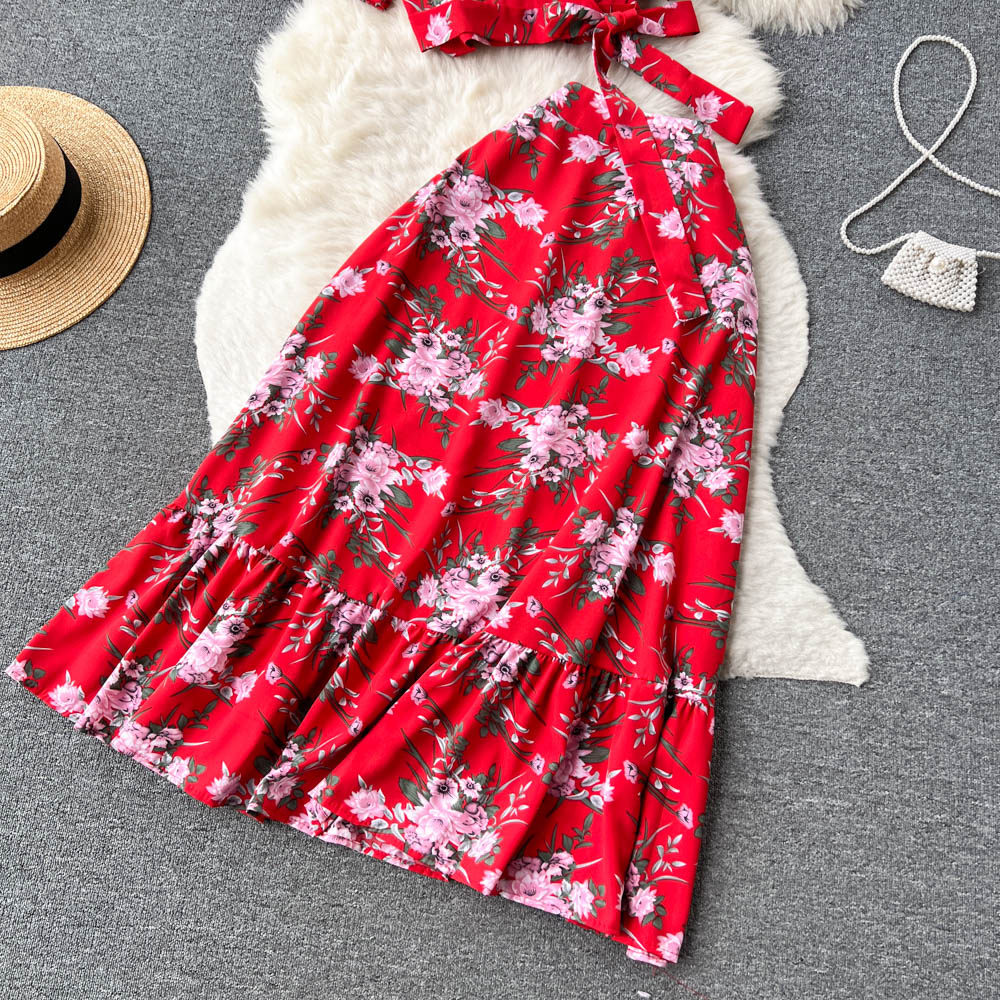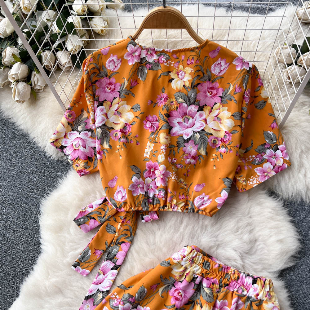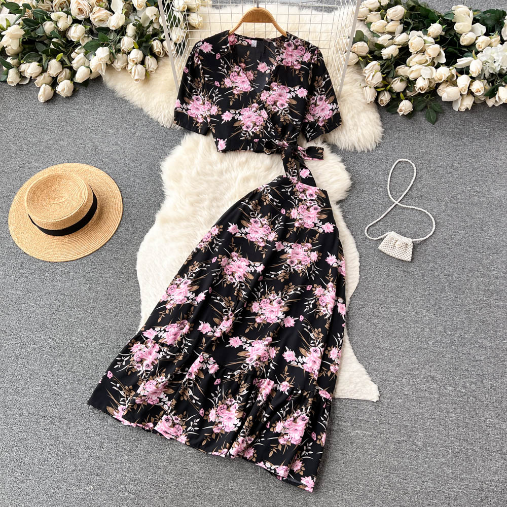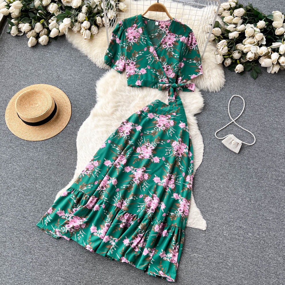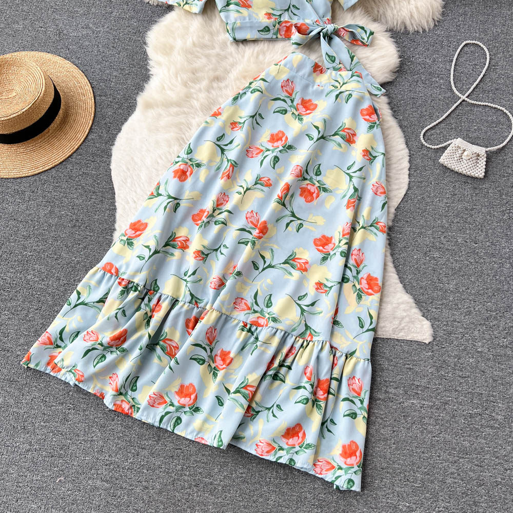 Floral Womens Cross V Neck Strap Crop Top And High Waisted Flared Skirt Two Piece Set