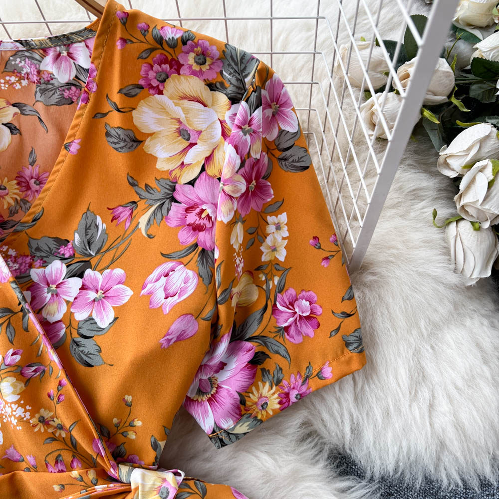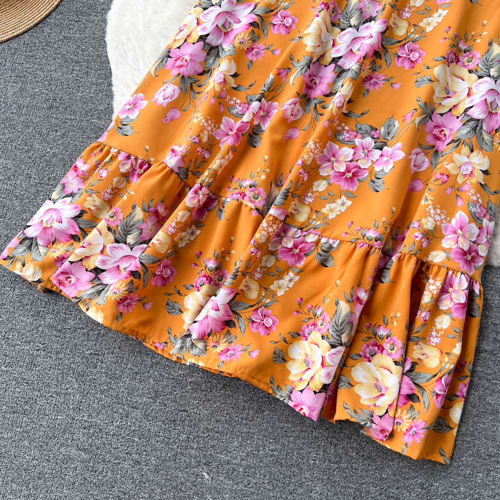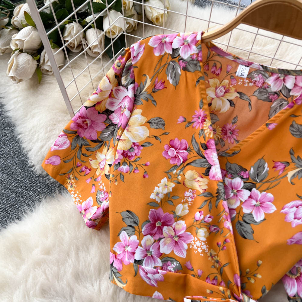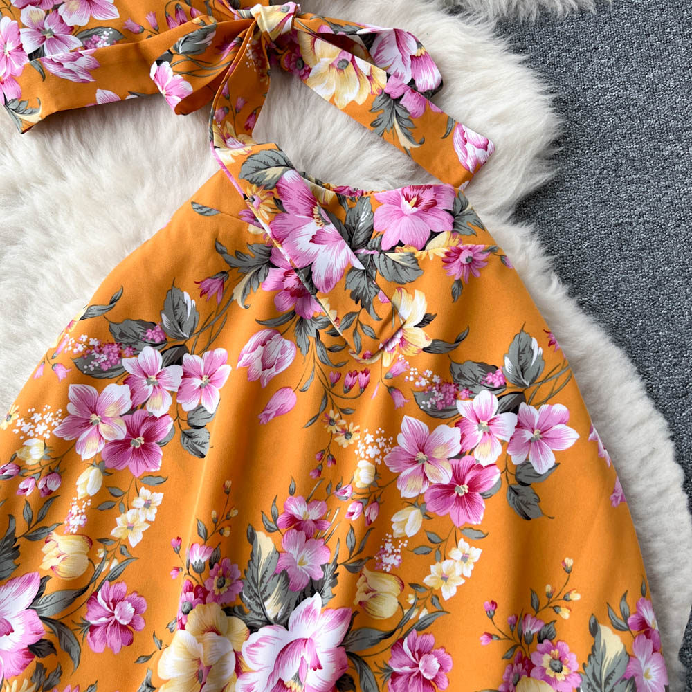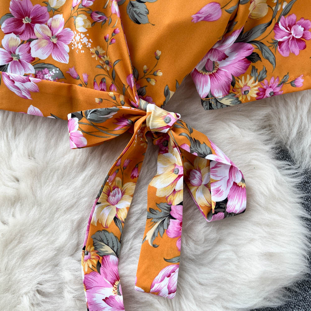Floral Womens Cross V Neck Strap Crop Top And High Waisted Flared Skirt Two Piece Set