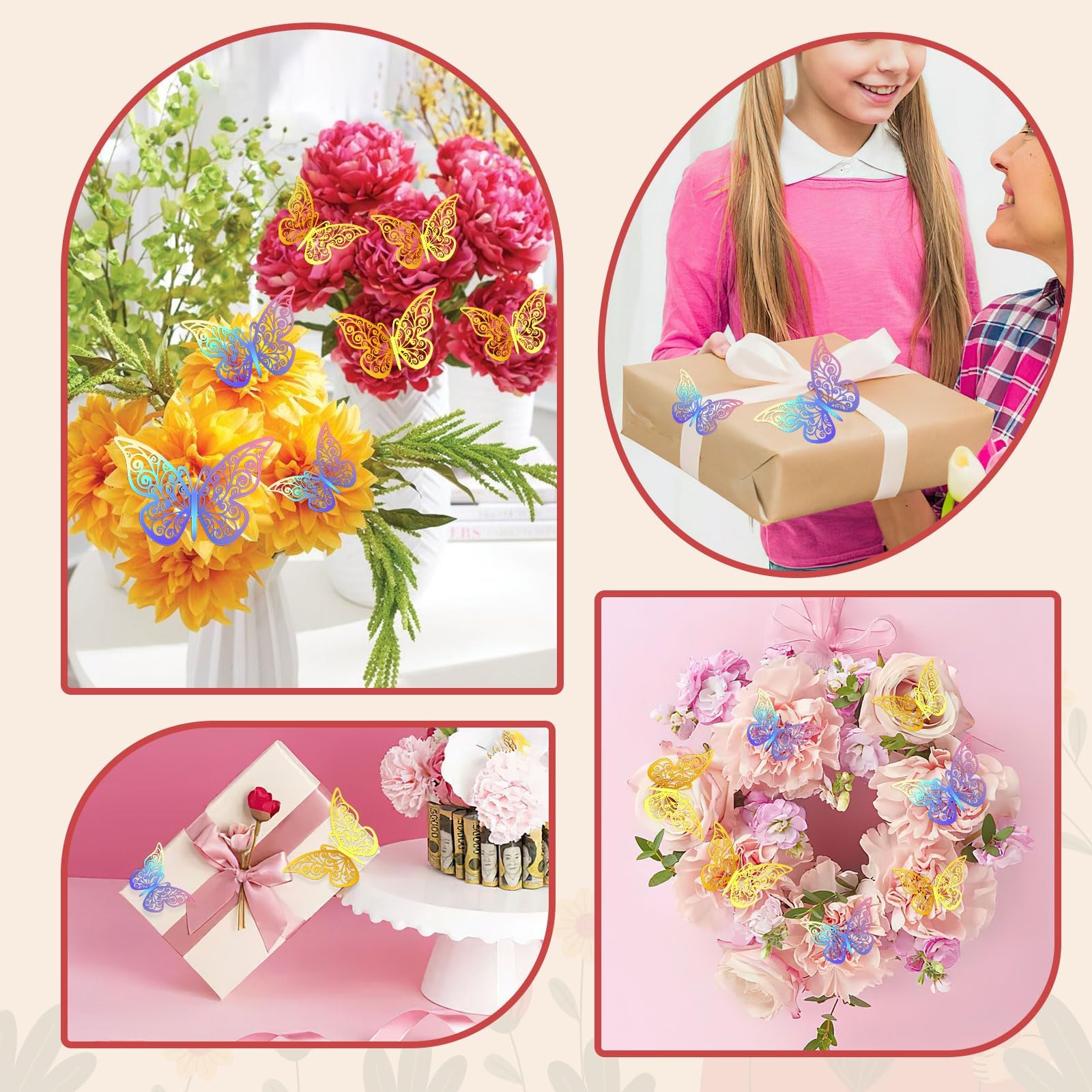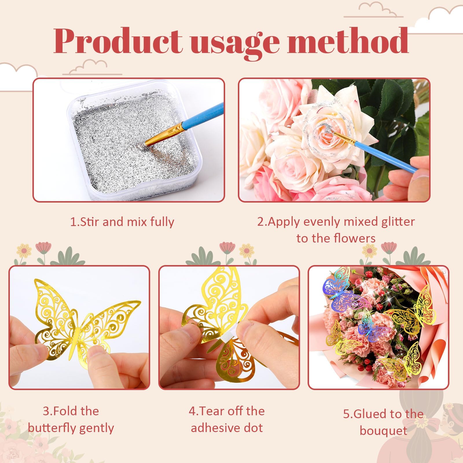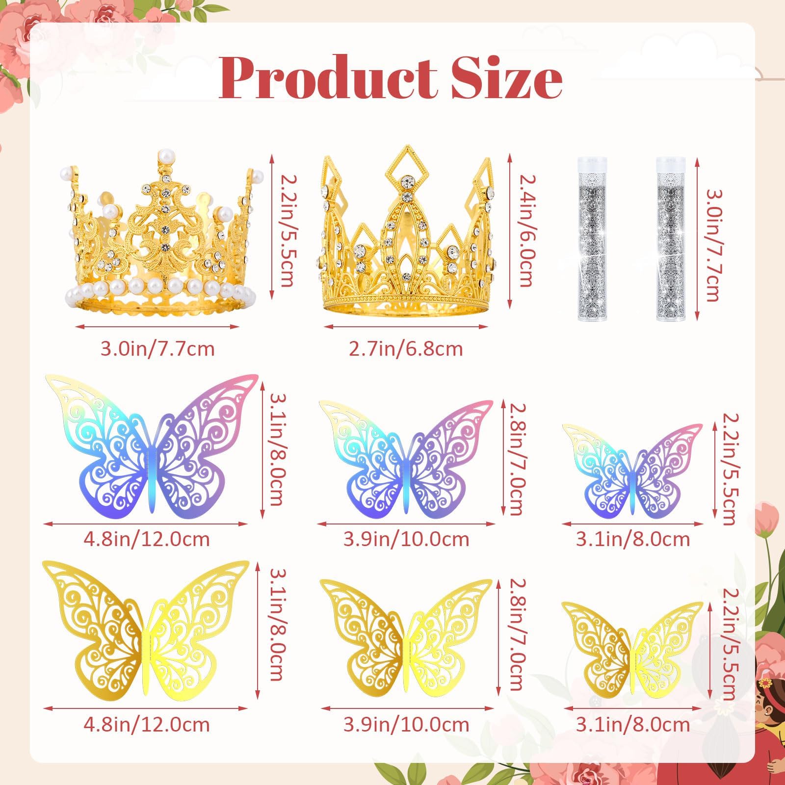 The crowns for flower bouquets set adds a gorgeous and dreamy decorative effect to your bouquet. The flower bouquet accessories set includes 2 gorgeous gold crowns, 24pcs 3D hollow butterflies (12 gold and 12 colorful), and 2 tubes of shiny silver glitter powder (6g per tube). Each bouquet accessories are carefully selected to showcase reliable quality and exquisite craftsmanship.