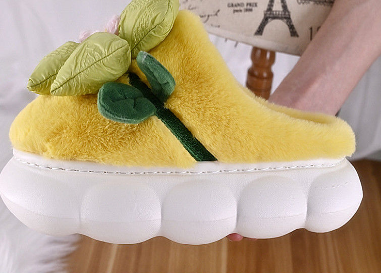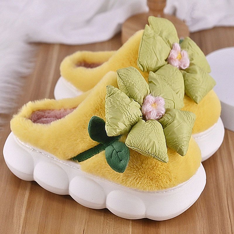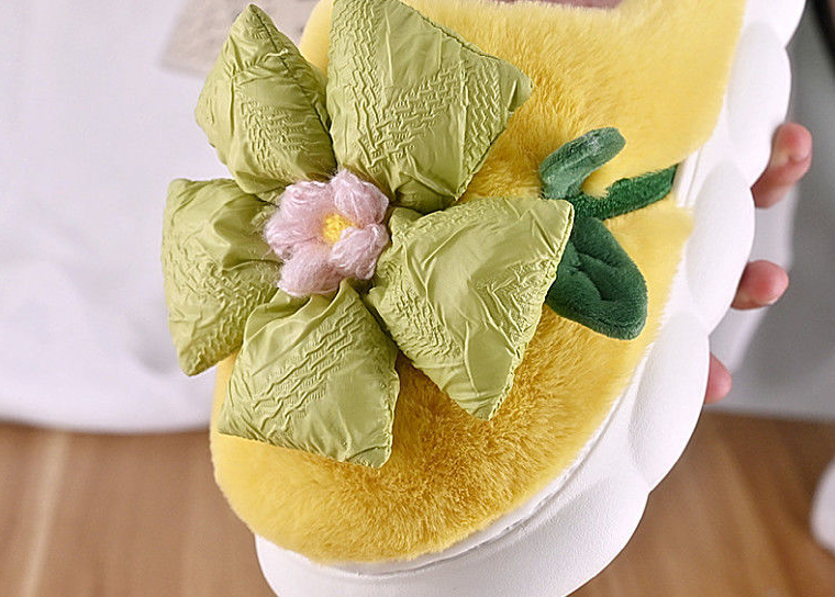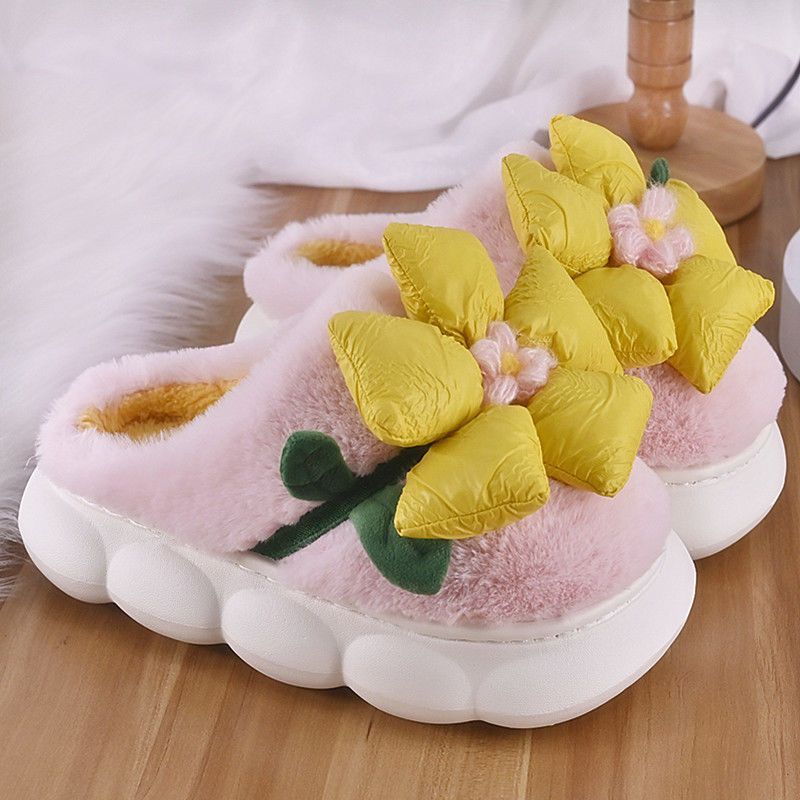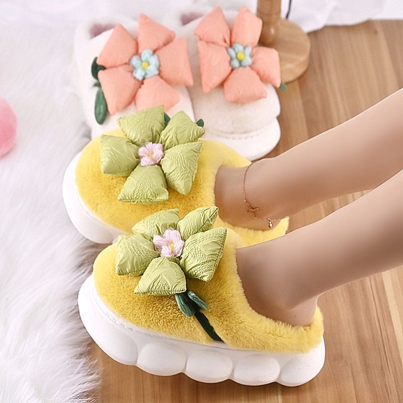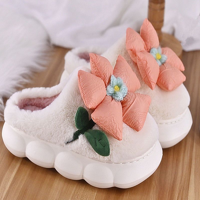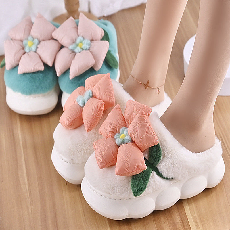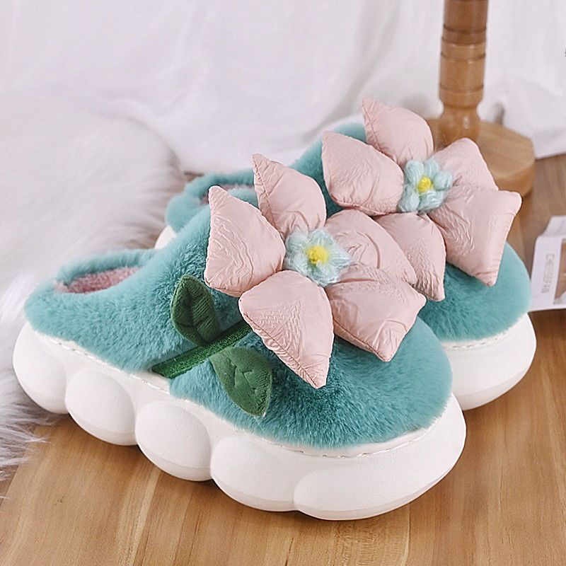 Flower Cotton Slippers With Plush Insulation And Thick Bottom Plush