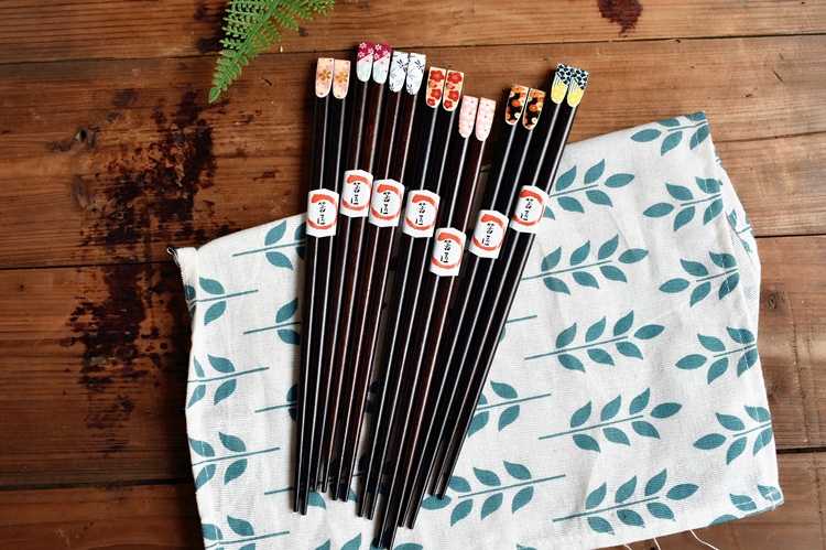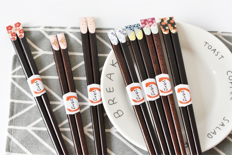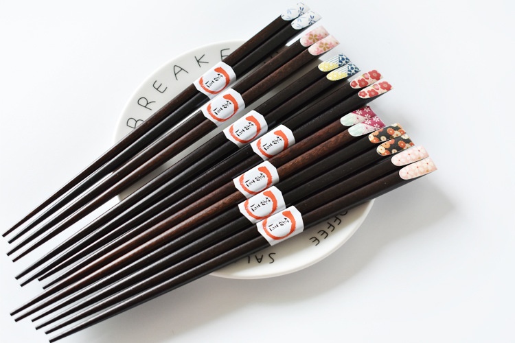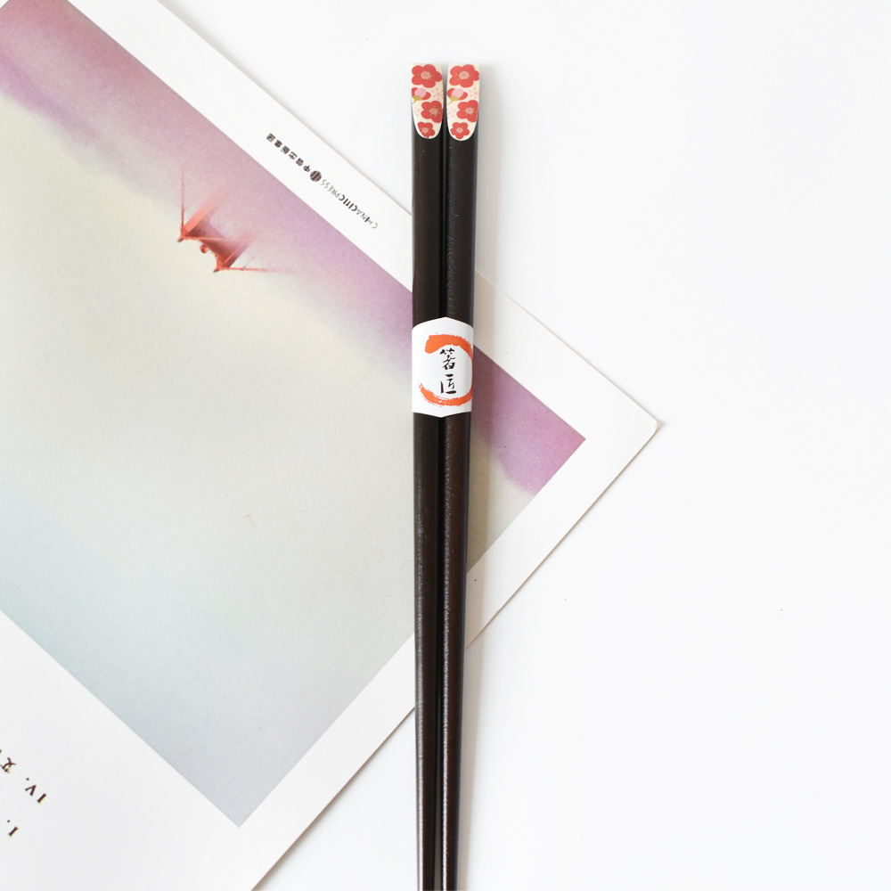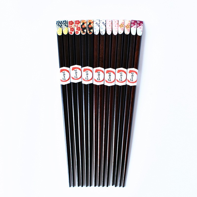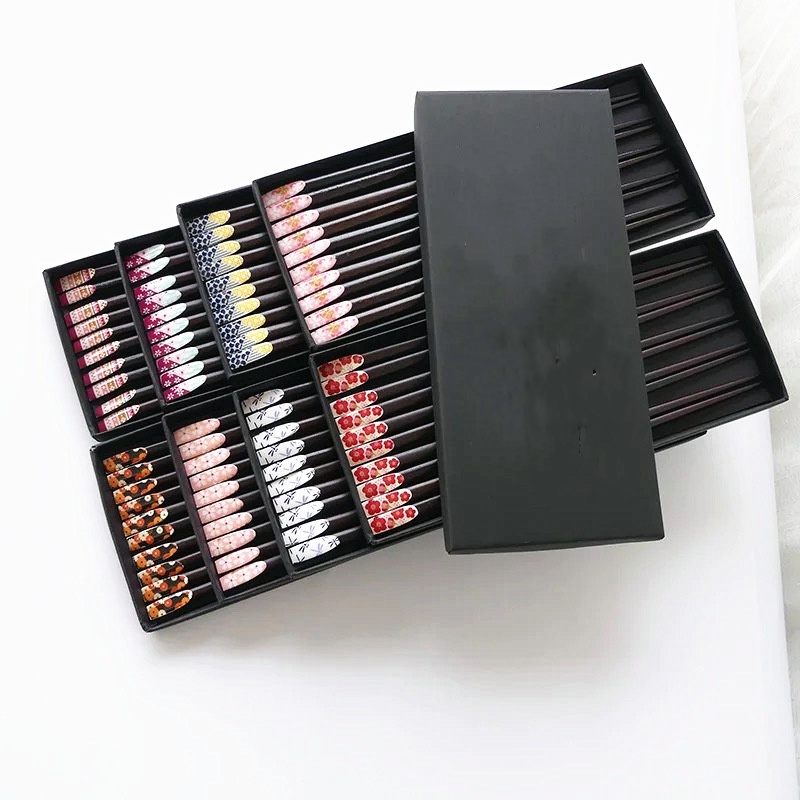 Color: red plum blossom, pink cherry blossom, yellow small flower on black background, blue dragonfly, red and green small flower, big pink cherry blossom, green and yellow dots, 5 pairs of packaging chopstick box (box)