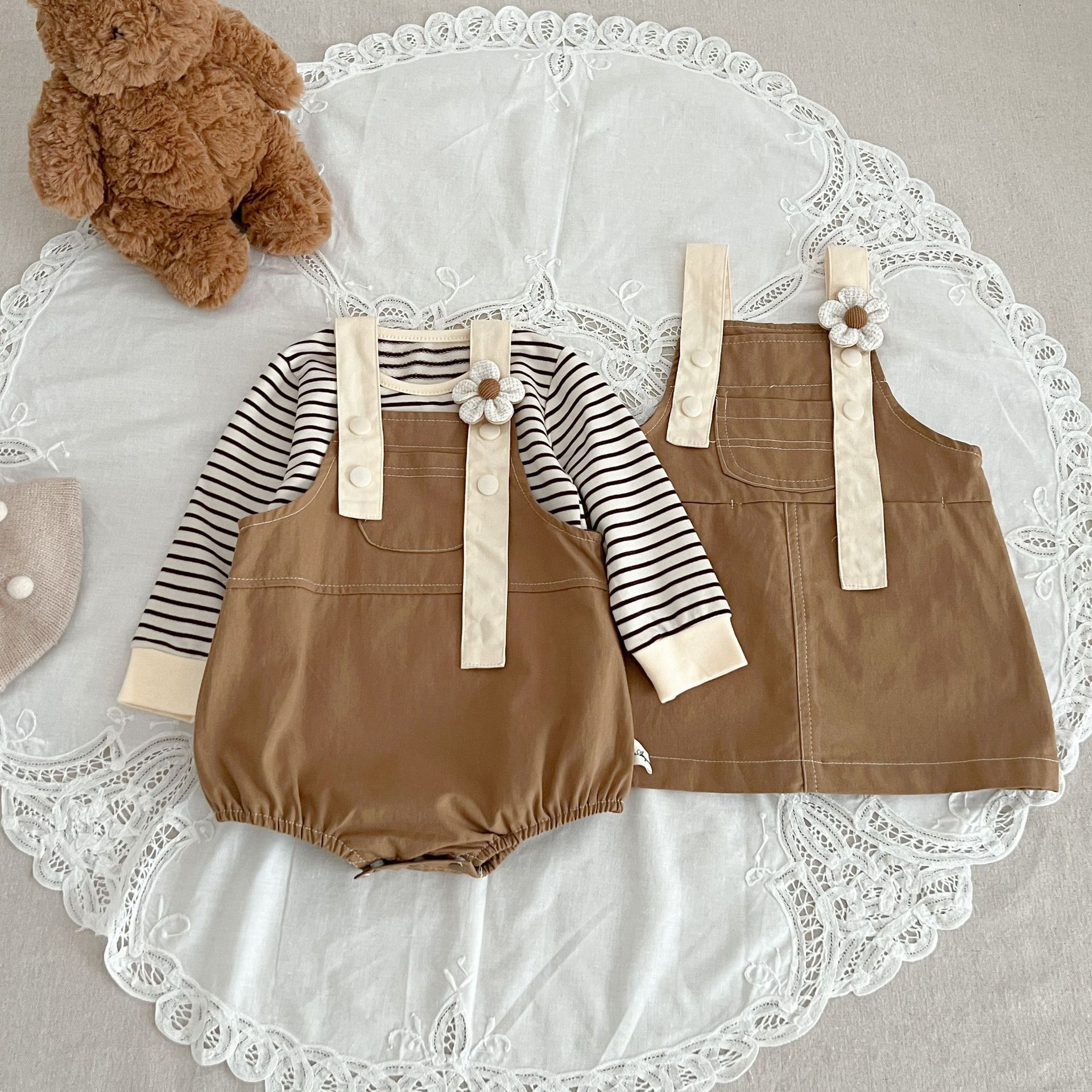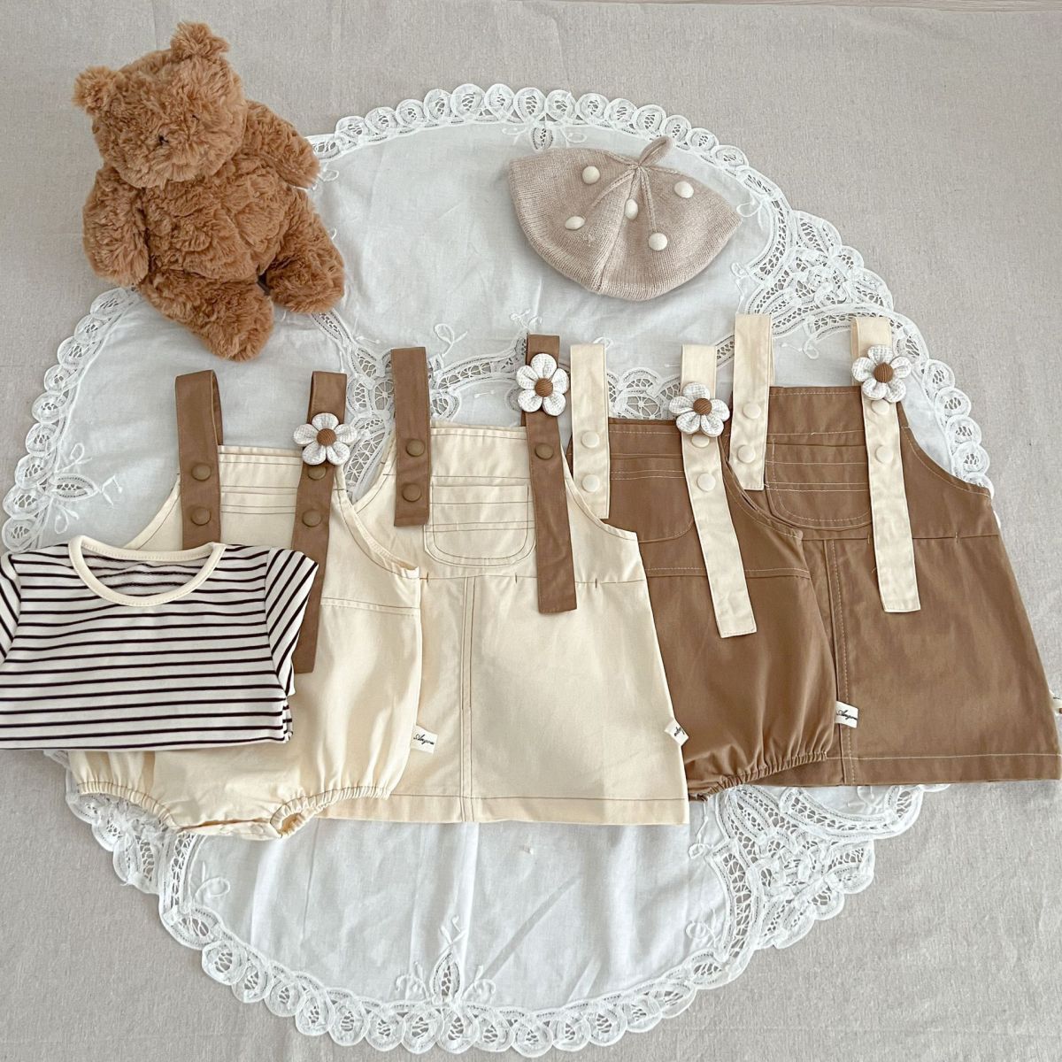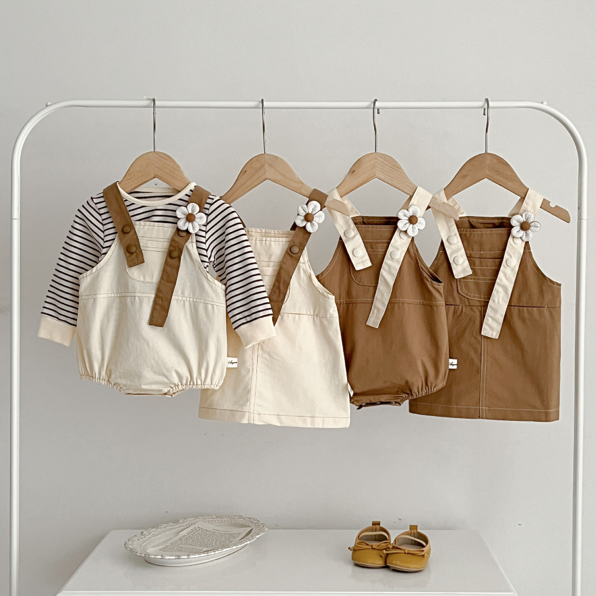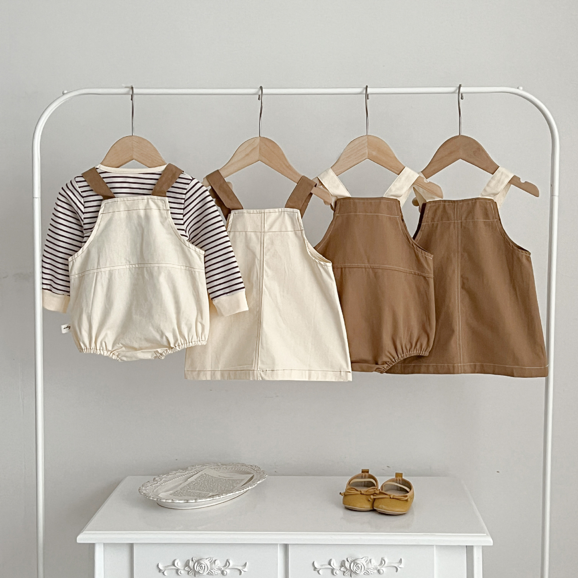 Color: khaki jumpsuit, apricot jumpsuit, khaki skirt, apricot skirt, top