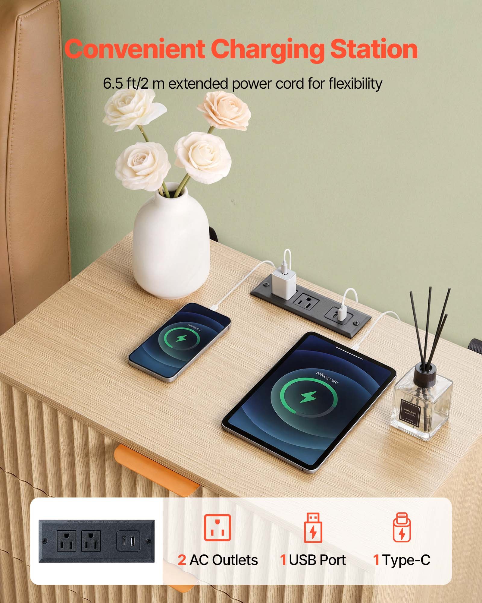 Convenient Charging: Built with 1 USB port, 1 Type-C port, 2 AC outlets, and a 6.5 ft (2 m) power cord, our modern end table enables you to easily charge phones, tablets, and lamps right from your sofa or bedside for everyday convenience