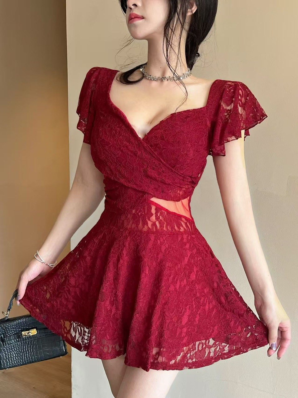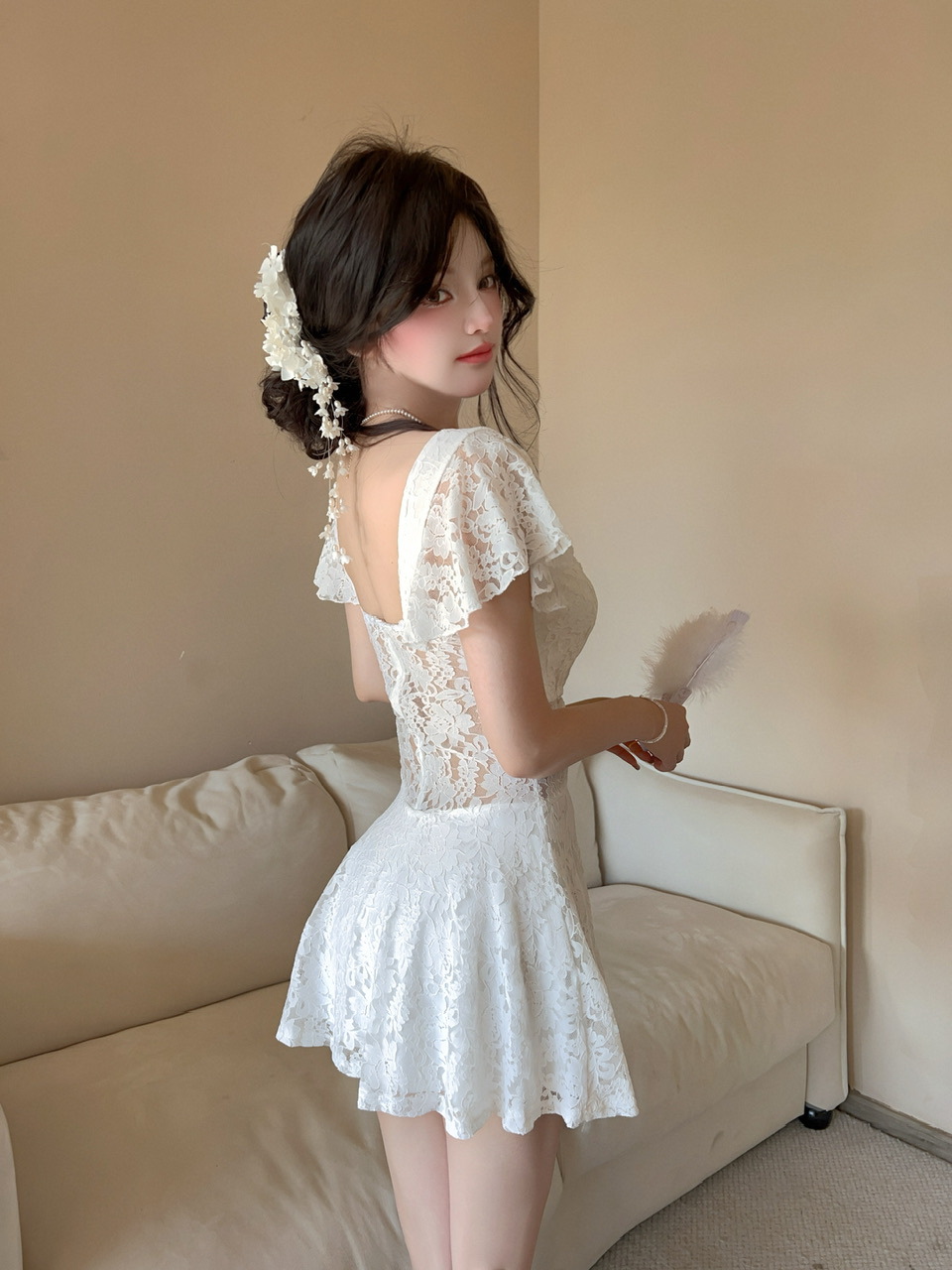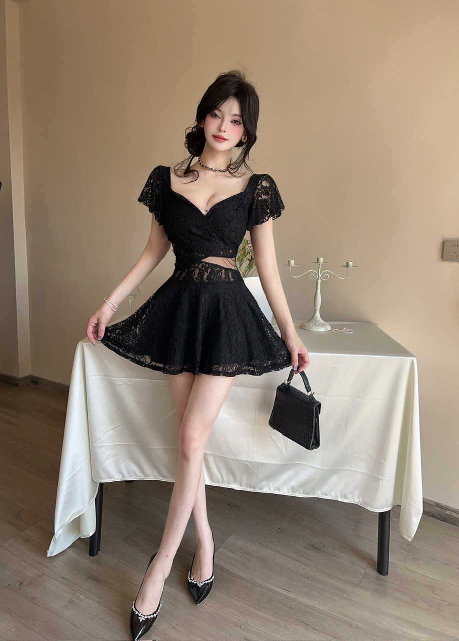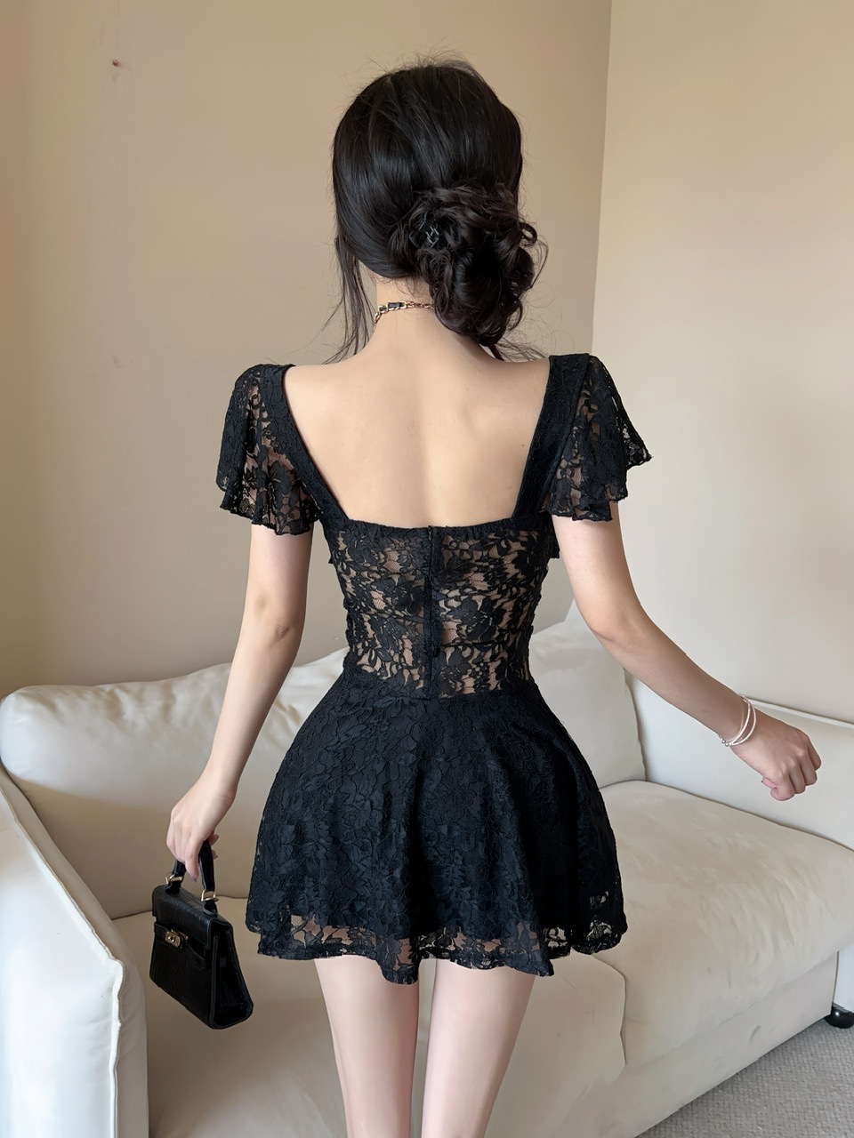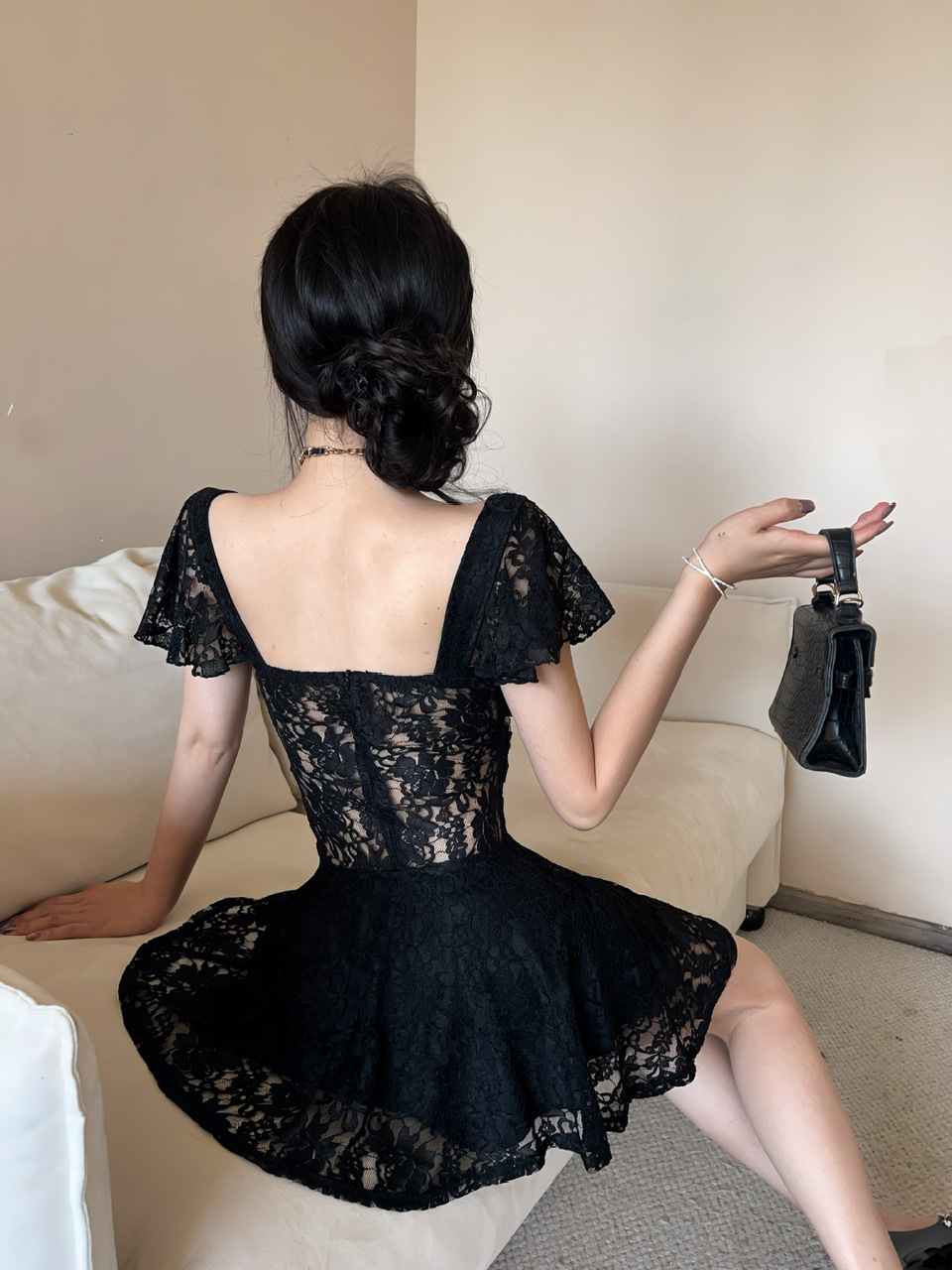 Flutter Sleeve Lace Hollow-Out Maxi Dress Petticoat