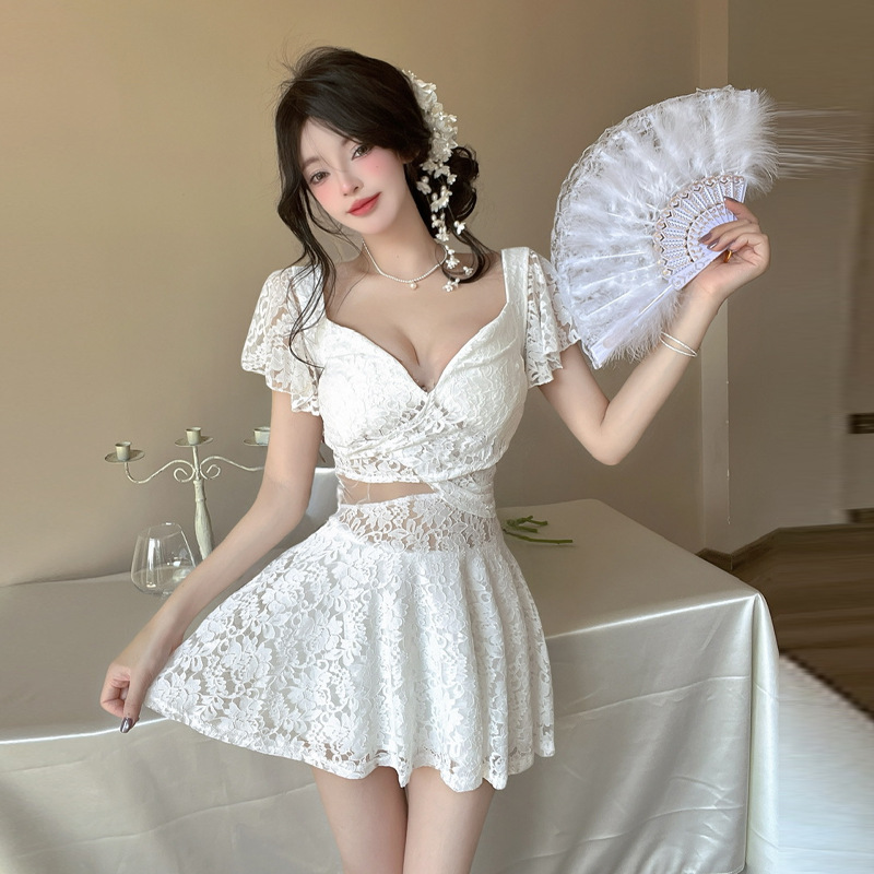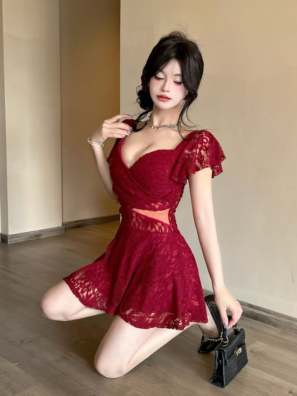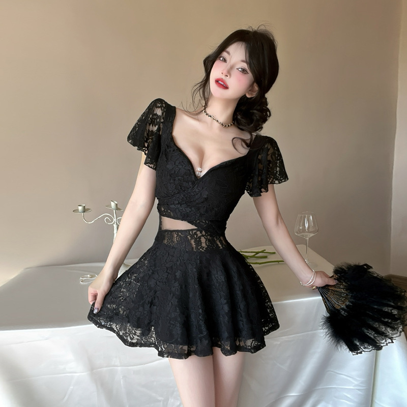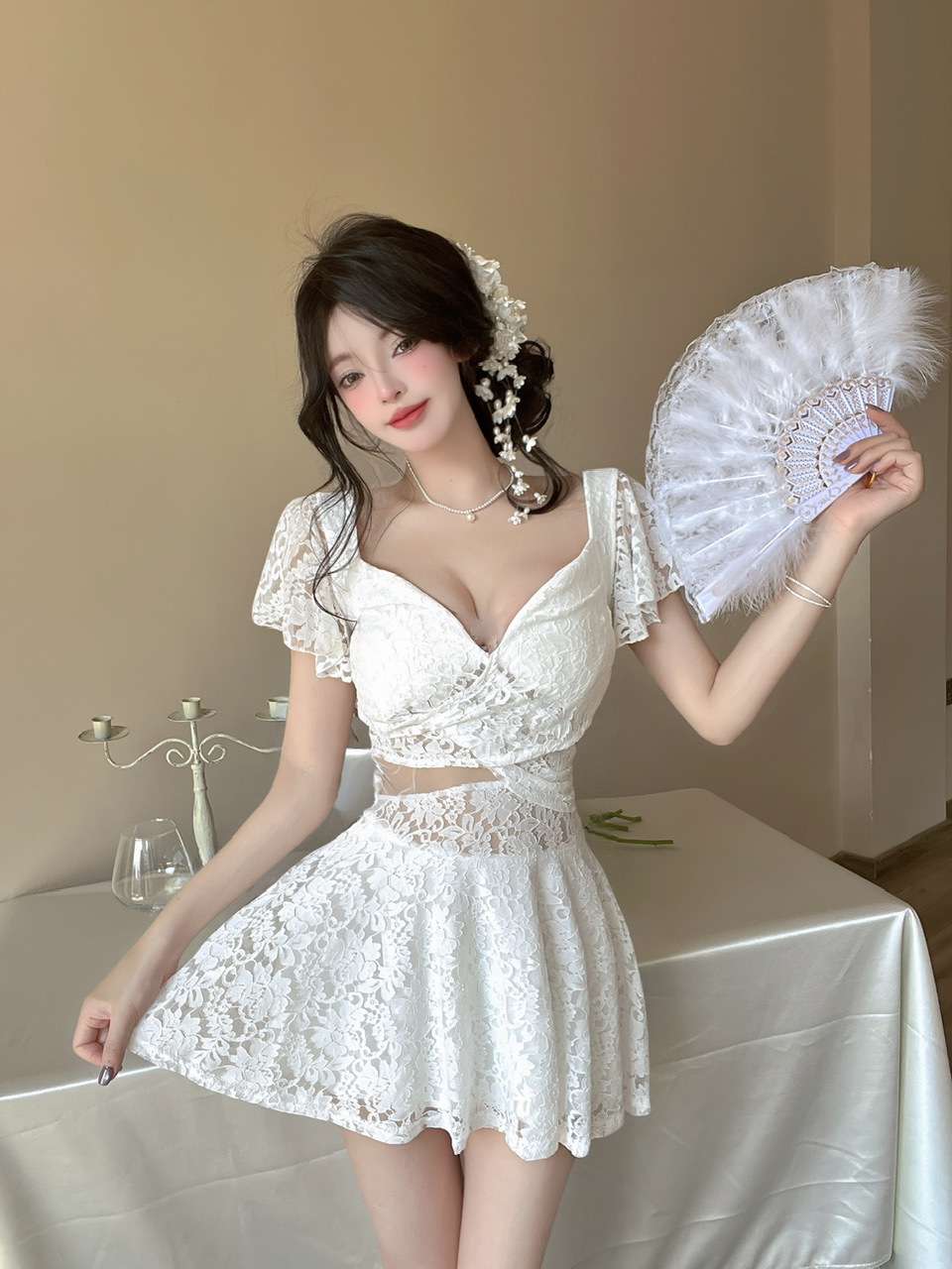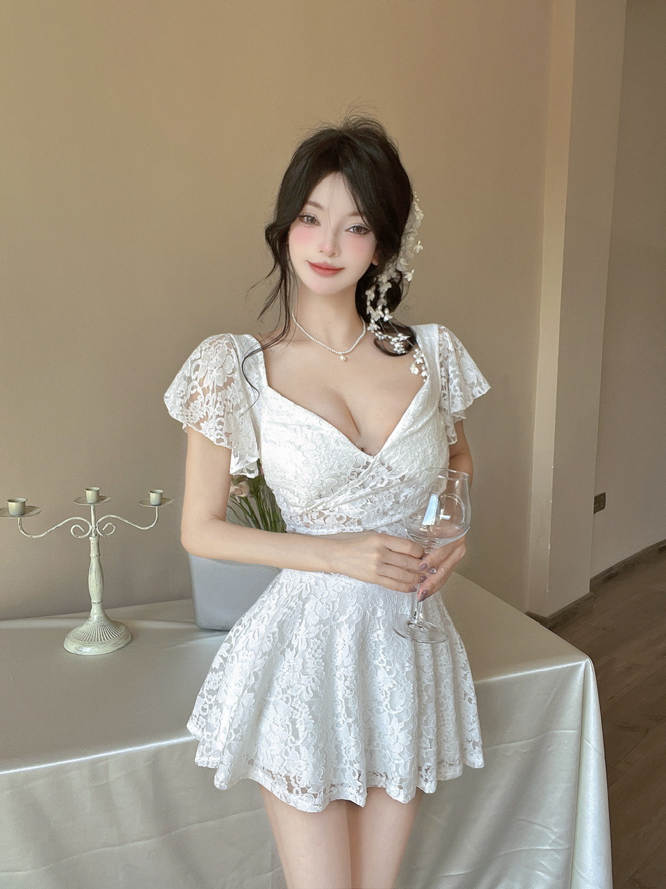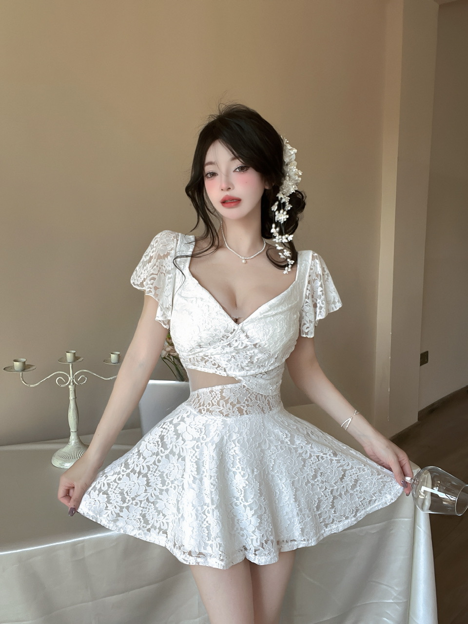 Flutter Sleeve Lace Hollow-Out Maxi Dress Petticoat