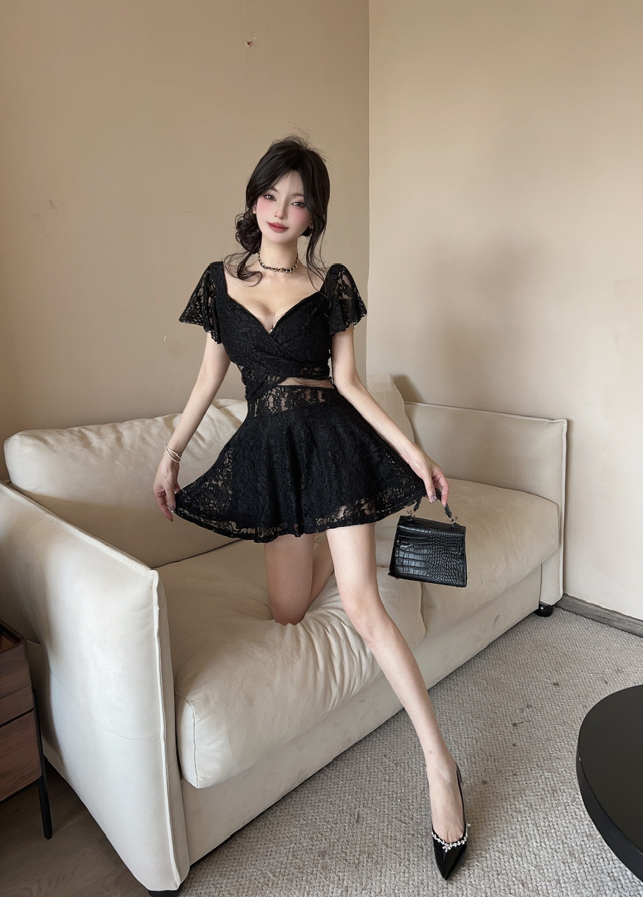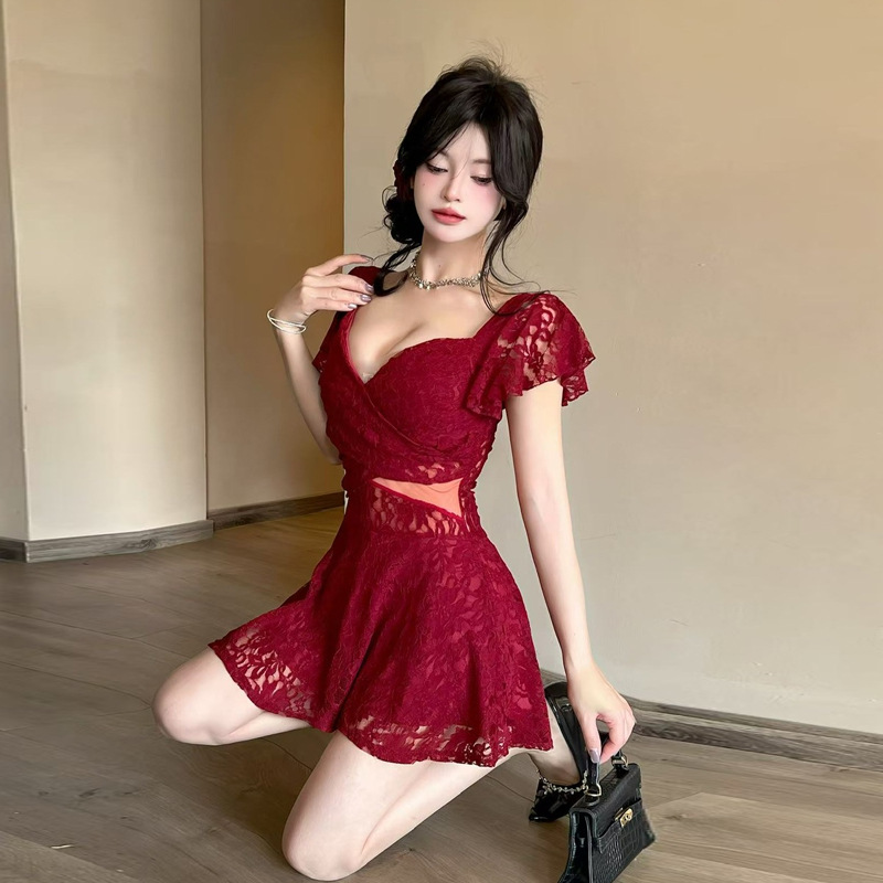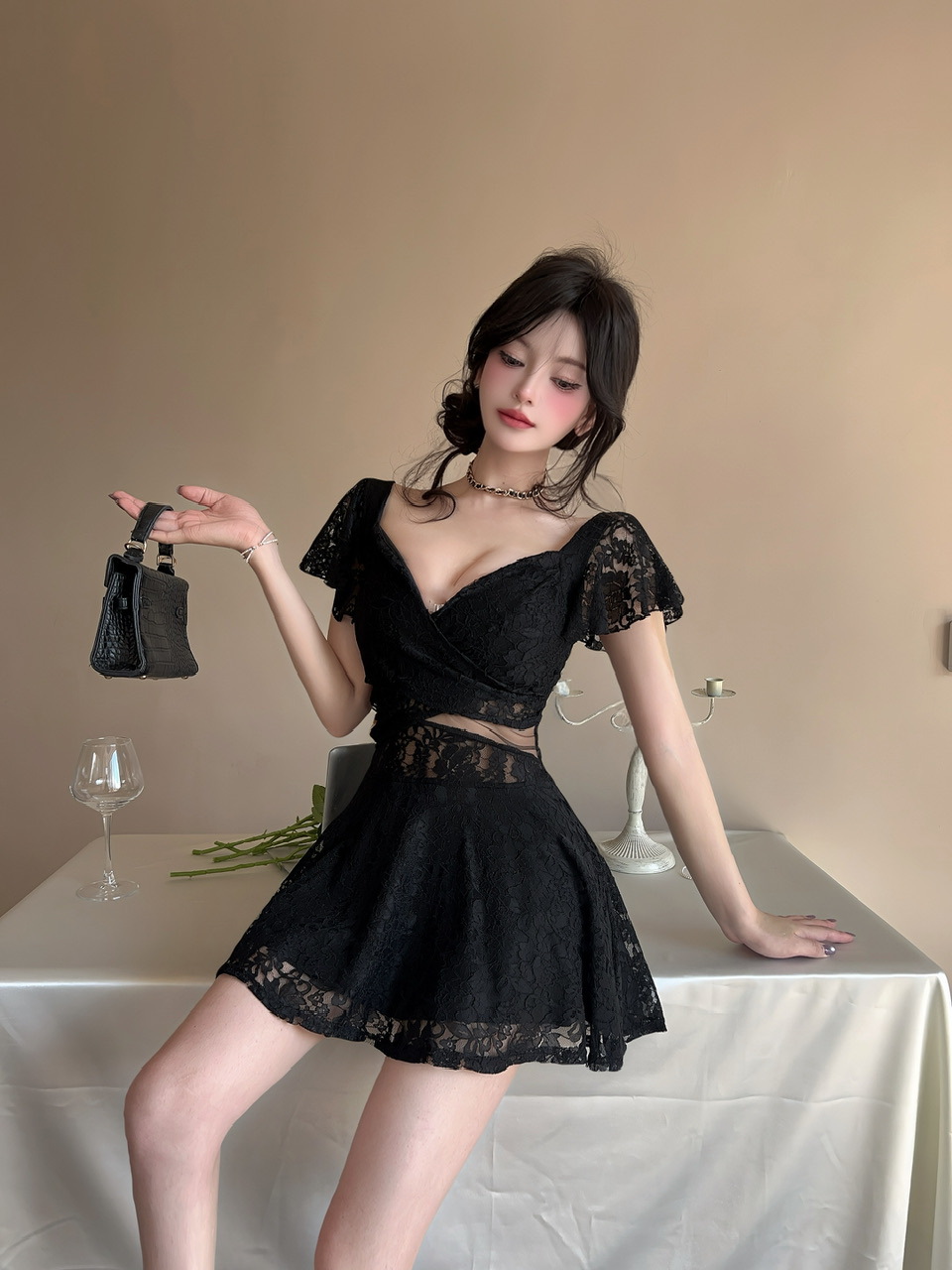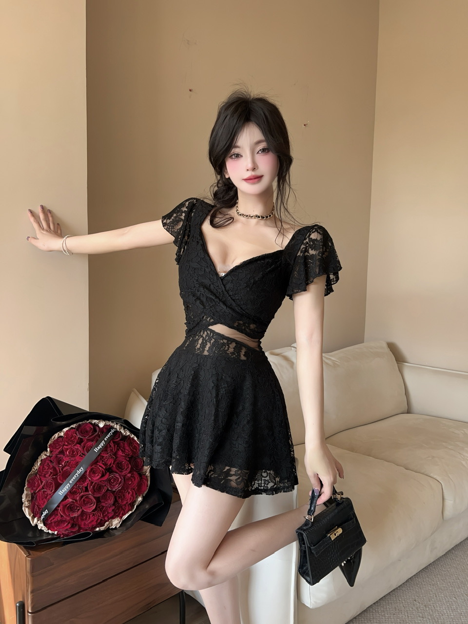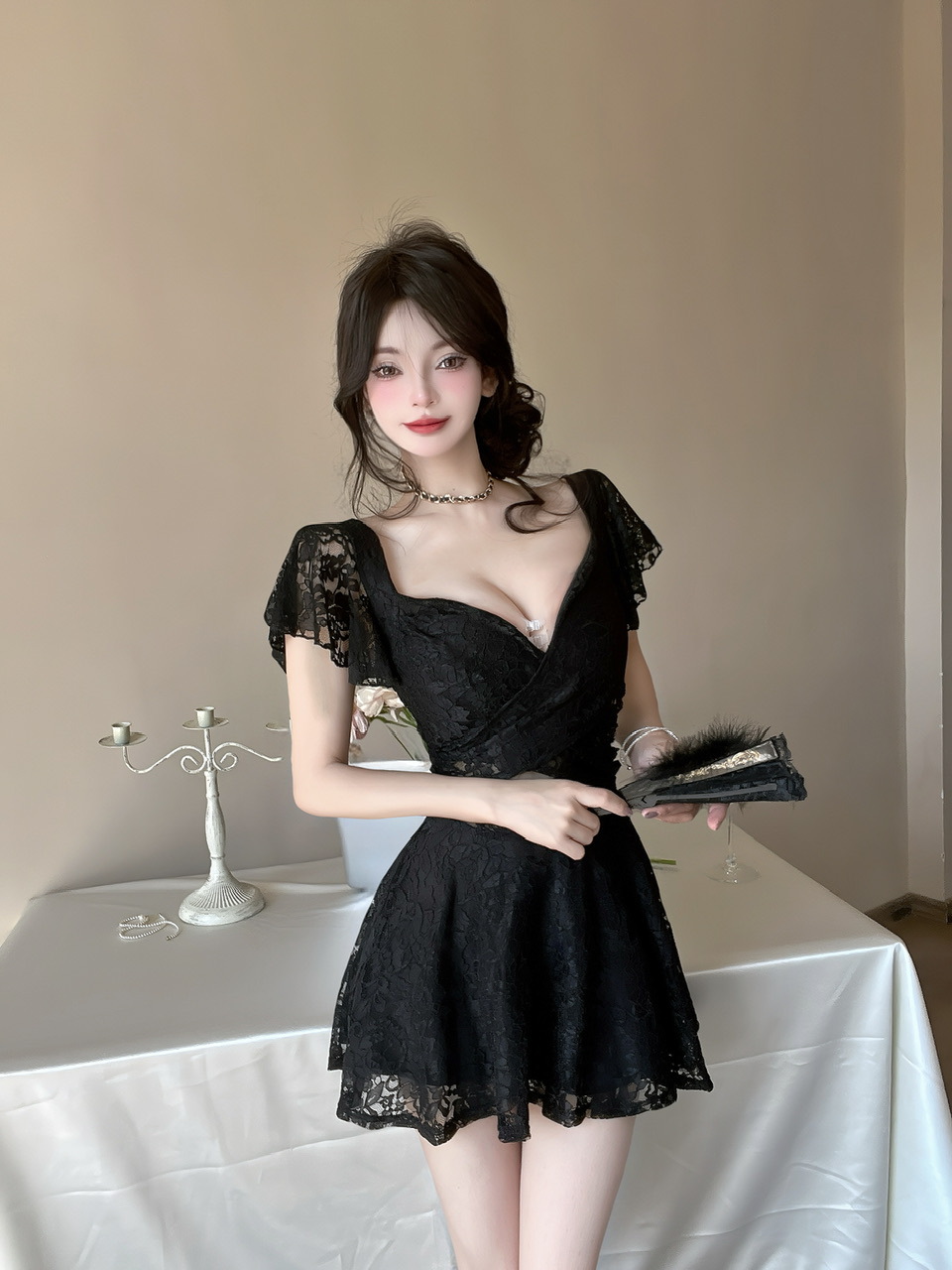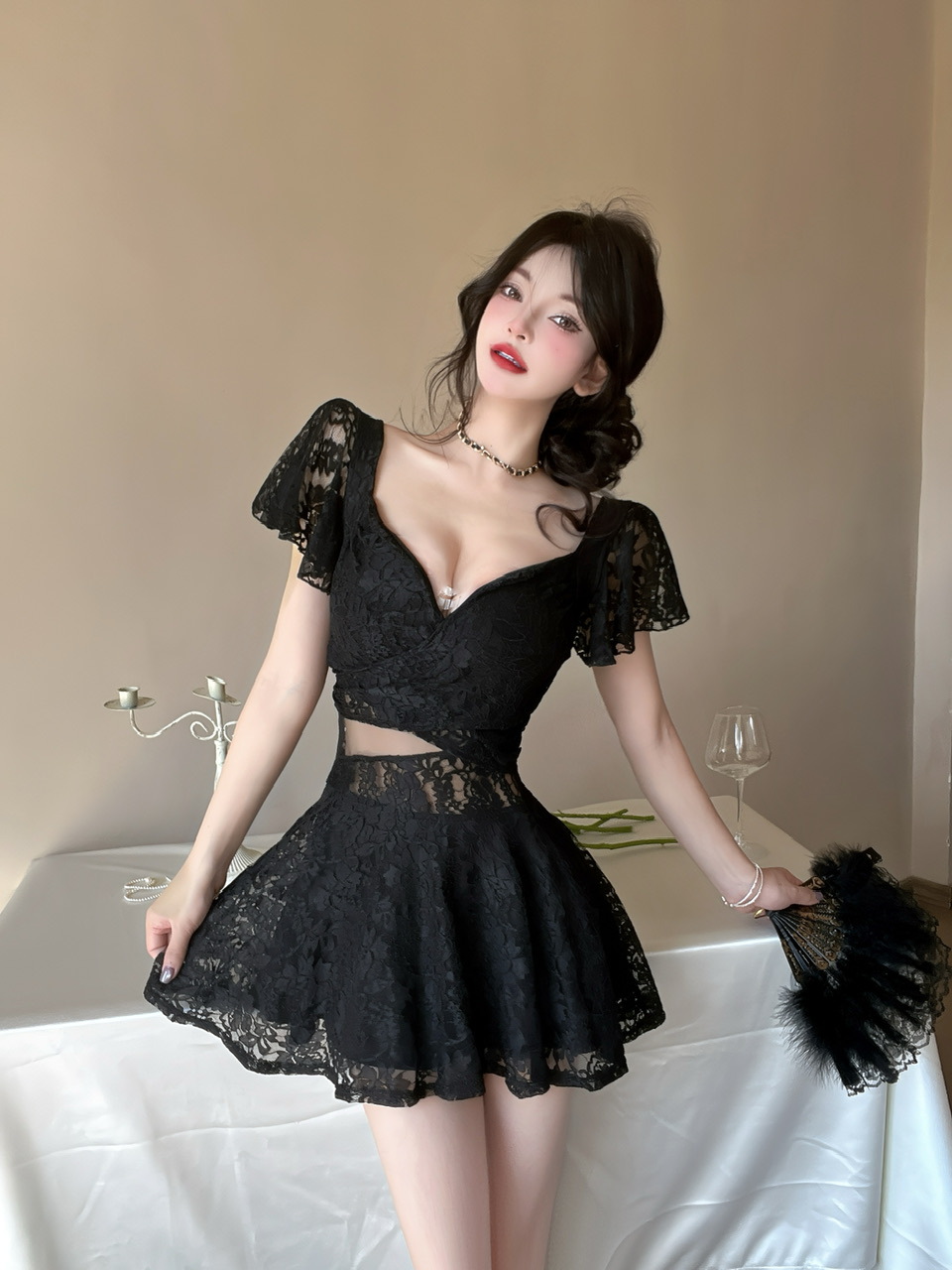 Flutter Sleeve Lace Hollow-Out Maxi Dress Petticoat