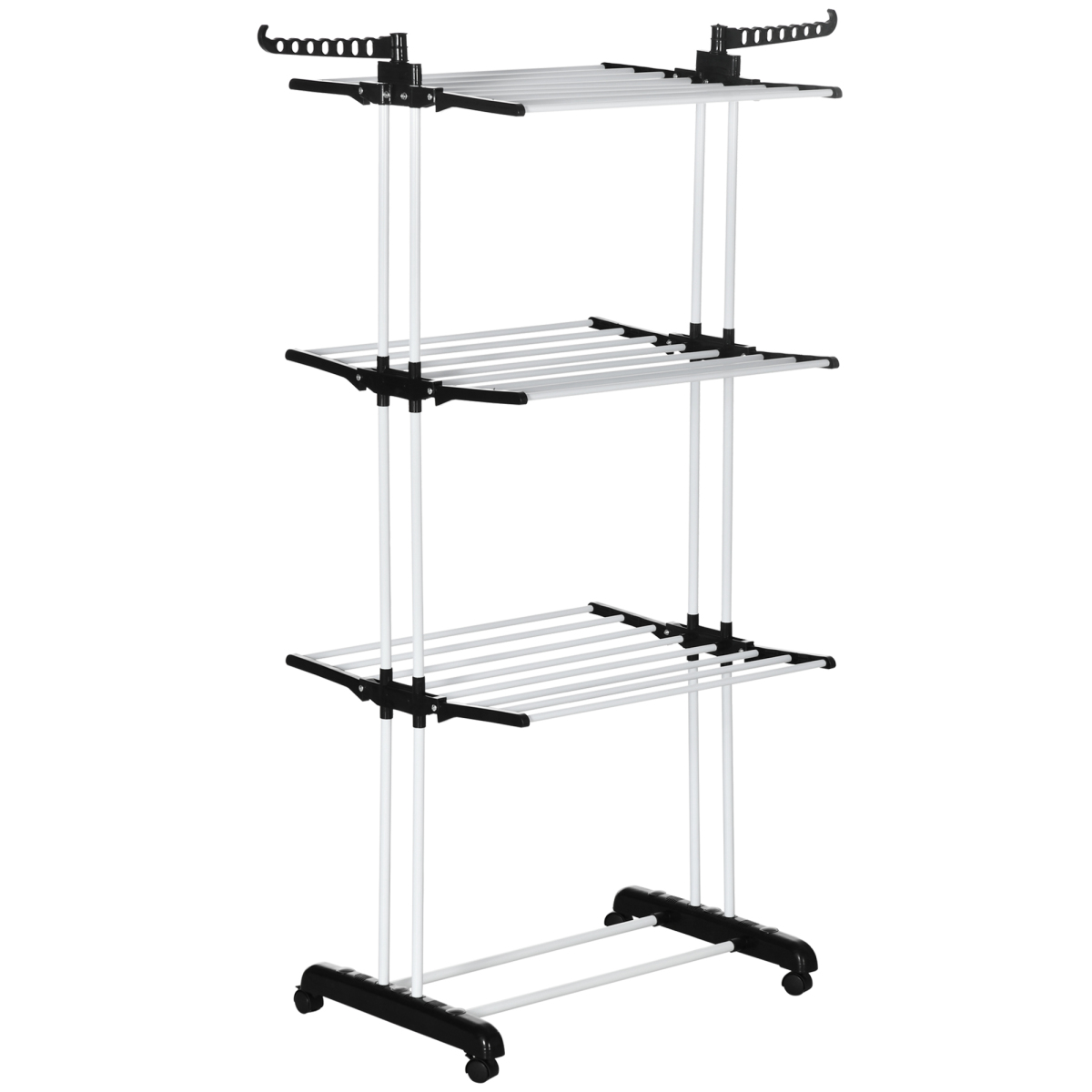 All clothes need somewhere to dry. This clothing airer is a large piece to give you plenty of hanging space. Four tiers offer plenty of room for all your garments; two top hooks are great for smaller bits like underwear. Made from powder coated steel, this is a strong standing piece which can hold up to 70kg. Complete with lockable wheels to move around easily.