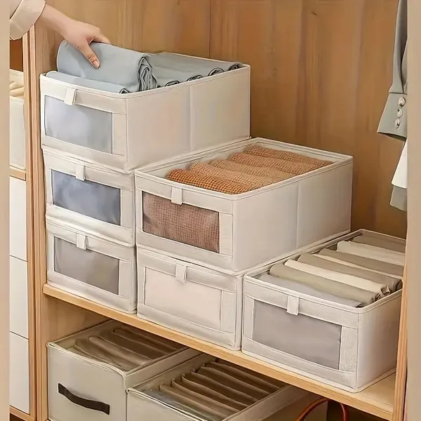 Foldable Clothes Storage Box With Viewing Window - Heavy-Duty Organizer Box, Stackable Closet Organizer For Wardrobe, Under-Bed, Shelf - Space-Saving Closet Storage Solution In Nano White -Linen Style