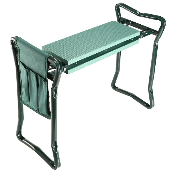 *Considerate Garden Kneeler and Seat*:An interesting and useful garden tool it is to be a garden kneeler as well as a garden seat by turning upside down to meet the needs of your different gardening work. *Sturdy Iron Construction*:Made from heavy duty iron materials,our kneeler is sturdy enough to bear approx. 330.69lbs-weighted objects. *Comfortable Thickening EVA Pad*:Adopting .67inches-thickness EVA pad,our kneeler is comfortable to sit or kneel especially for long time gardening work. *Easy Organization with Foldable Design*:Adopting a foldable design,our kneeler is easy to snap to organize and carry after use. *Free Tool Pouch*:Owning a detachable tool pouch with 3 separate compartments to place you needed garden tools orderly.
