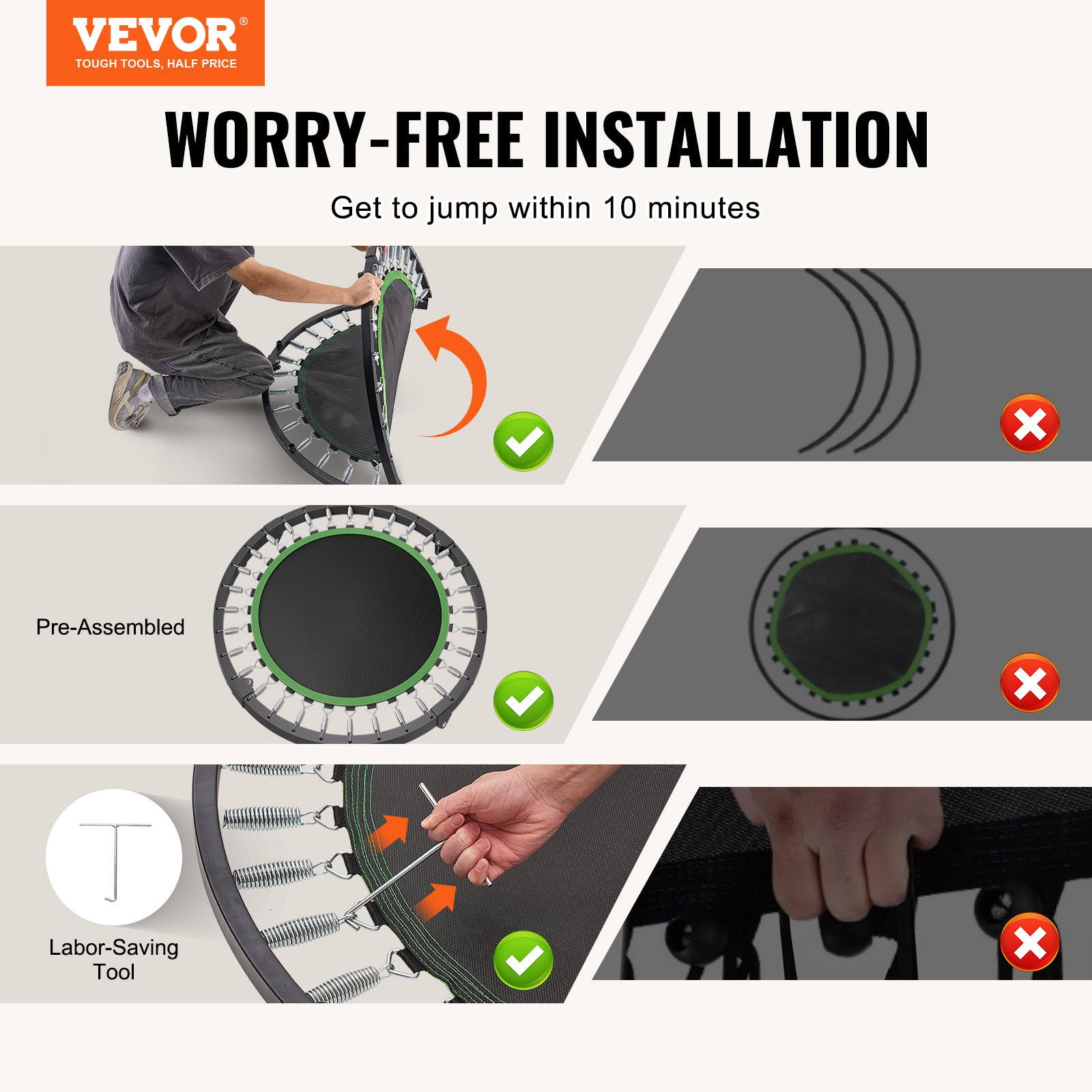 Features & Details 330 LBS Weight Capacity: Built with a sturdy thickened steel frame and strengthened legs, this fitness trampoline supports up to 330 lbs, offering a stable and secure jumping experience. The non-slip footpads ensure low noise and protect your floors, allowing you to bounce safely without disturbing others. High-Strength Springs: Enjoy a smooth and gentle bounce with our high-strength springs, designed for sustained elasticity. They buffer most vibrations, making it easier on your knees, joints, and back. 4-Level Adjustable Height: Achieve the perfect bounce height with the mini trampoline's 4-level adjustable handlebar, ranging from 39 to 48.5 inches. Adjust the height to match your comfort level and maximize your workout performance. Foldable Design: Save space effortlessly with the indoor trampoline's foldable design. It reduces to 80% of its original size, making storage a breeze. Whether under the bed, sofa, in the corner, or even in the trunk of your car, this trampoline is easy to tuck away when not in use. Simple Installation: Get bouncing in no time! The fitness trampoline comes partially pre-assembled, and with the included labor-saving tool, you can have it fully set up and ready for use in just 10 minutes.