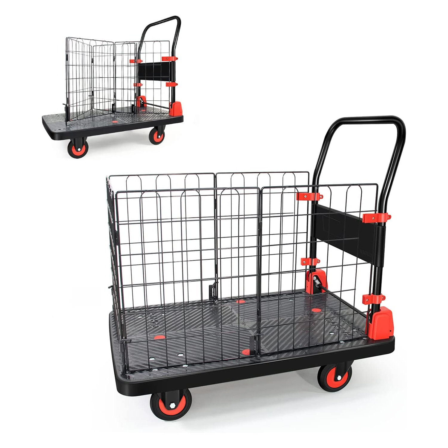 This 660 lbs. Capacity Platform Truck Foldable Push Hand Cart with Folding Fence Cage features a steel construction for high load capacity. Anti-skid panels help prevent cargo from slipping off the cart. Thoughtful designs such as folding switches and silent wheels provide you with a better experience. 1 trolly for 2 purposes: The fence at the handrail can be removed, folding fence cage trolley, magic storage of miscellaneous objects and comfortable portable life. Let you move the goods effortlessly and worry-free.