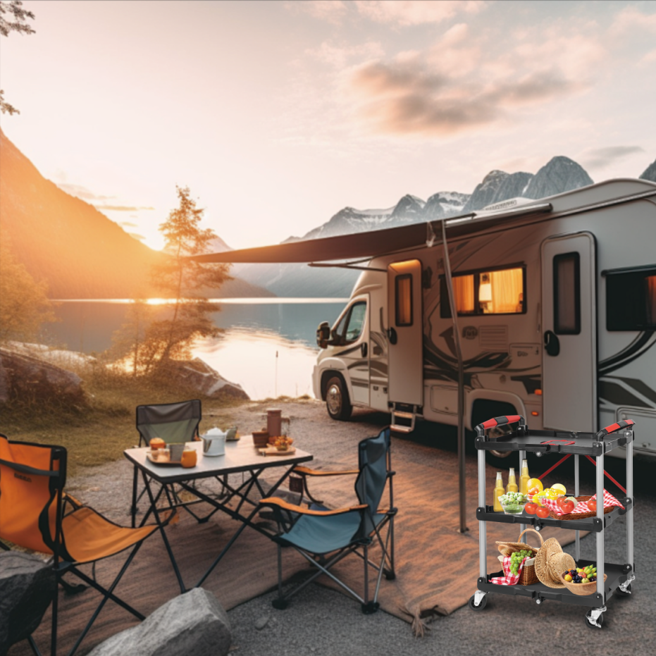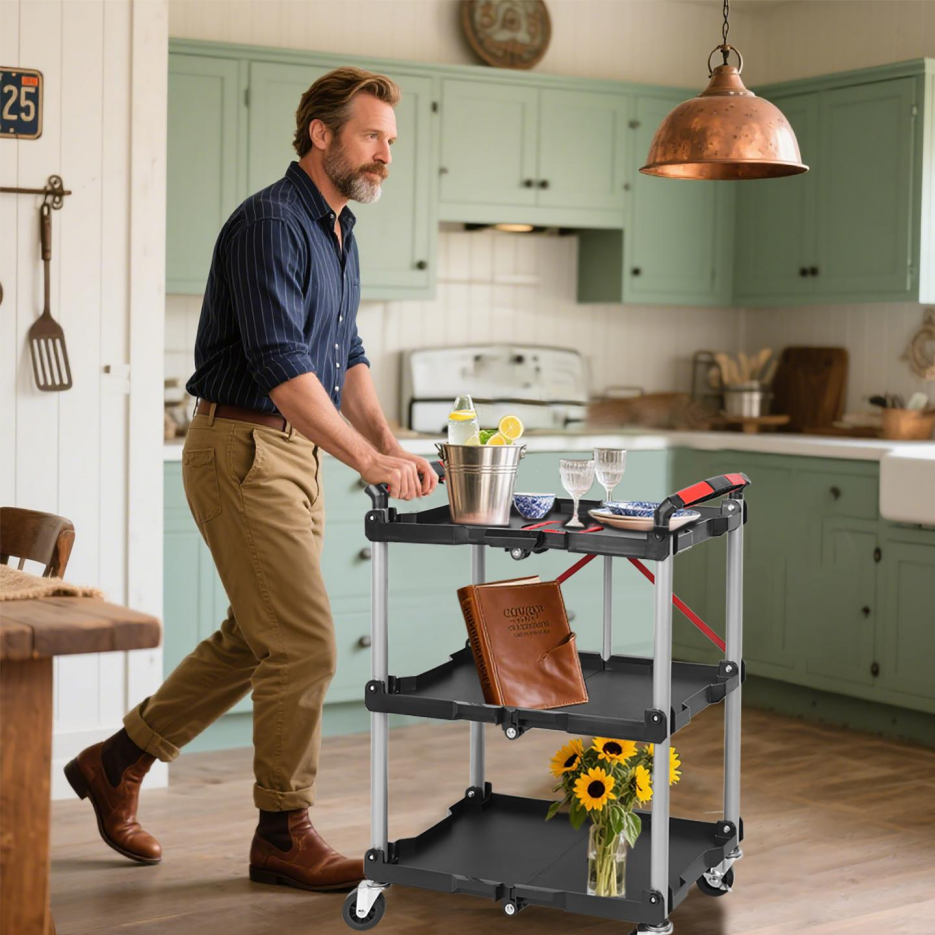 Product Name:Foldable Utility Service Cart, 3 Shelf Heavy Duty Plastic Rolling Cart with 360° Swivel Wheels (2 with Brakes), Ergonomic Handle, Portable Garage Tool Cart for Warehouse Office Home
