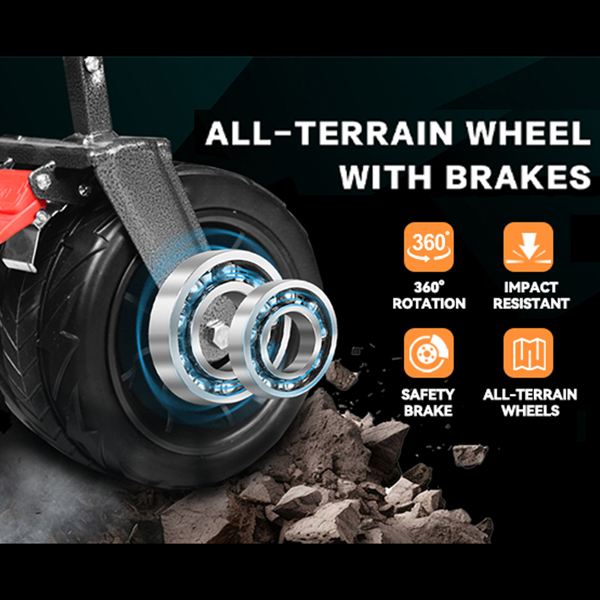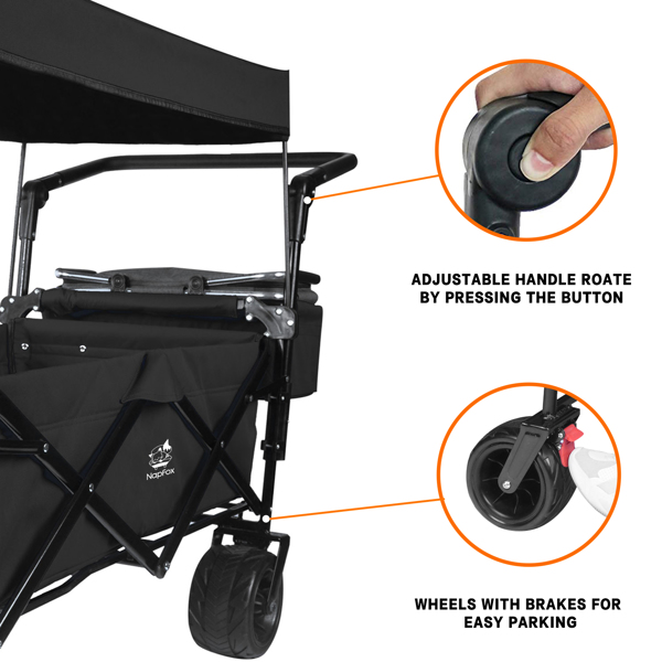 【360° ROTATING WHEELS】The wagon is outfitted with 360° rotating large wheels (7” diameter X 4” wide). This design allows the wagon to be used across diverse terrains such as beach sand, ramps, stones, lawns, and steps, providing excellent maneuverability