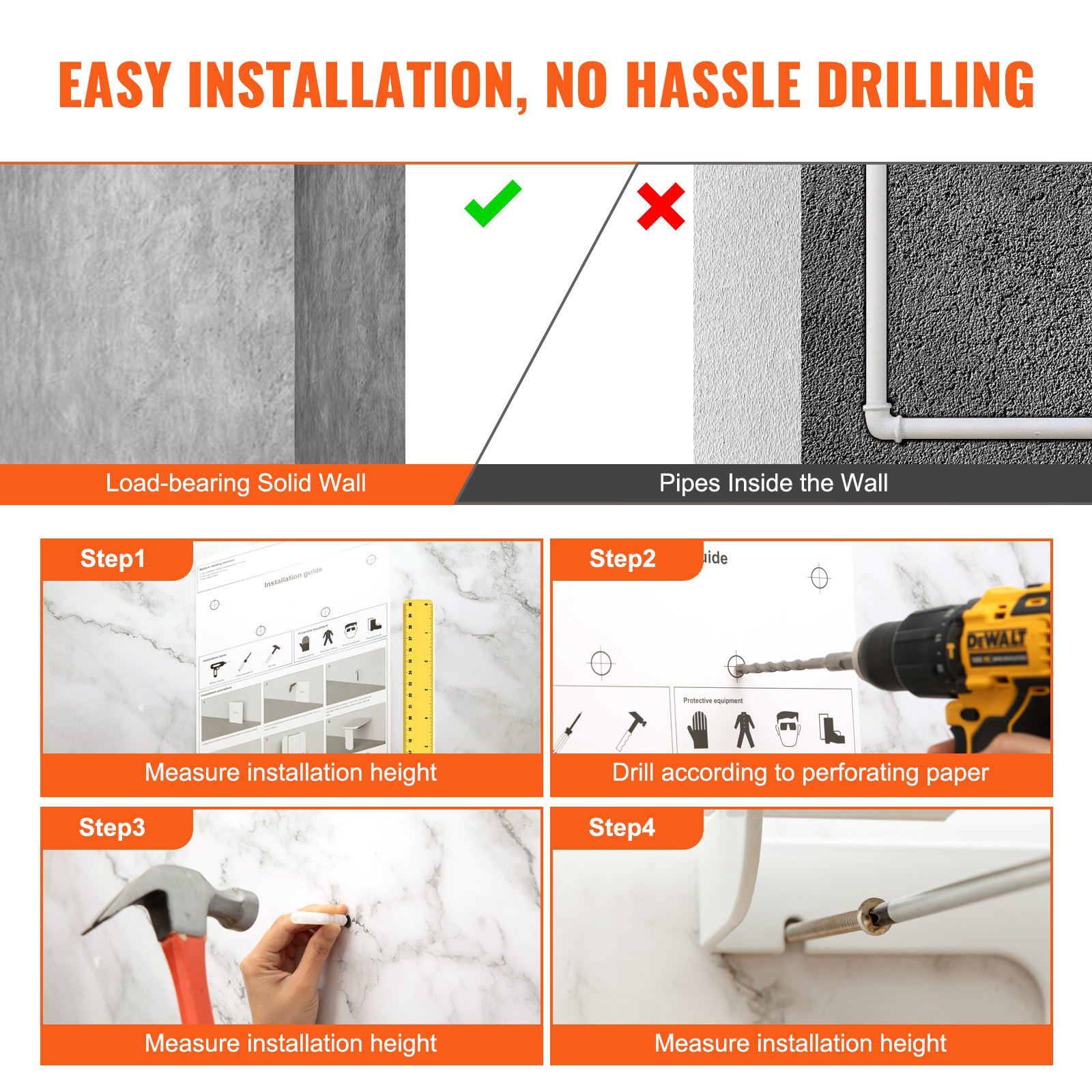 Drill-Hole Wall Mounting: Thoughtfully equipped with mounting hole guiding sticker for precise drilling – no need for additional markings with a pen. Complete with bolt cap, 304 stainless steel screws, and an extra set of 2 stainless steel screws and bolt caps for added convenience. Note: Install our folding shower seat on load-bearing solid walls.