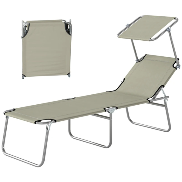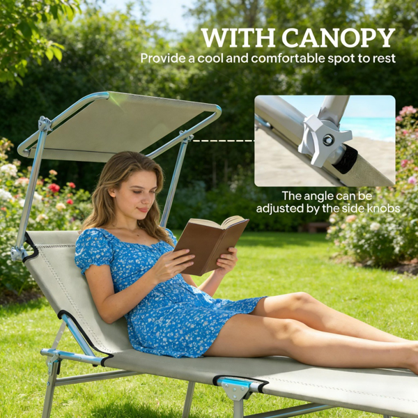 Features: - Detachable and adjustable awning to get the glare out of your eyes - 4-level adjustable backrest position (14.25"/21.25"/26.5"/30.25") - Made with a metal frame and Oxford cloth to endure outdoor conditions - Lightweight, portable, and foldable for easy transport and storage - Suitable for the park, garden, patio, poolside, conservatory, or beach - Simple assembly required Specification: - Color: Cream White - Materials: Metal, Oxford Cloth - Fully Reclined Dimensions: 73.5" L x 22.75" W x 14.25" H (without awning attached) - Folded Dimensions: 28" L x 4.25" W x 22.75" H - Awning Size: 19.75" L x 16.5" W - Max Awning Height: 41.25" H - Weight Capacity: 264 lbs. - Net Weight: 11 lbs.