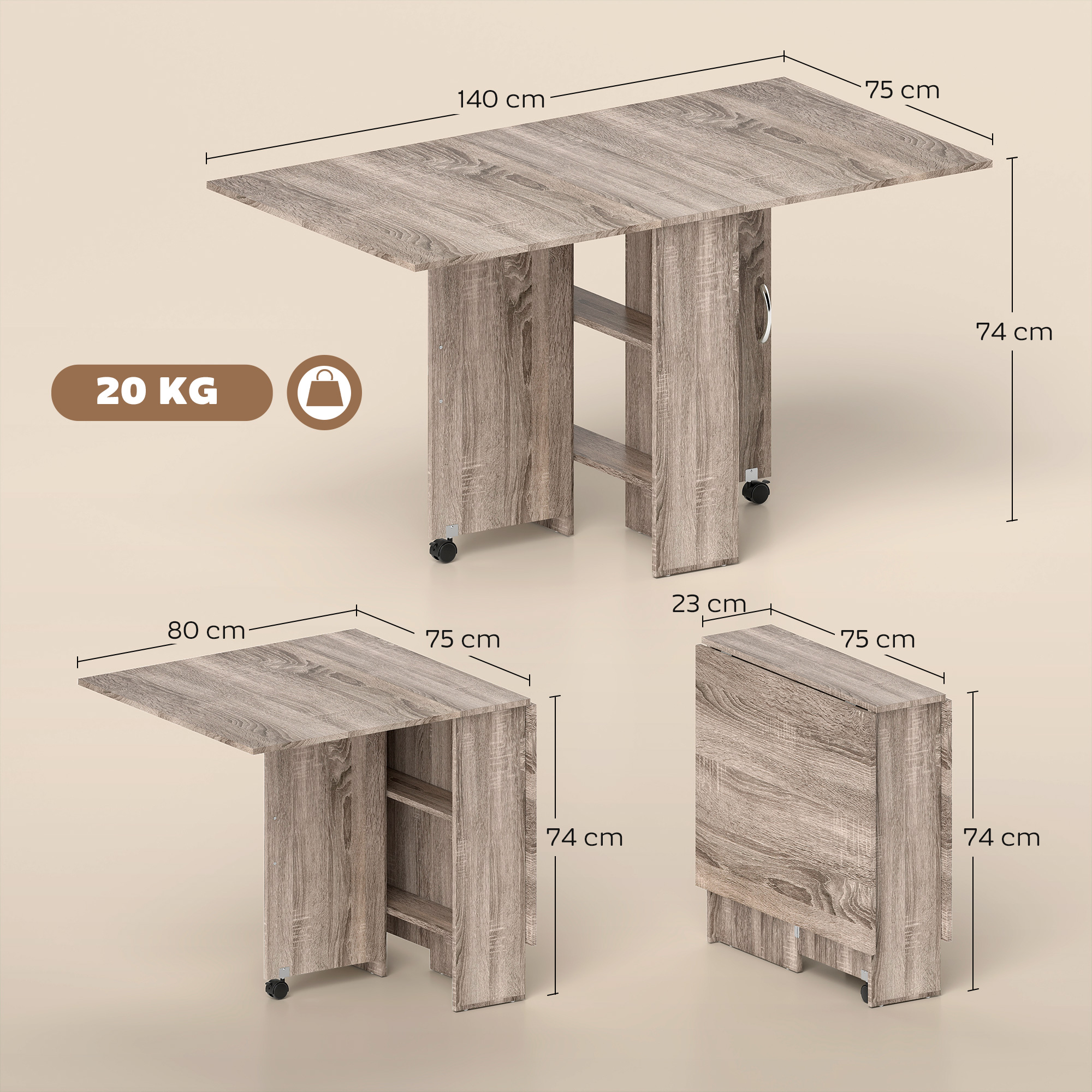 Make large unused tables at home a thing of the past. Choose this drop leaf dining table for extending surface space, whenever you need it. Both sides lift up and drop down super easily. Inside there are two shelves for close by and discreet storage - easy to keep things close to you. Side panels are complete with braked wheels for expanding and folding the kitchen table conveniently.