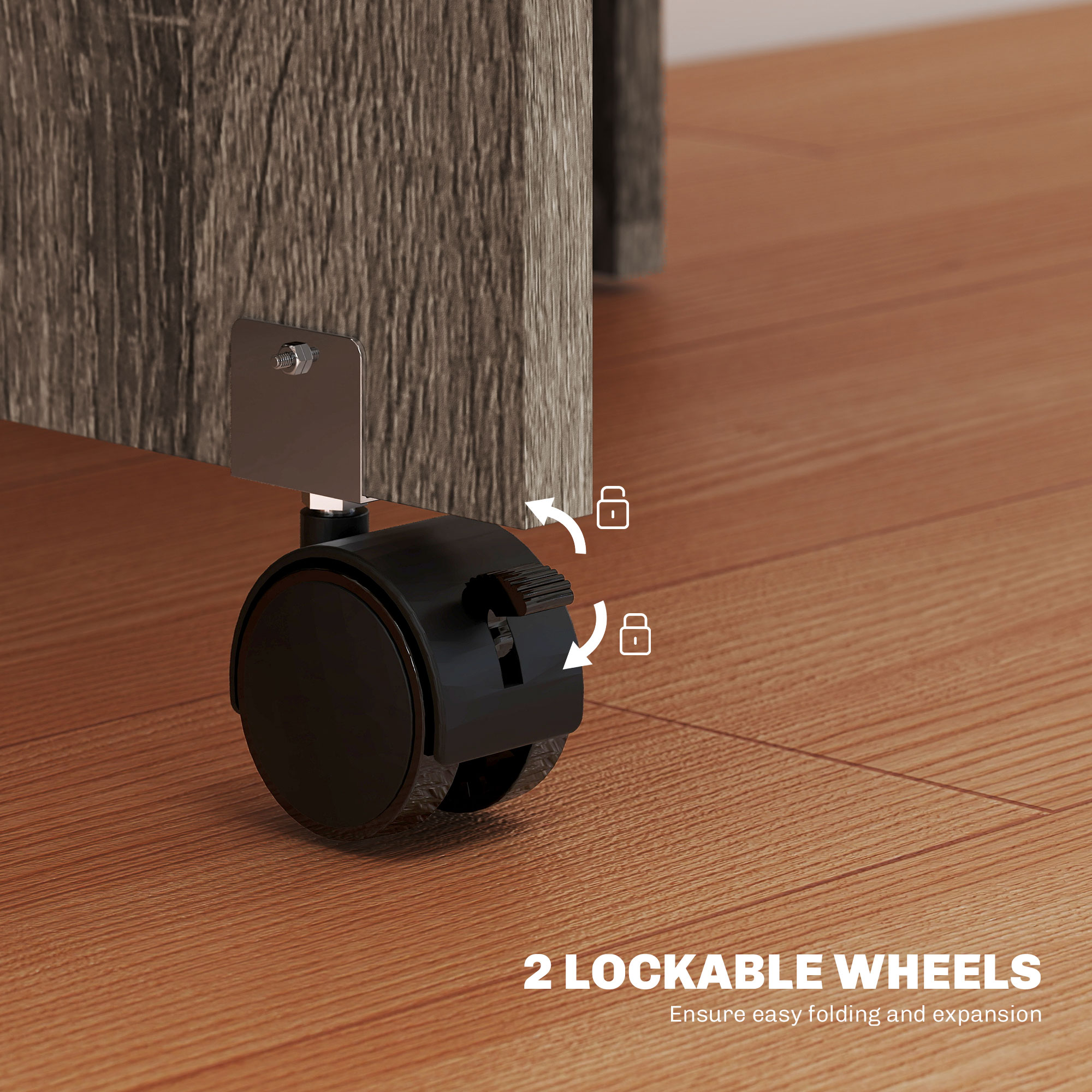 • Two wheels with brakes are designed to fold and expand the table easily