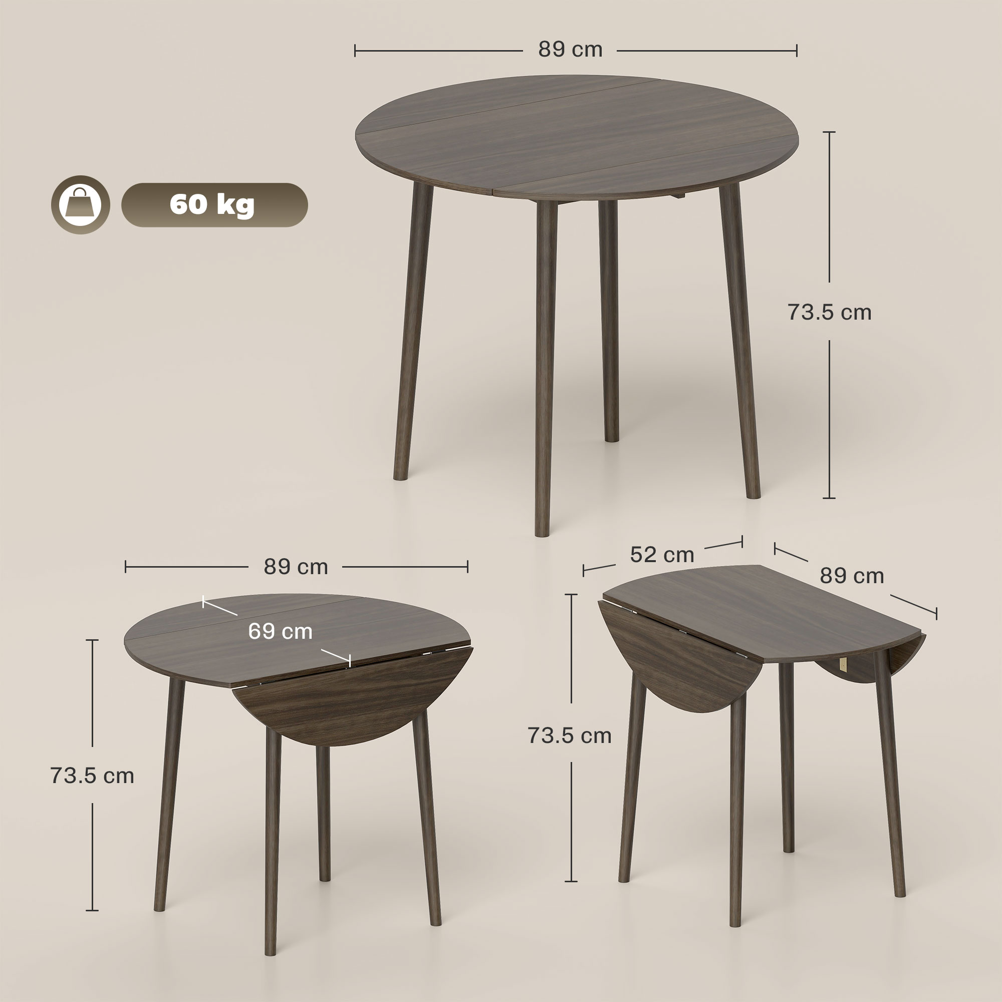 This drop leaf table made from particle board, with wood legs. Two side leaves to expand the space - suitable for smaller and larger spaces. Seats up to four people.
