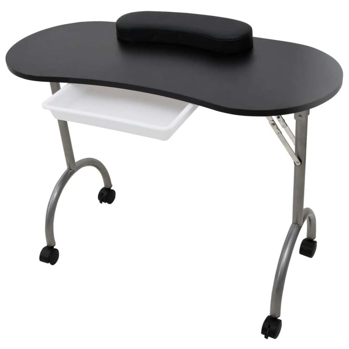 Description: This foldable manicure table, with a thick wrist rest, is suitable for both professional and home use. The thick wrist rest, covered in faux leather, will keep your hand in a comfortable position during your manicure. The integrated drawers allow you to store small manicure tools such as nail clippers, nail polish, nail files, etc. The two lockable casters are designed to ensure mobility and easy setup. With its sturdy steel legs, our nail table is built to last. It also folds conveniently to save space. The large tabletop offers plenty of room for your hands and all your manicure accessories. Thanks to the stable steel legs, you will enjoy this manicure table for a long time. It can also be conveniently folded for space-saving storage. Properties: Colors: Black, White Dimensions: 90 x 37 x 68 cm (L x W x H) Frame material: MDF + powder-coated steel, MDF + powder-coated steel Steel leg diameter: 28 mm Weight: 9.5 kg Load capacity: 30 kg Material: Polyurethane: 100% Dimensions: 90 x 37 x 68 cm (L x W x H) Steel leg diameter: 28 mm