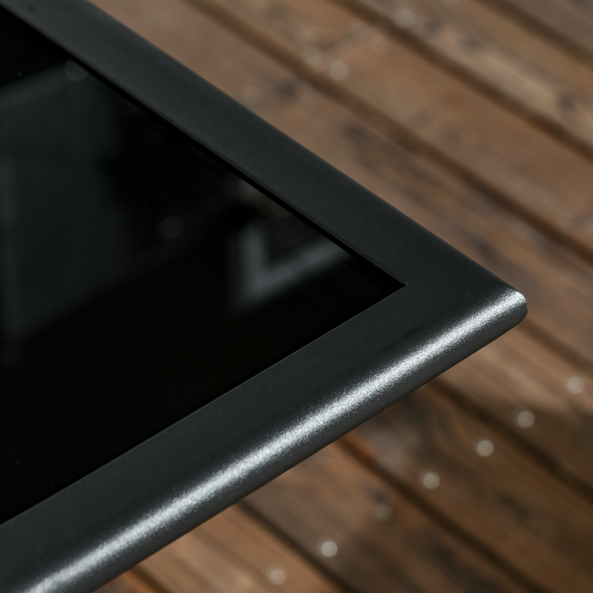 Create a simple yet inviting dining space on any deck or patio with this charming foldable garden table with parasol hole from . The sturdy metal frame with non-slip foot pads is stable and designed to last for years, and is foldable to compact size for space-saving storage. Featuring a tempered glass tabletop with a parasol hole in the middle to bring a sleek feeling and cool shade. Add enduring beauty and grace to your area with this garden dining table of outdoor living space.
