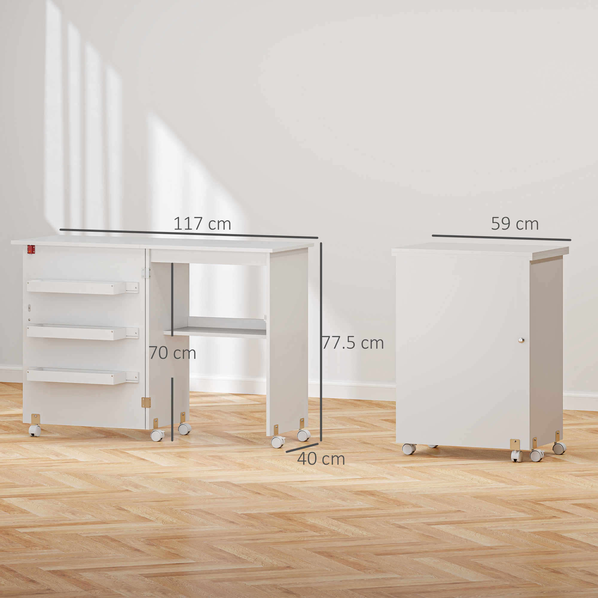 Transform your crafting with the folding sewing table from , a versatile sewing desk that expands with a drop leaf top and magnetic side for a spacious craft table. Tuck it away as a side cabinet when space is limited. Our sewing machine cabinet features lots of storage with three bins and an under-desk shelf, all set on five wheels for easy mobility. Suitable for any sewing enthusiast or as a dynamic crafting table.