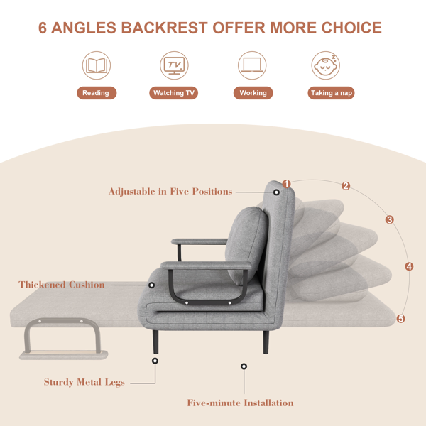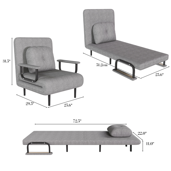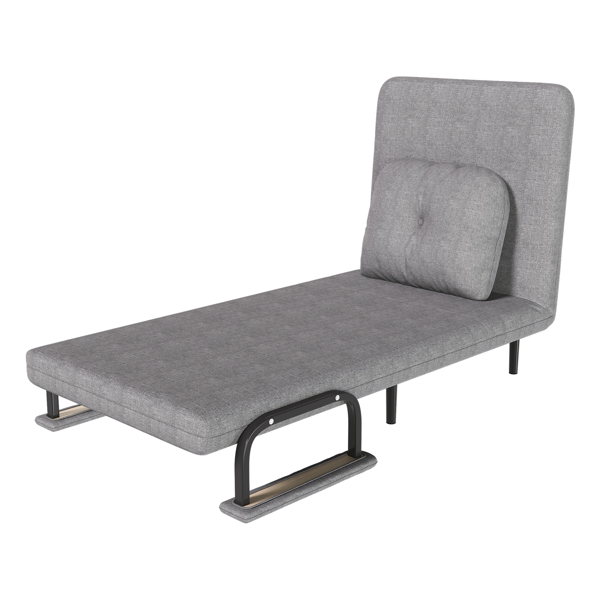 Folding Sofa Bed 5-in-1 Convertible Chair - 5-Position Adjustable Backrest With Pillow, Space-Saving Sleeper For Living Room, Bedroom & Office-Grey