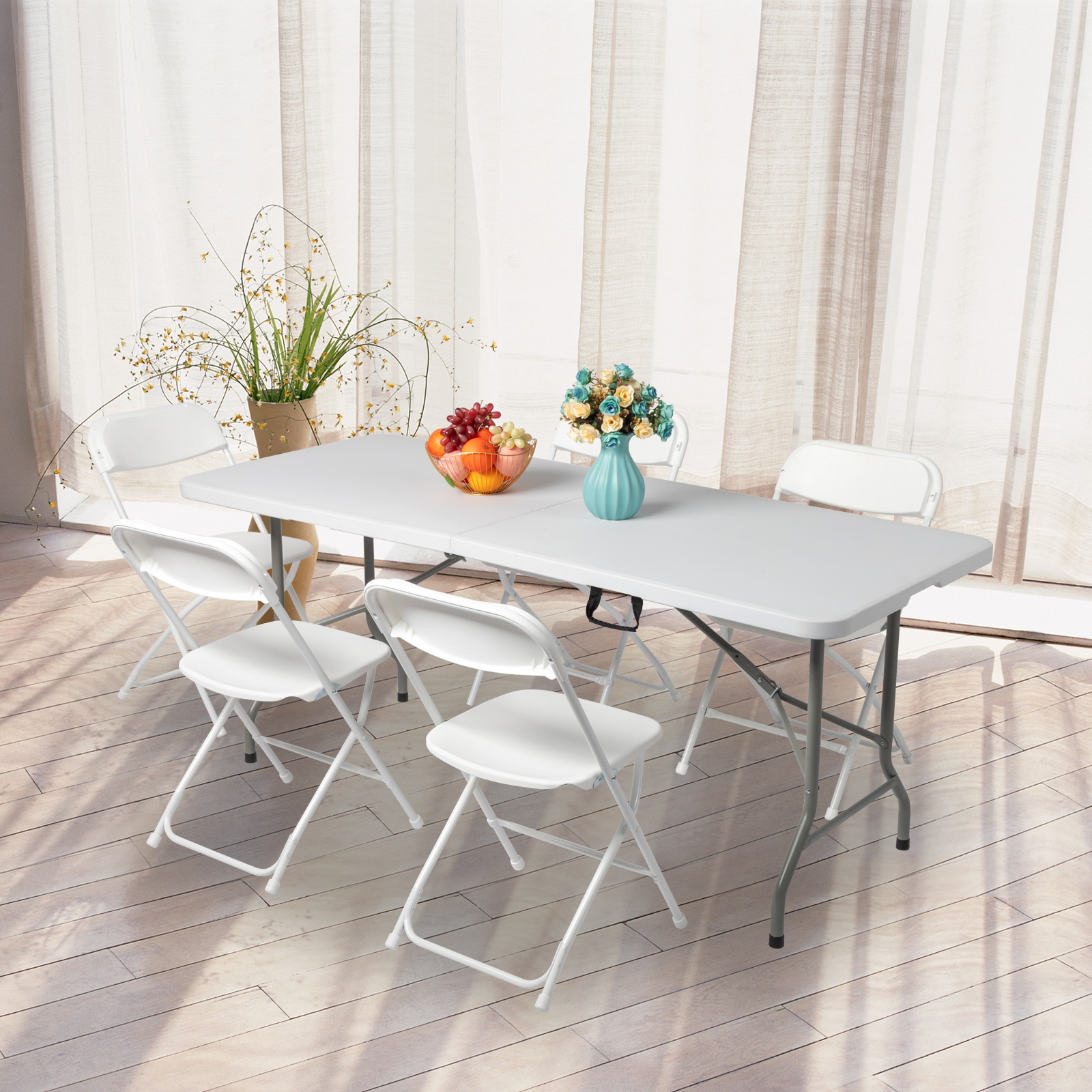 6FT Outdoor Courtyard Foldable Long Table is a perfect integration consisting of both table and seats. PERFECT FOR ANY OCCASION - Folding Table 6ft is a game-changer for backyard BBQs, tailgating, camping trips, garage sales, and holiday dinners. Seats 6-8 people comfortably. When you're done, it folds right in half and stores anywhere - under the bed, in a closet, or your car trunk.