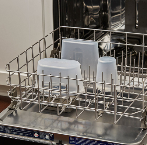 Its container can be safely placed on the top shelf or on the bottom of the dishwasher.