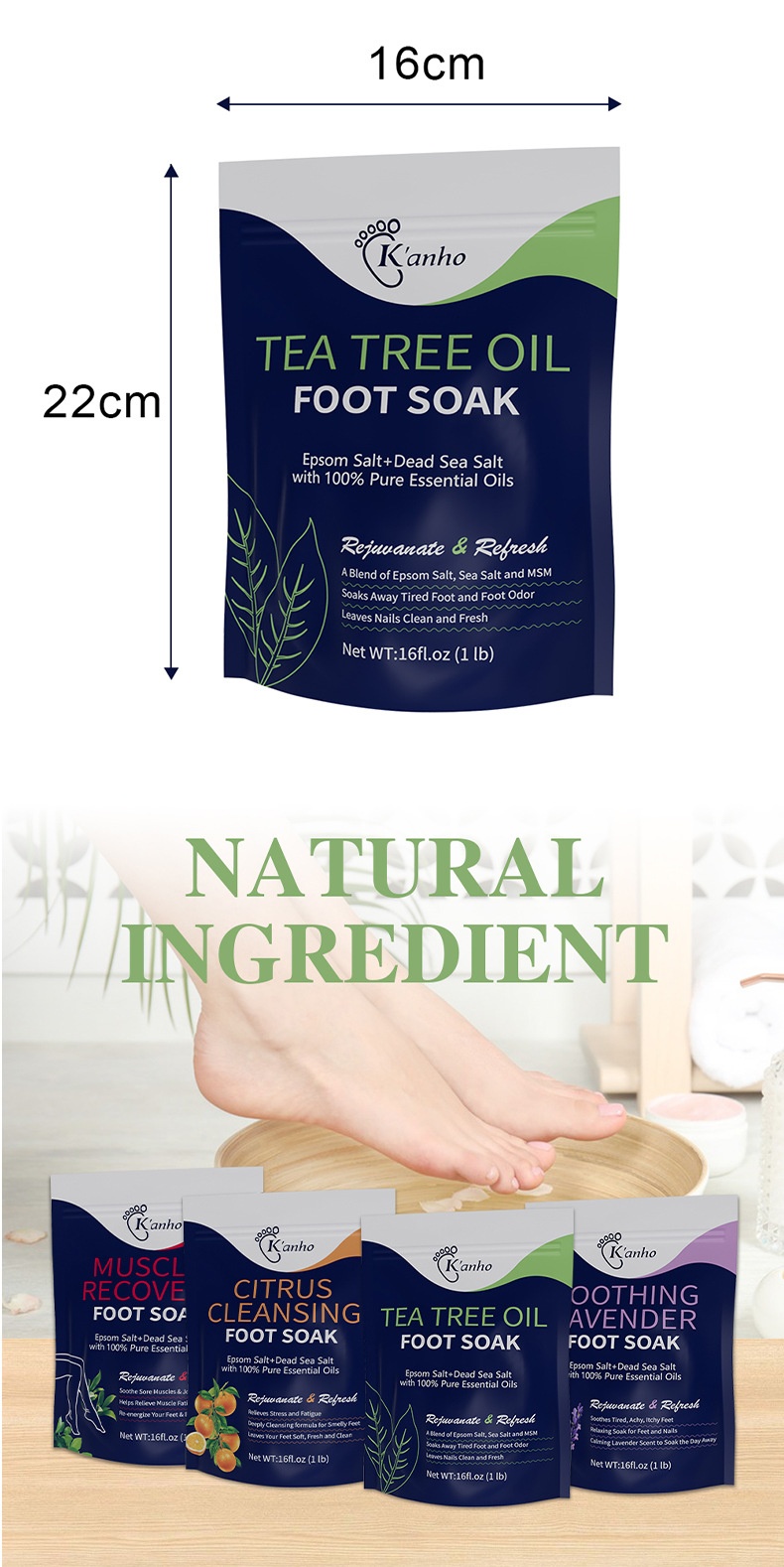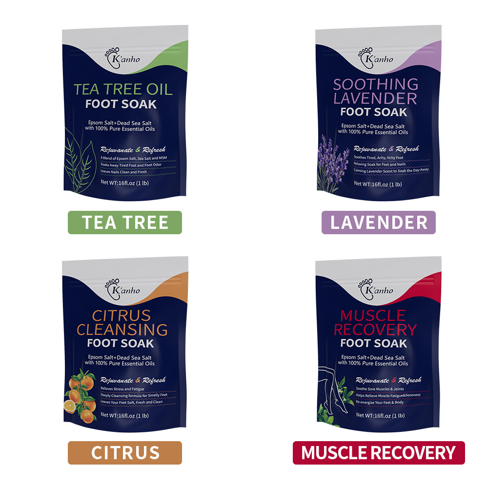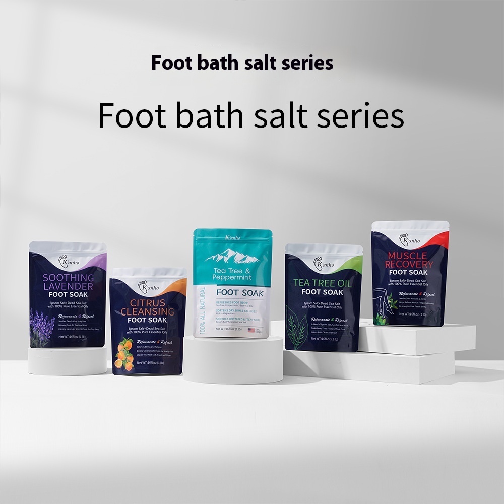Net content: Tea Tree feet bathing salt 16oz(Tea Tree Oil Foot Soak)(for export only), Lavender feet bathing salt 16oz(Lavender Foot Soak)(for export only), citrus feet bathing salt 16oz(Citrus Foot Soak)(for export only), Muscle relaxation feet bathing salt 16oz(Muscle Relief Foot Soak)(for export only), tea tree mint feet bathing salt 16oz(Tea tree and peppermint foot s (for export only)