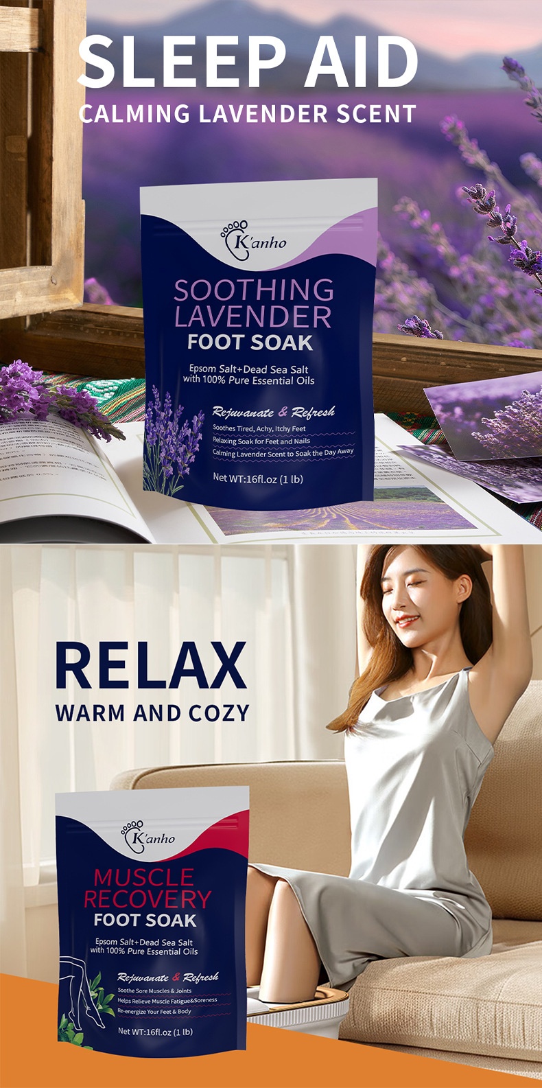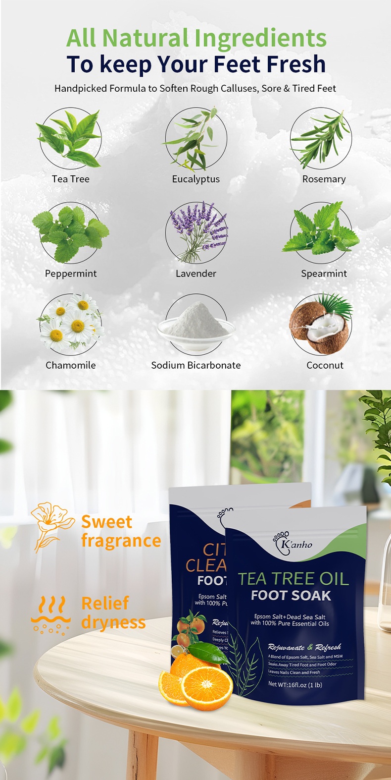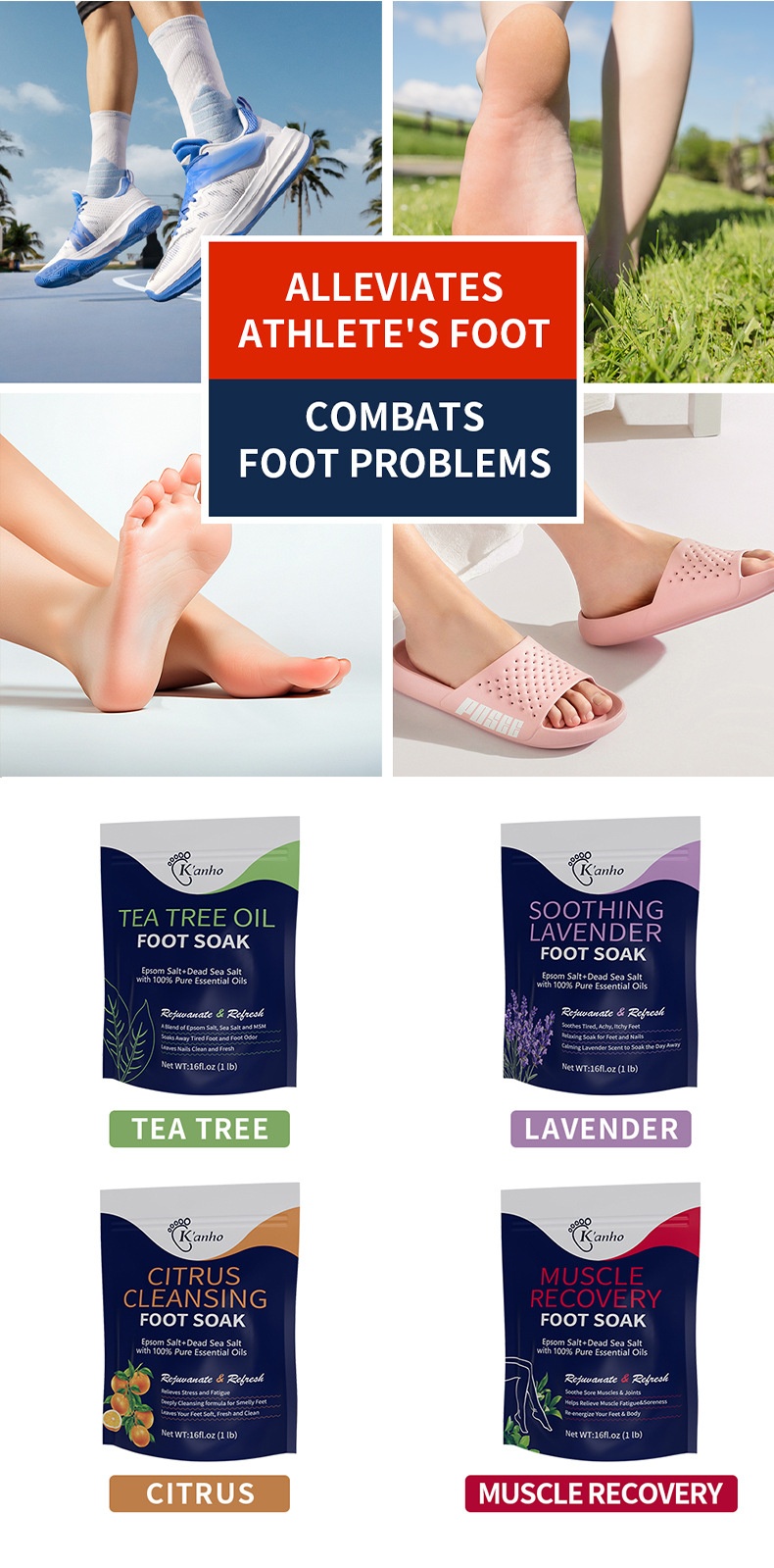 Net content: Tea Tree feet bathing salt 16oz(Tea Tree Oil Foot Soak)(for export only), Lavender feet bathing salt 16oz(Lavender Foot Soak)(for export only), citrus feet bathing salt 16oz(Citrus Foot Soak)(for export only), Muscle relaxation feet bathing salt 16oz(Muscle Relief Foot Soak)(for export only), tea tree mint feet bathing salt 16oz(Tea tree and peppermint foot s (for export only)