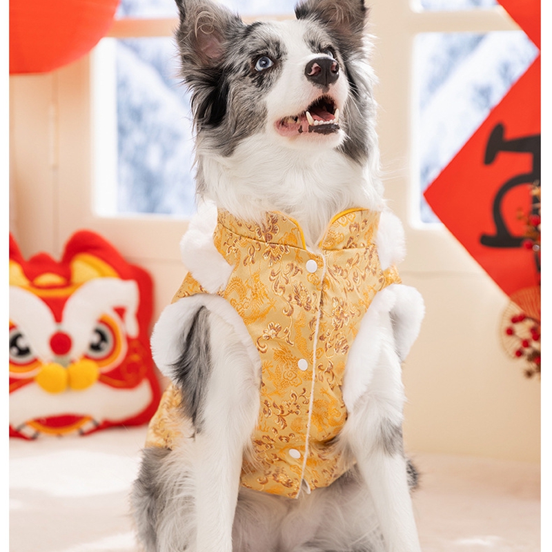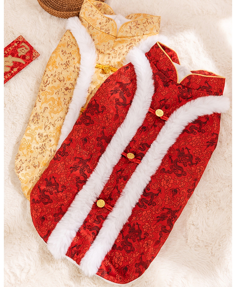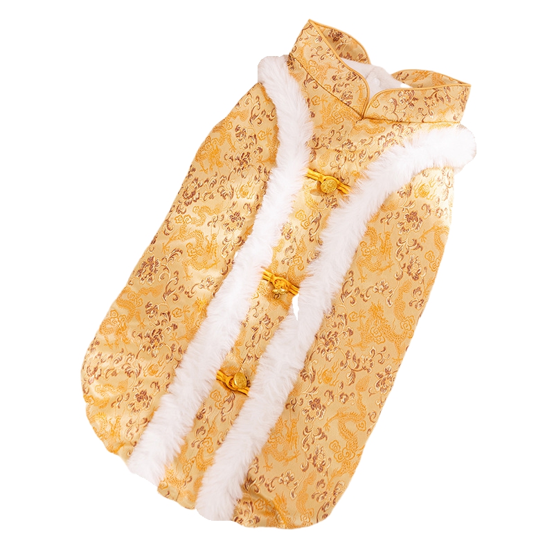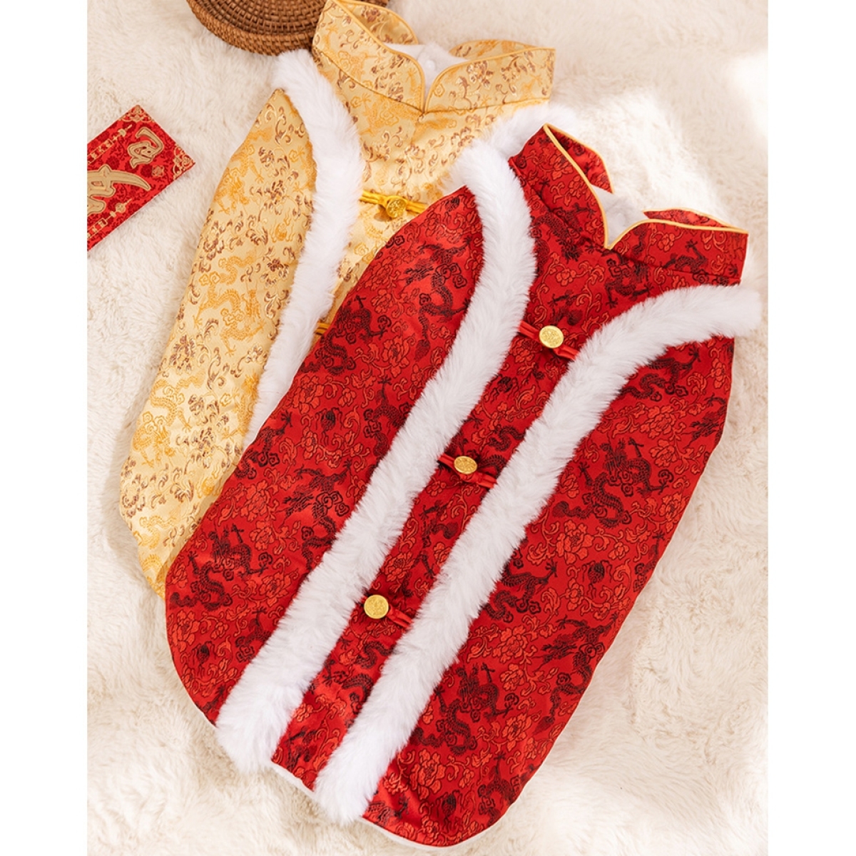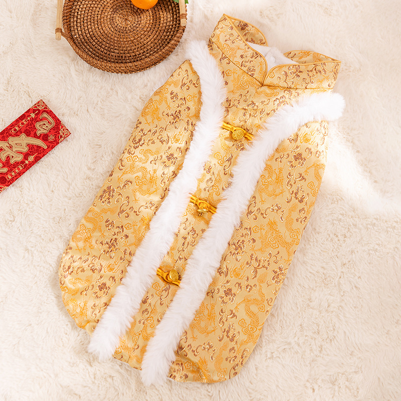 Elevate your pet’s festive look with this Chinese Dragon Brocade Pet Vest! Available in vibrant red (with dragon embroidery) and luxurious gold (with traditional patterns), each vest features intricate brocade fabric, faux fur trim, and classic knot buttons for authentic cultural charm. Perfect for Lunar New Year celebrations, this vest combines warmth, elegance, and traditional Chinese design, making your furry companion the center of holiday gatherings. Ideal for pet parents seeking to infuse Lunar New Year traditions into their pet’s wardrobe, this vest offers a blend of heritage, style, and comfort.