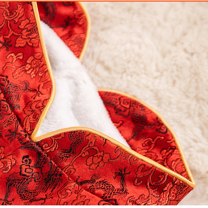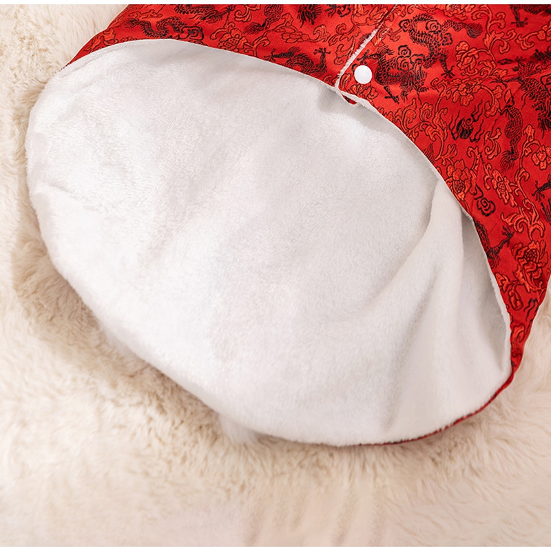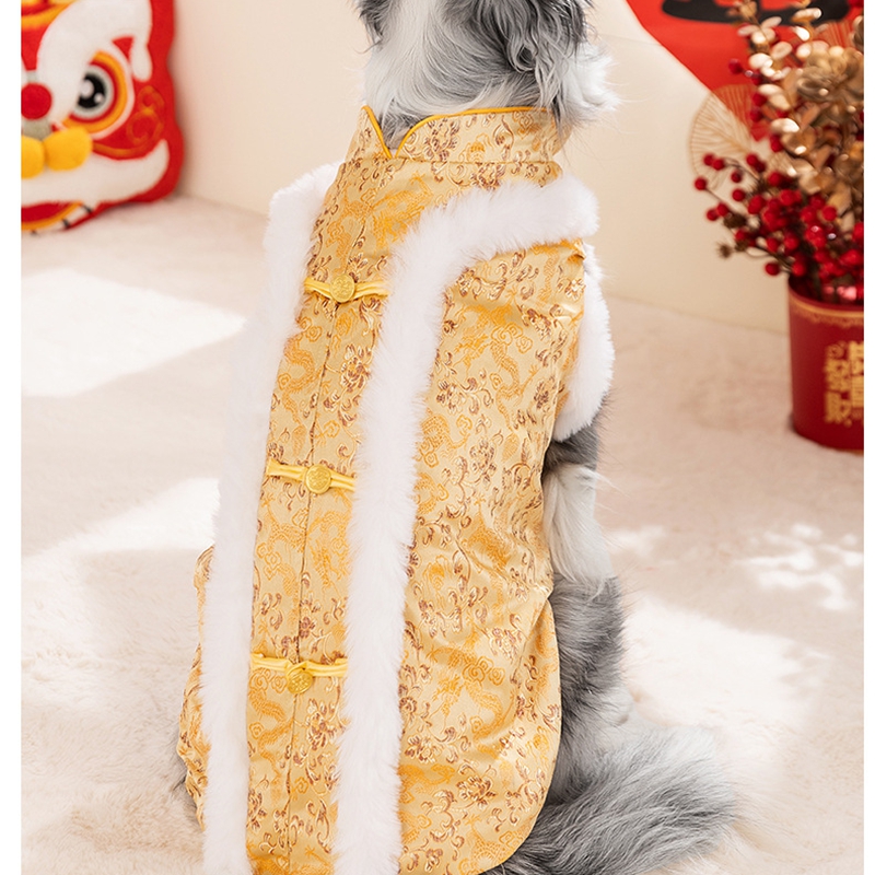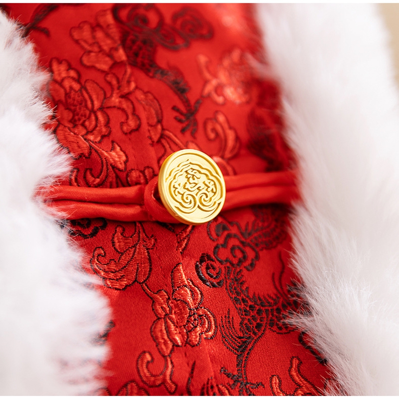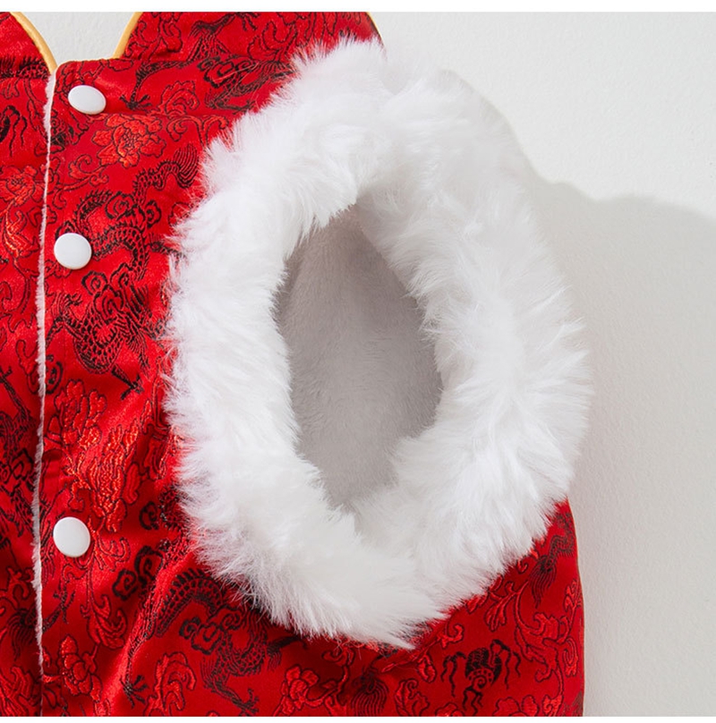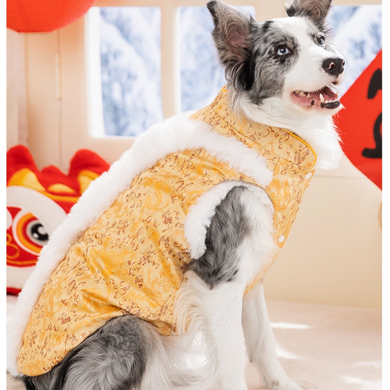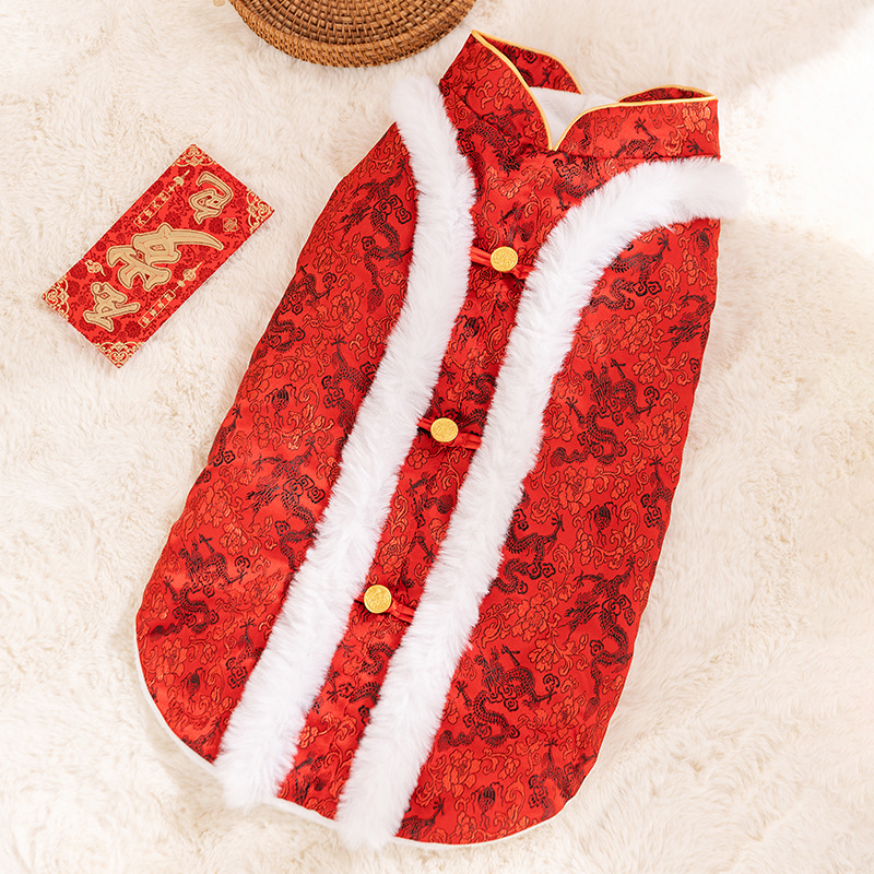 Elevate your pet’s festive look with this Chinese Dragon Brocade Pet Vest! Available in vibrant red (with dragon embroidery) and luxurious gold (with traditional patterns), each vest features intricate brocade fabric, faux fur trim, and classic knot buttons for authentic cultural charm. Perfect for Lunar New Year celebrations, this vest combines warmth, elegance, and traditional Chinese design, making your furry companion the center of holiday gatherings. Ideal for pet parents seeking to infuse Lunar New Year traditions into their pet’s wardrobe, this vest offers a blend of heritage, style, and comfort.