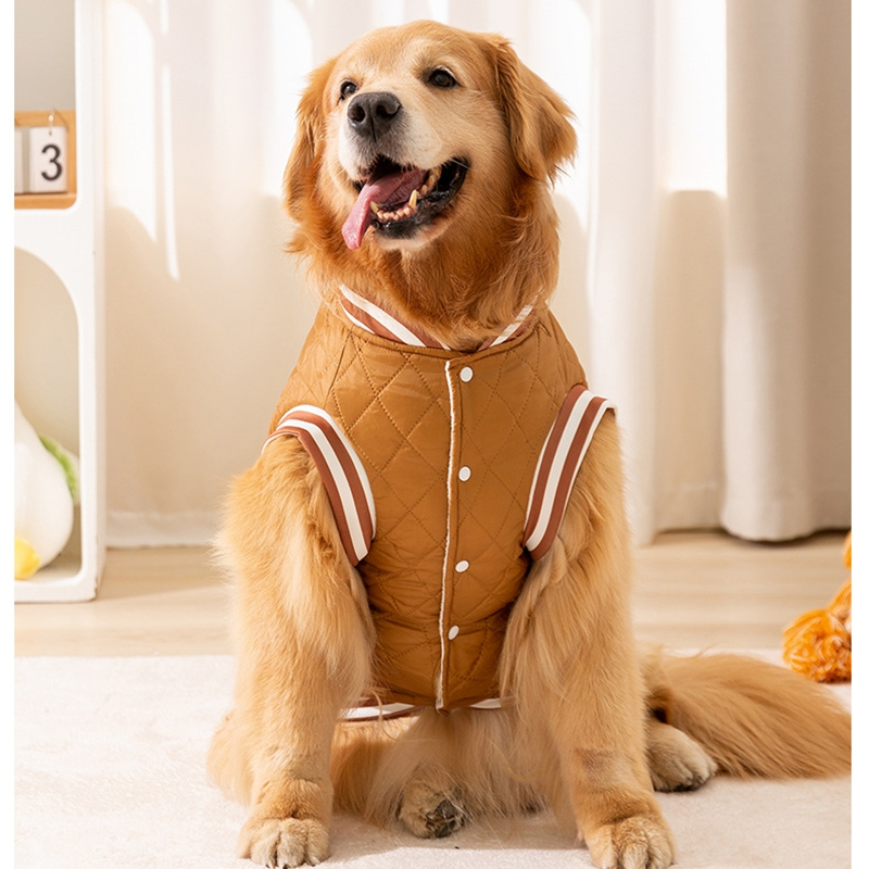 Keep your large dog cozy and stylish with this "Lucky Dog" Quilted Pet Vest! Designed for big breeds like Golden Retrievers, this brown quilted jacket features a playful "Lucky Dog" cartoon embroidery, the slogan "THE ONE AND ONLY," and an integrated leash ring. The quilted construction ensures warmth during cooler days, while the relaxed fit allows full mobility. Perfect for winter walks, indoor lounging, or casual outings, this vest combines functional warmth, fun design, and a tailored fit for large furry companions, making it a must-have for pet parents who want their big dogs to stay snug and fashion-forward.