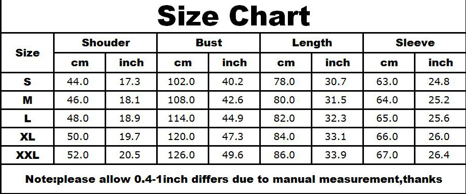 1. Asian sizes are 1 to 2 sizes smaller than European and American people. Choose the larger size if your size between two sizes. Please allow 2-3cm differences due to manual measurement. 2. Please check the size chart carefully before you buy the item, if you don't know how to choose size, please contact our customer service. 3.As you know, the different computers display colors differently, the color of the actual item may vary slightly from the following images.