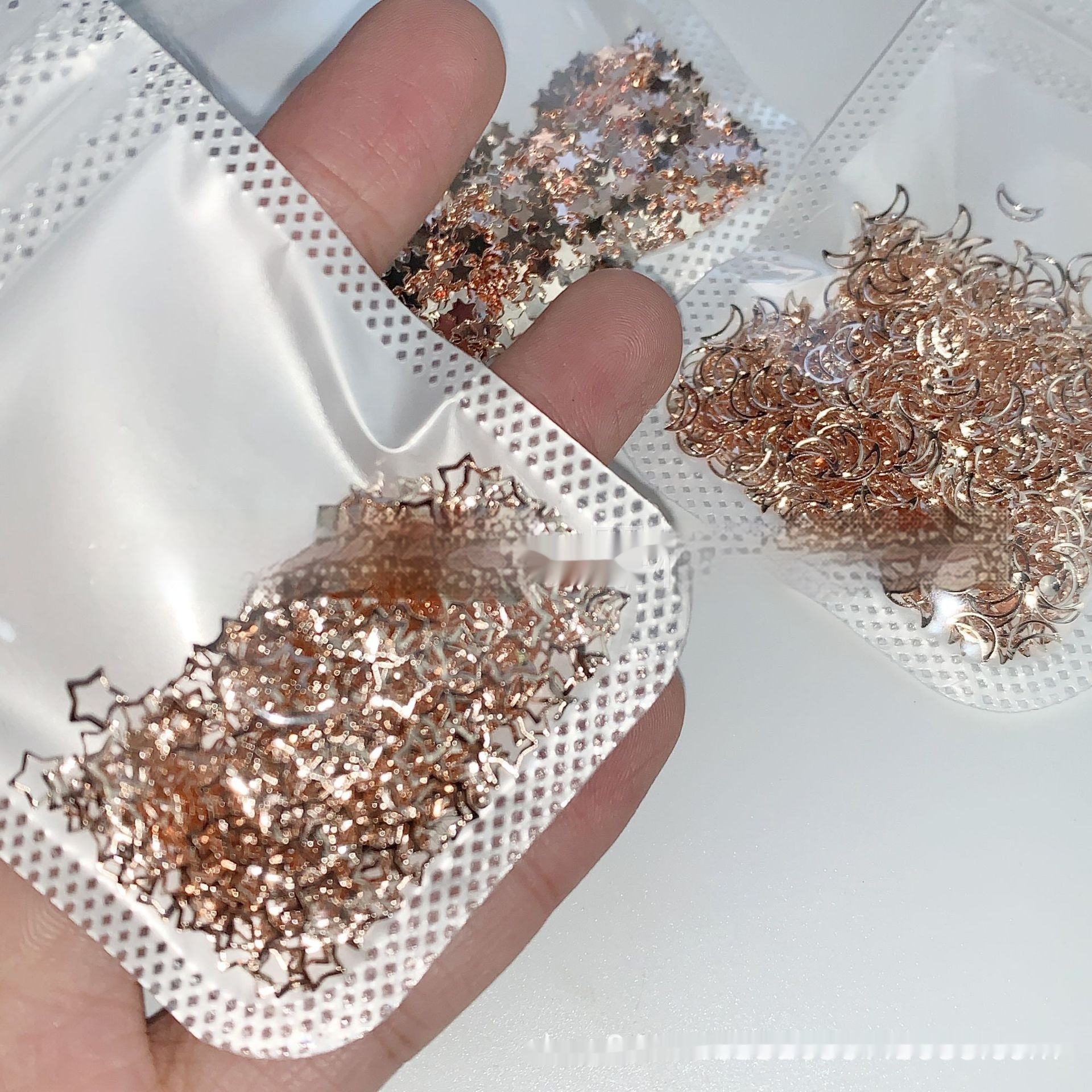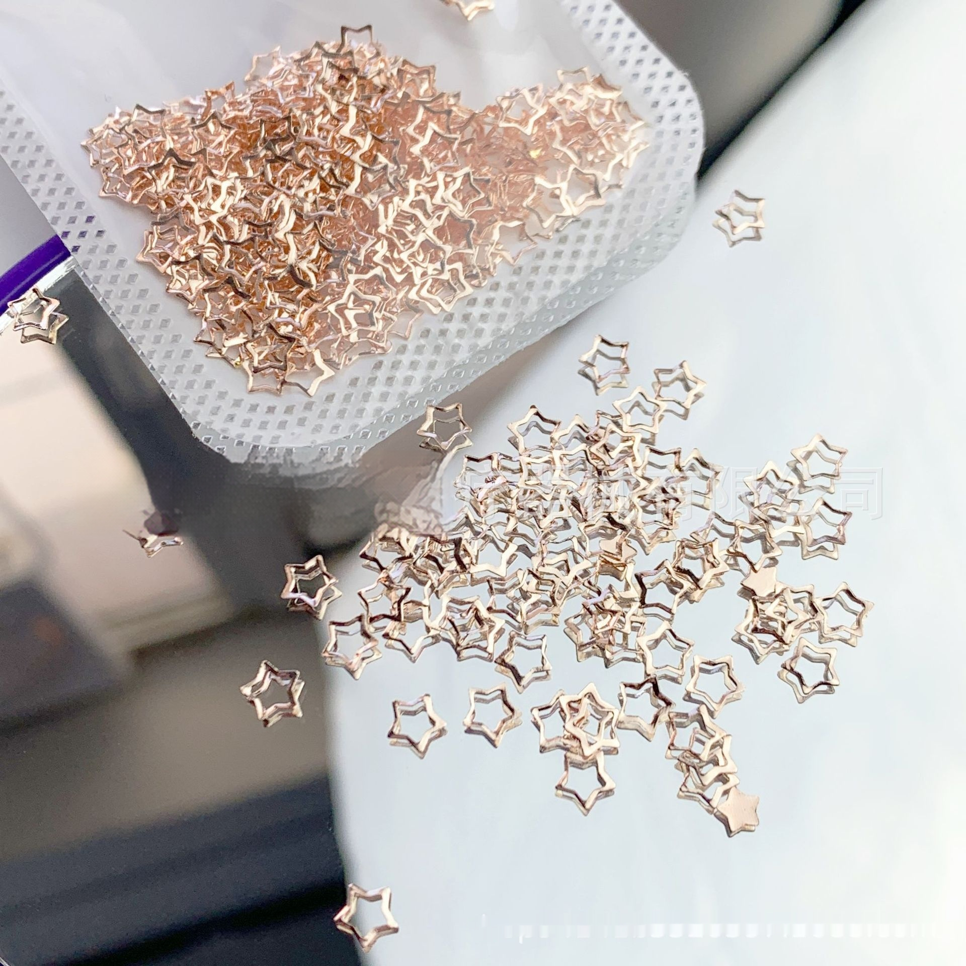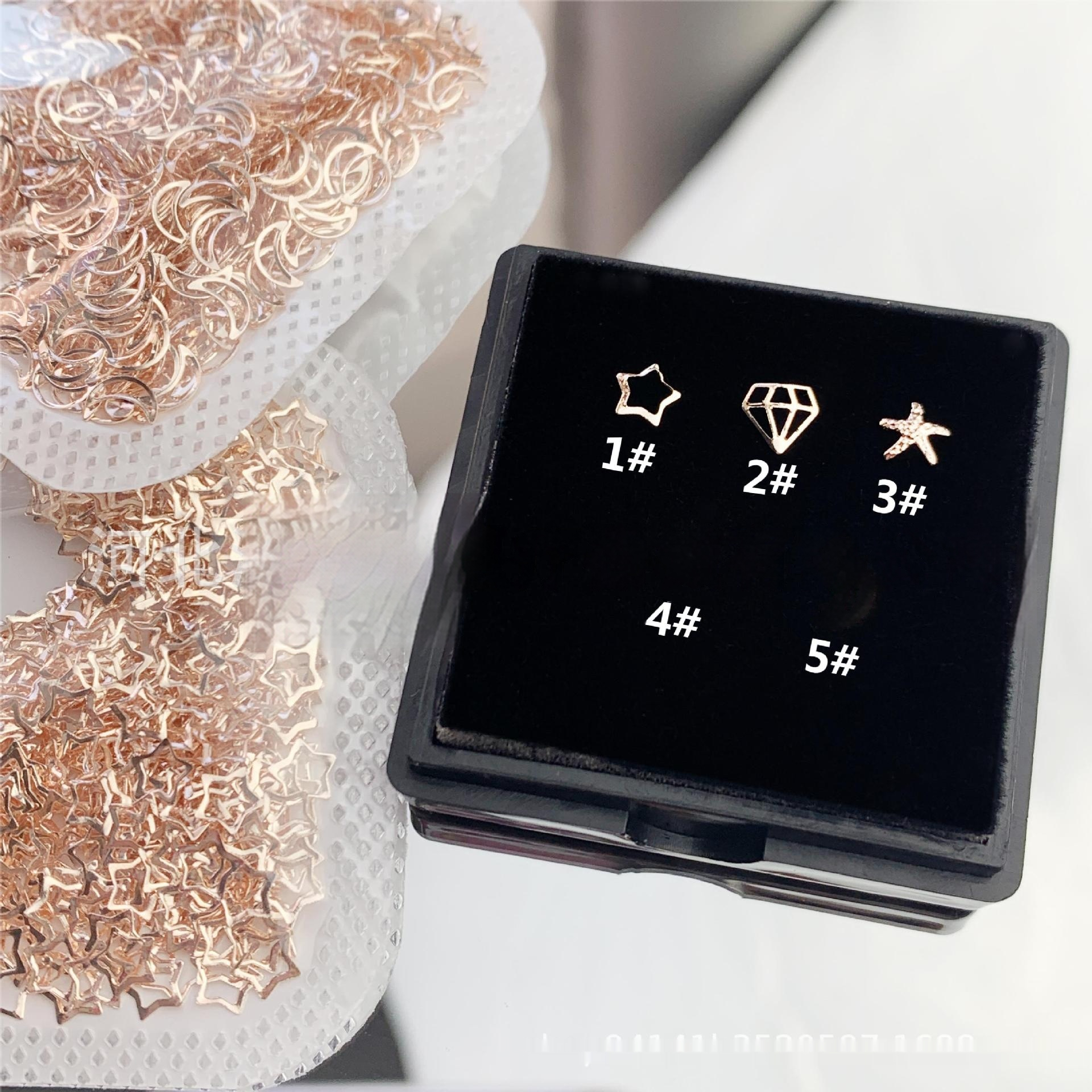 Color classification: 1# rose gold 5mm hollow XINGX 3/Can, 2# rose gold 5mm Diamond 3/Can, 3# rose gold 5mm starfish 3/can, 4# rose gold 3mm XINGX 3 pcs/Can,5# Rose Gold 3 * 5mm Hollow Moon 3 pcs/Can,6# heart of gold 1 3mm 3 pcs/can,7# Golden love 2 4*3 mm3/Can, 8# Golden Love 3 4*4 mm3/Can, 9# Golden Love 4 4*4 mm3/can, 10# Golden Love 5 5*3.5 mm3/Can, 11# Golden Diamond 5 mm3/Can, 12# Golden 3 * 3mm small starfish 3/can, 13# gold 3 * 3mm five-pointed star 3/Can, 14# gold 4 * 4mm five-pointed star 3/Can, 15# gold 5 * 5mm five-pointed star 3/can, 16# silver 3 * 3mm five-pointed star 3/Can, 17# Silver 4 * 4mm five-pointed star 3/Can, 18# Silver 4 * 5mm five-pointed star 3/can, 19# silver 5 * 5mm five-pointed star 3/Can, 20# gold 3 * 3mm Moon 3/Can, 21# gold 3 * 3mm triangle 3/can, 22# gold 4 * 4mm triangle 3/Can, 23# gold 5mm Love 3/Can, 24# Silver 5mm Love 3/Can