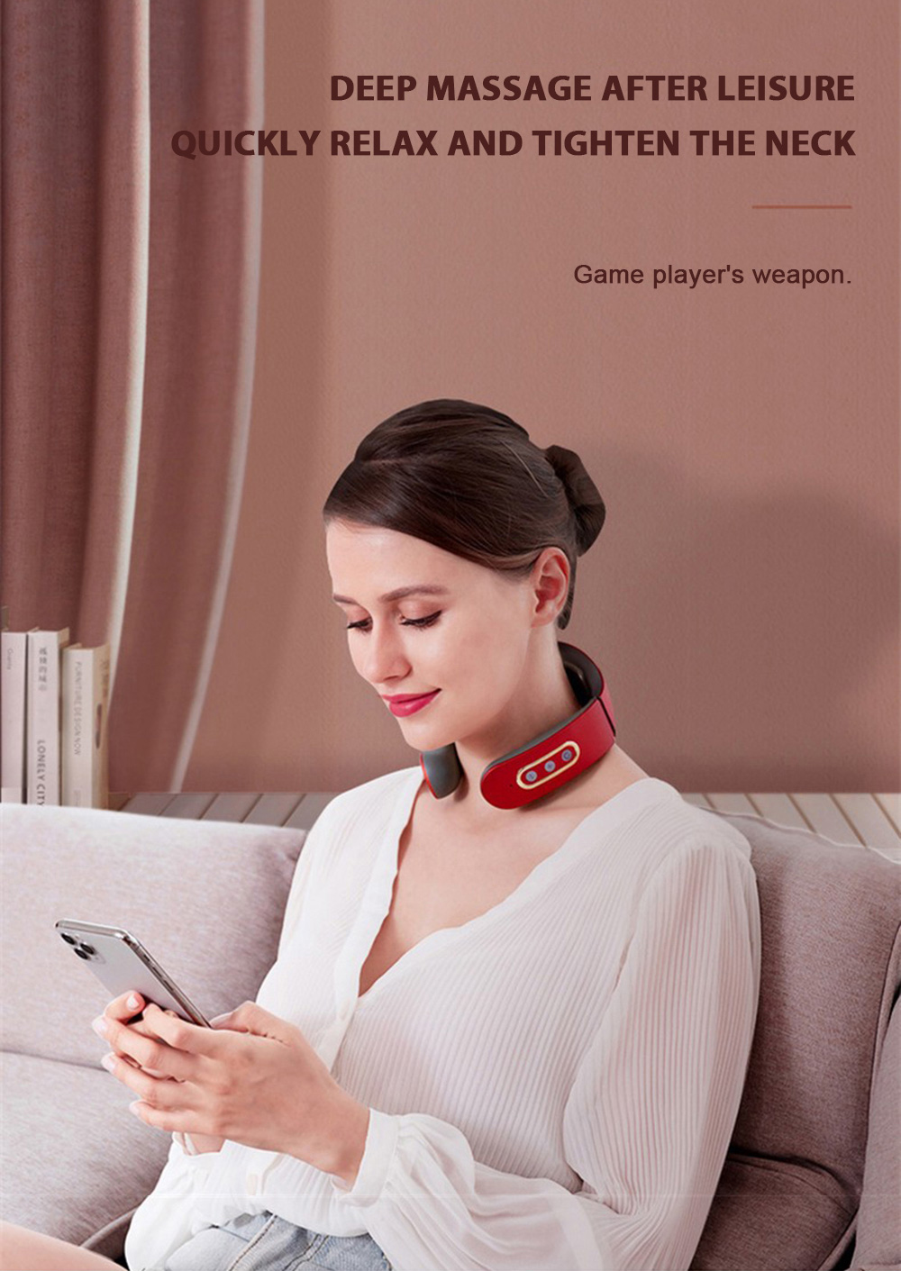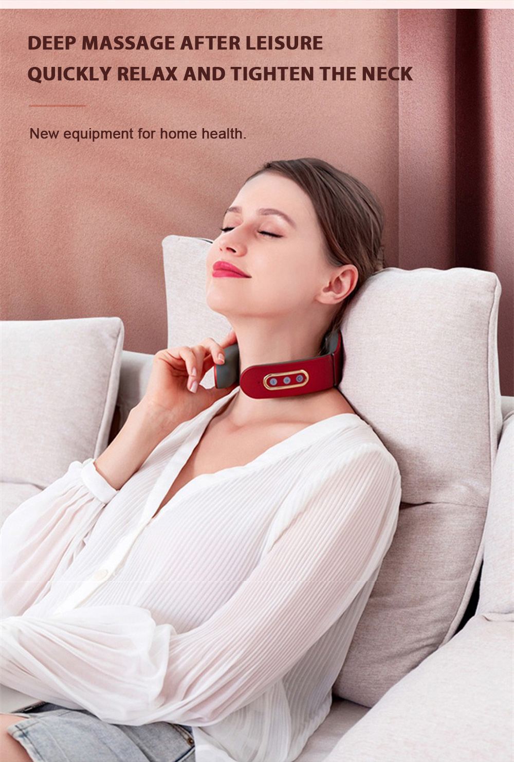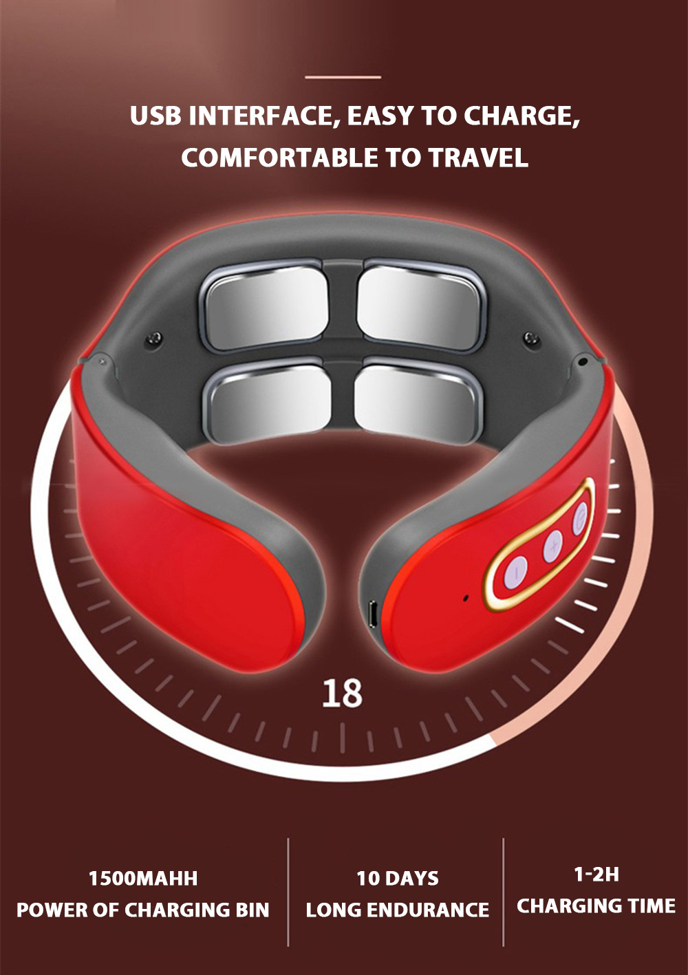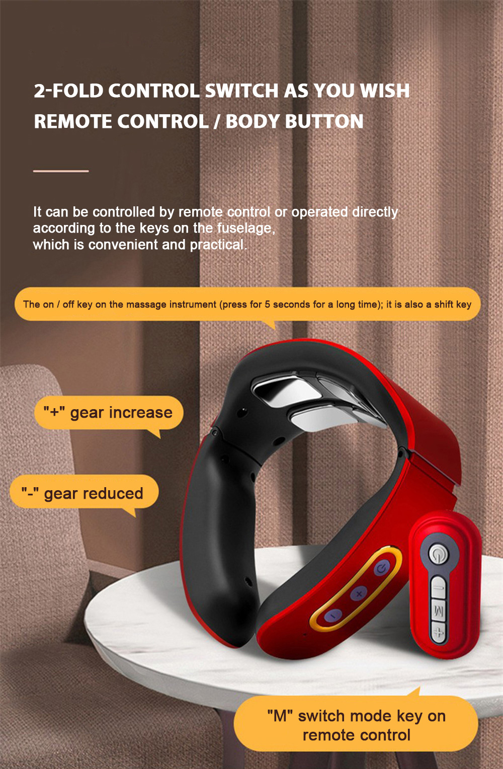 1) Before use, first wet the skin of the cervical spine with a wet towel, and then put the product around the neck, make the electrode close to the skin of the cervical spine, adjust the position of the product, turn on the host and adjust the appropriate massage intensity and mode.