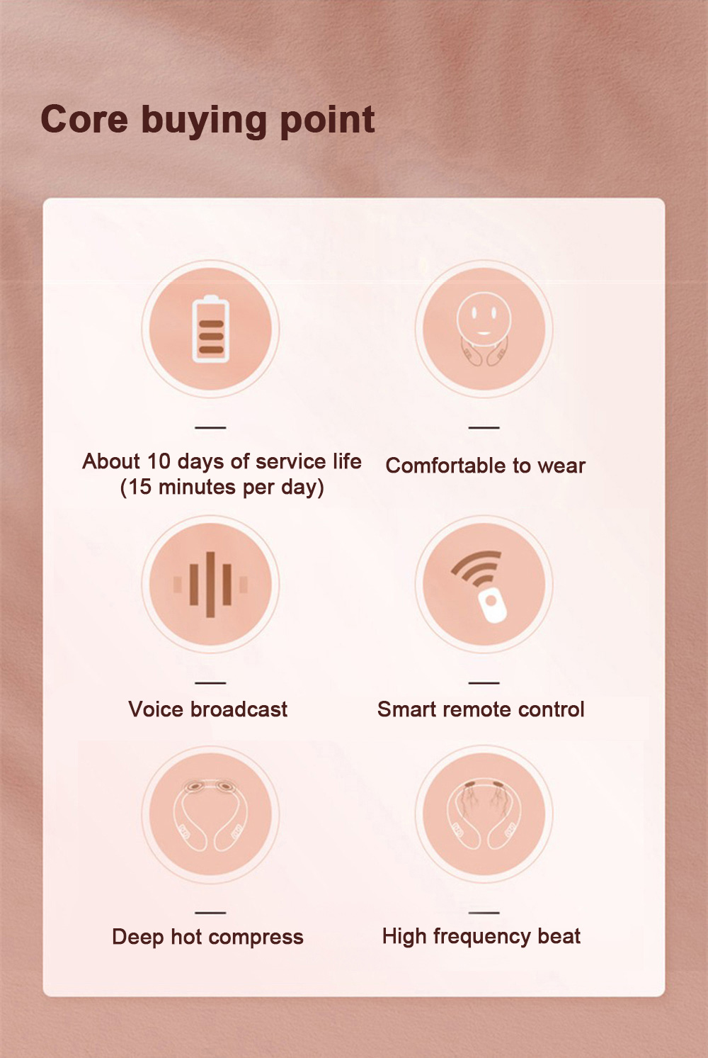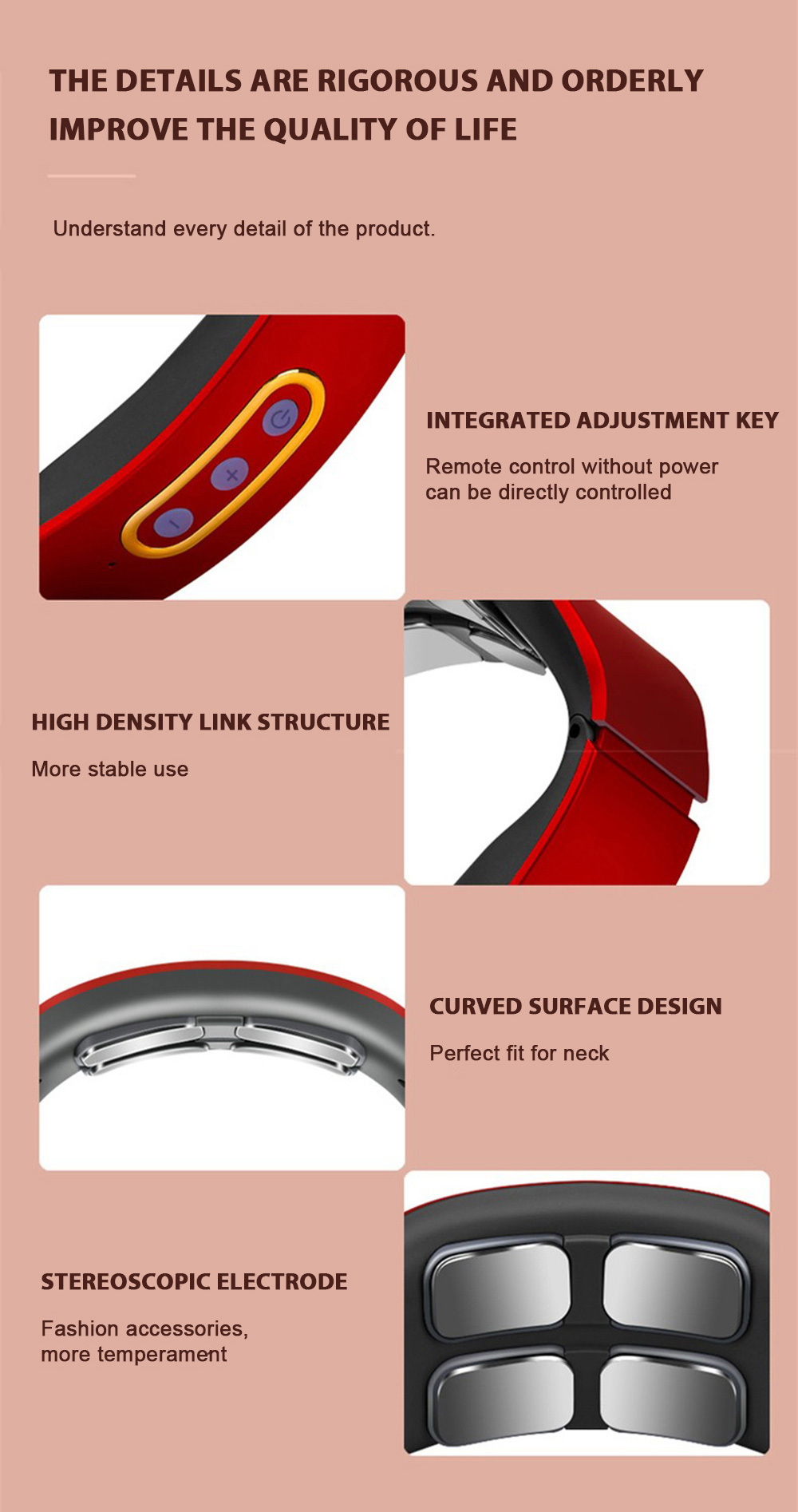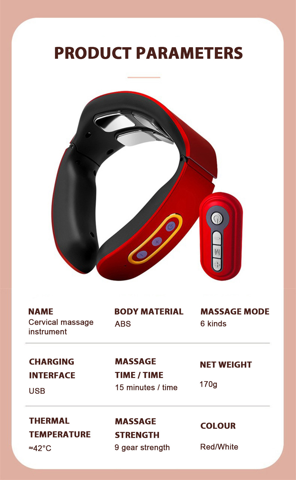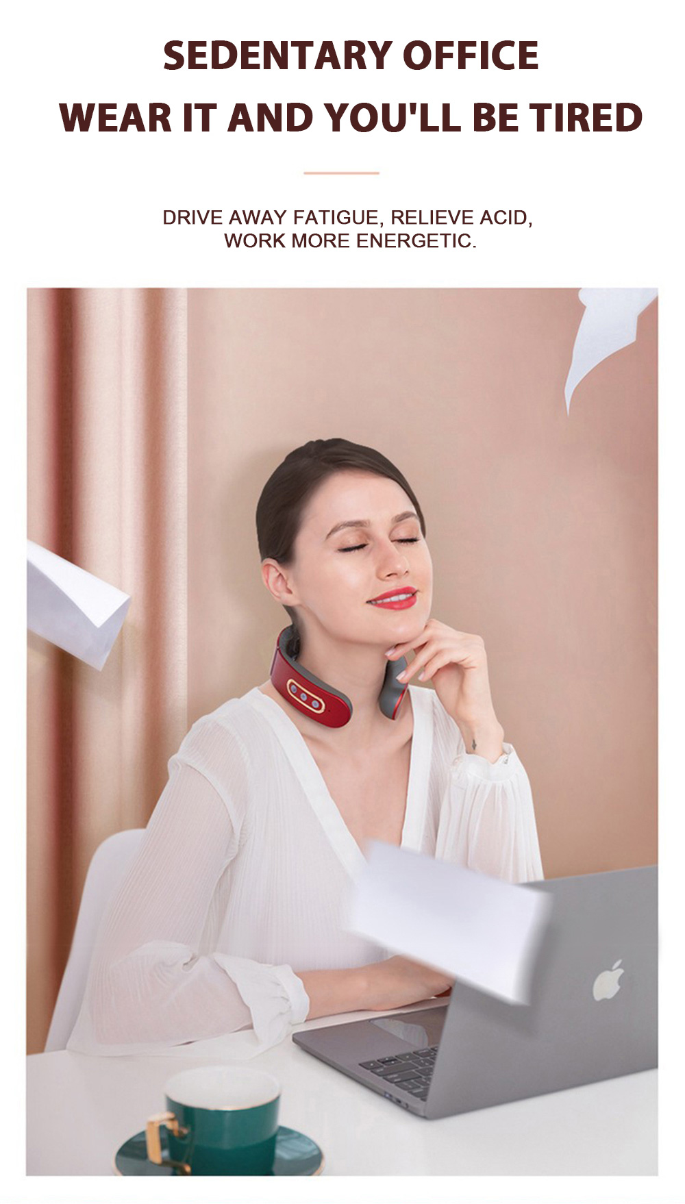 1) Before use, first wet the skin of the cervical spine with a wet towel, and then put the product around the neck, make the electrode close to the skin of the cervical spine, adjust the position of the product, turn on the host and adjust the appropriate massage intensity and mode.